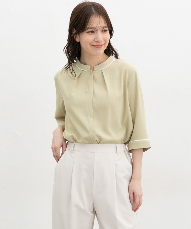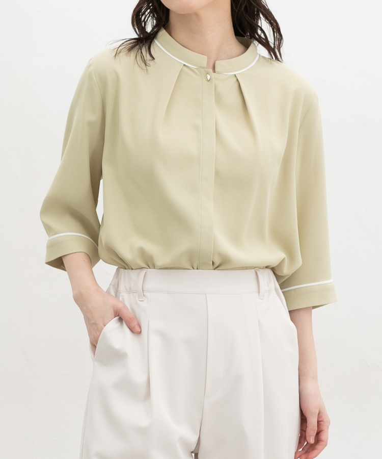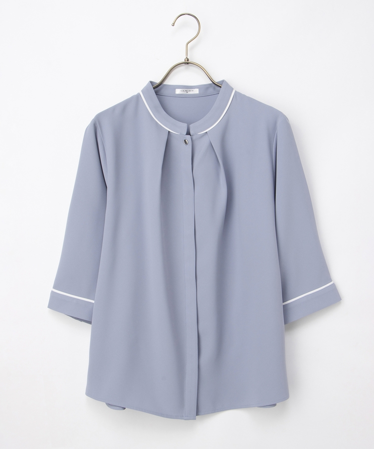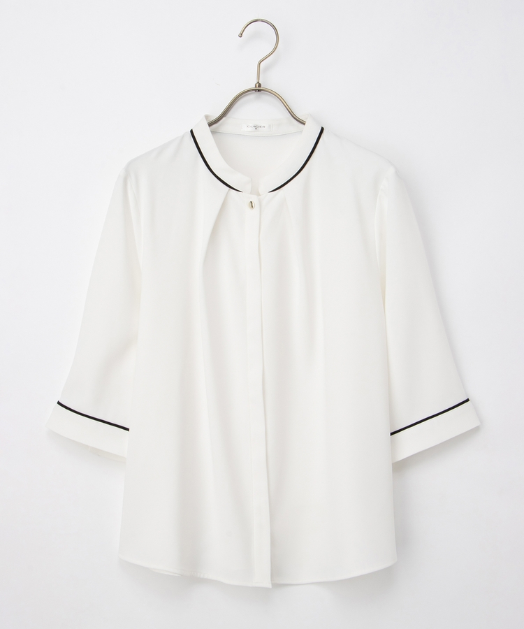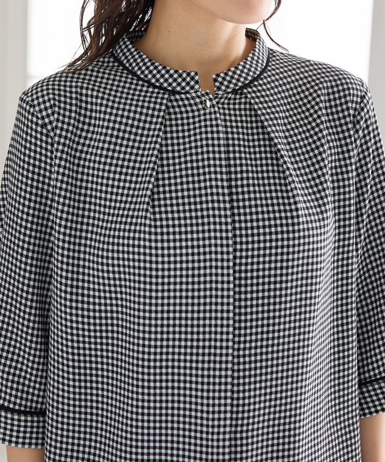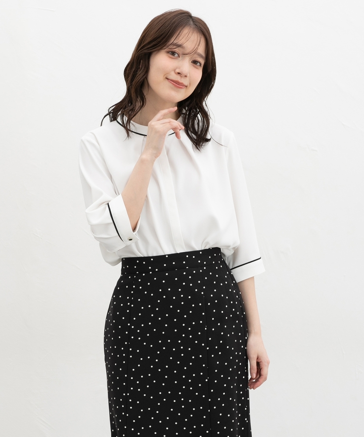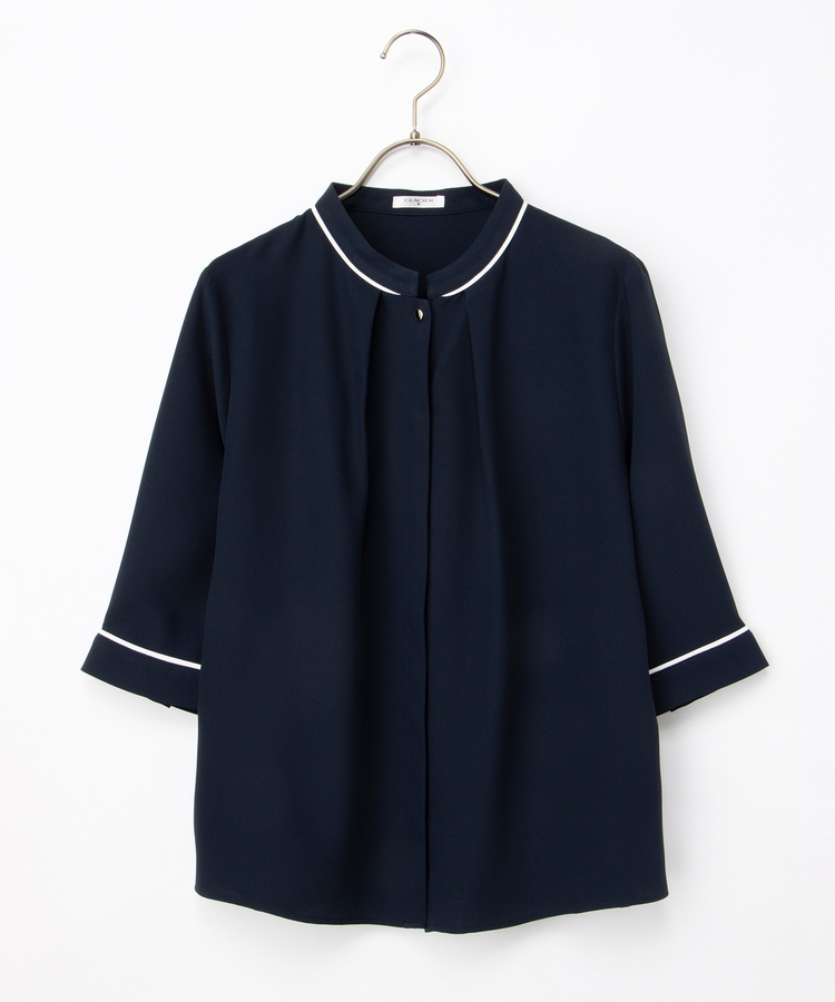 衿ぐり&袖口の配色パイピングと衿元のゴールドボタンが、さりげないアクセントになるシンプルデザイン。