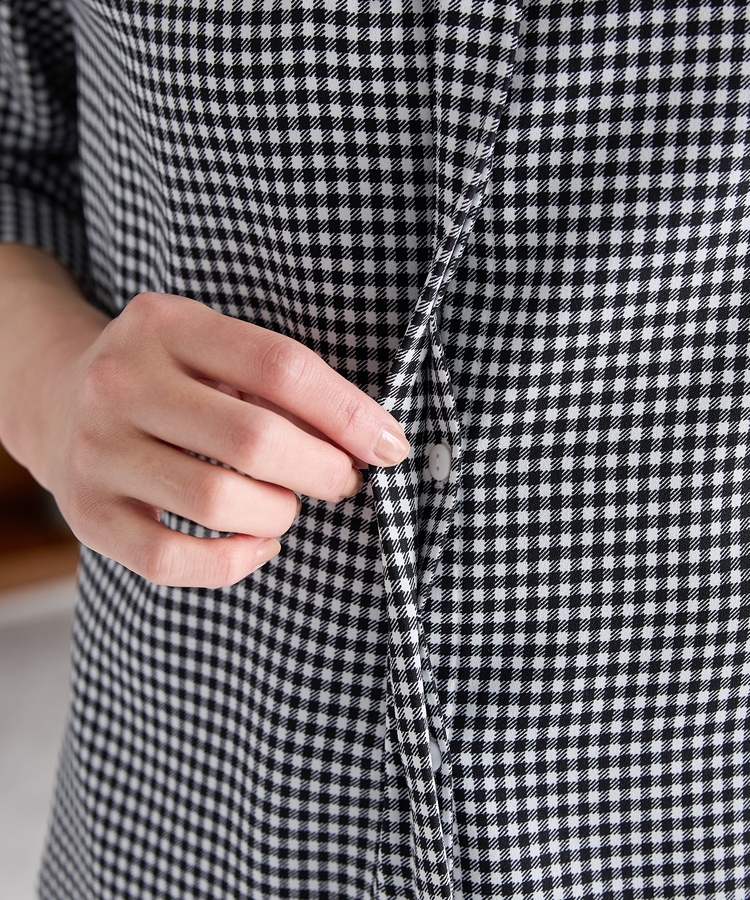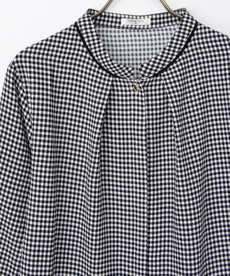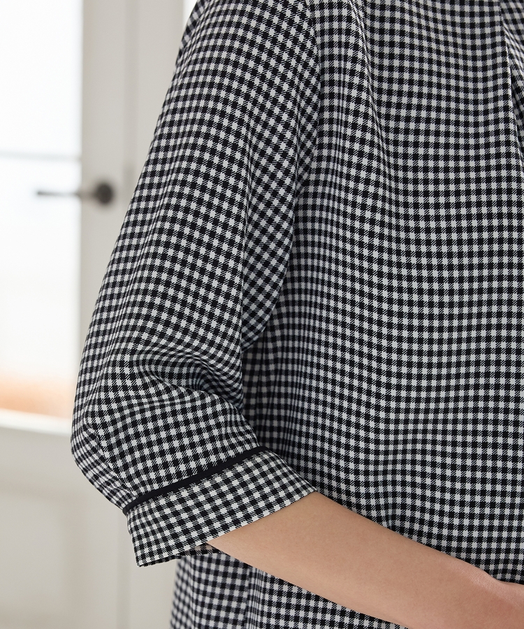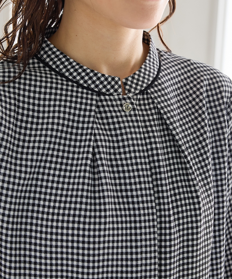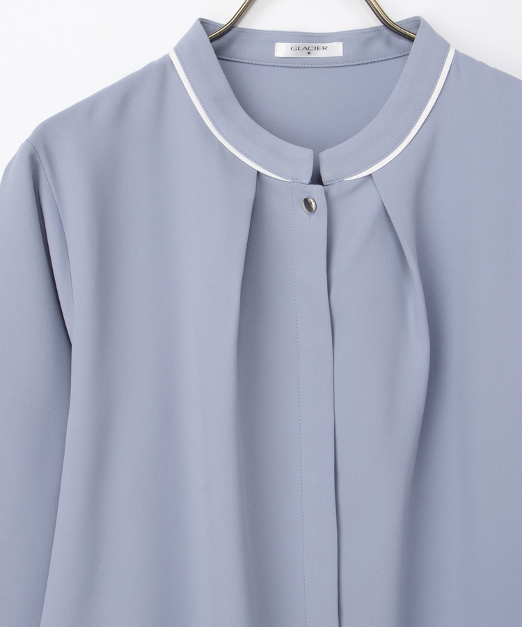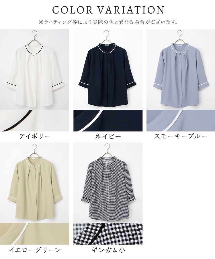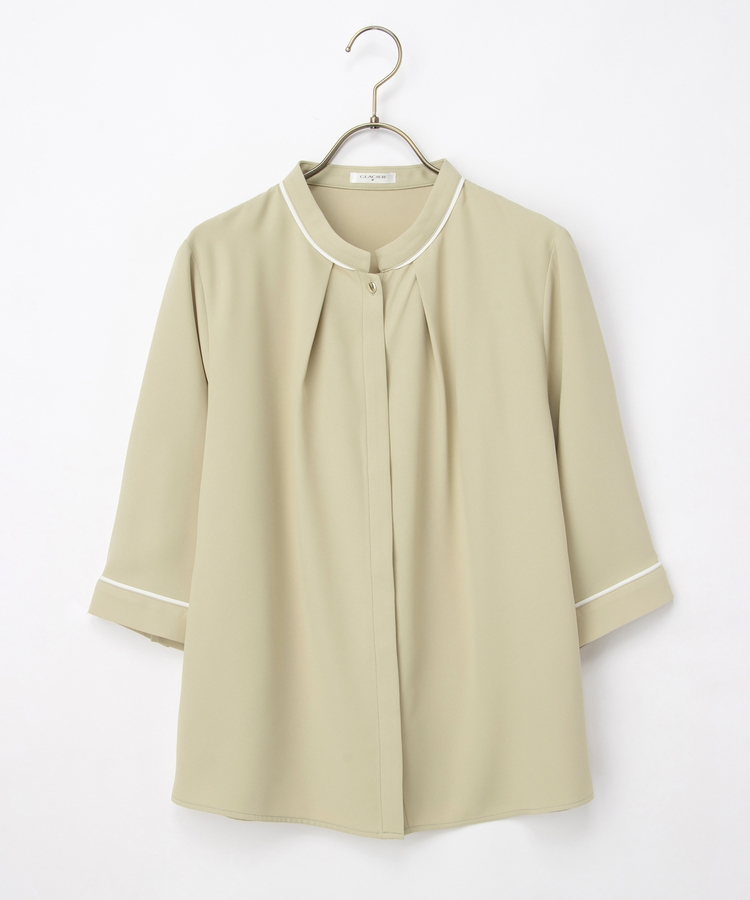 衿ぐり&袖口の配色パイピングと衿元のゴールドボタンが、さりげないアクセントになるシンプルデザイン。