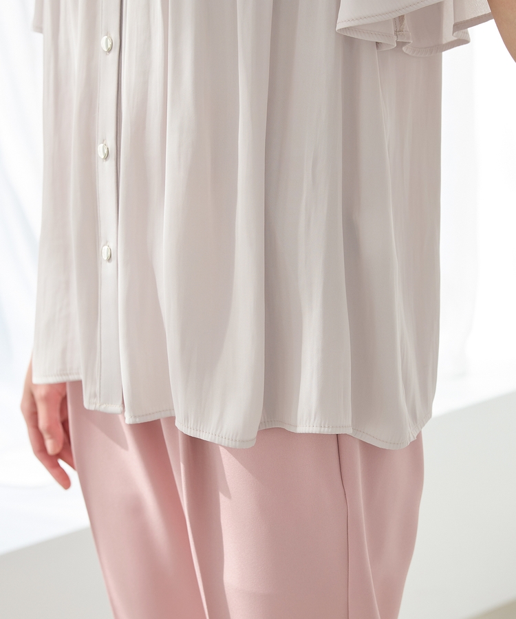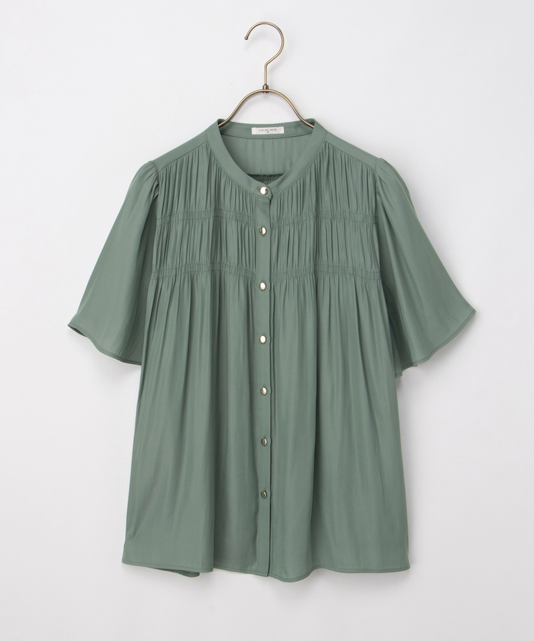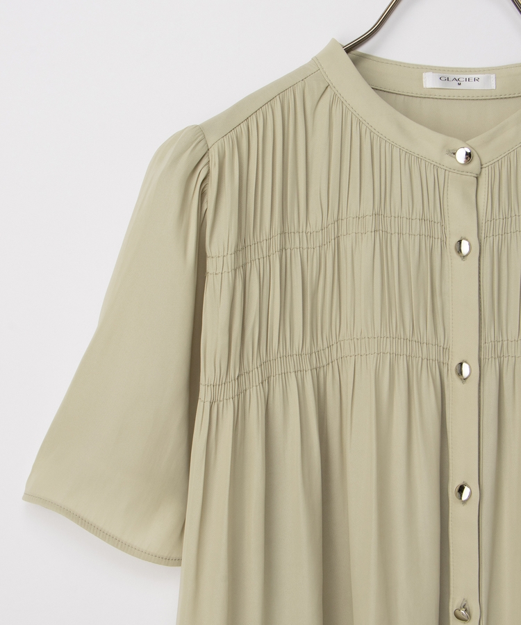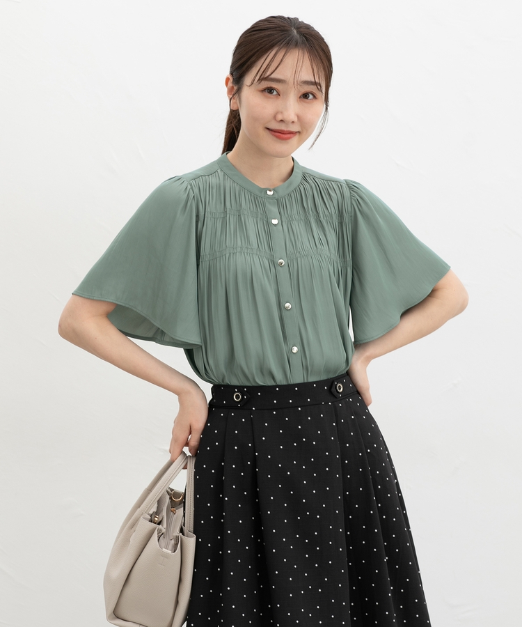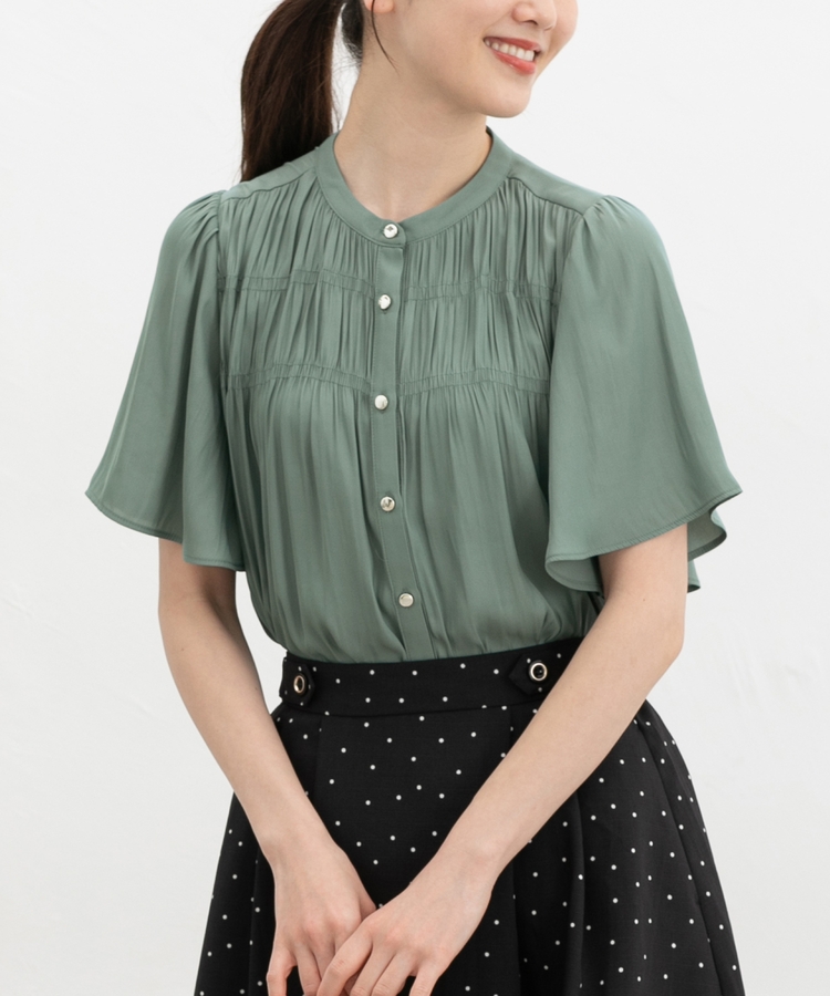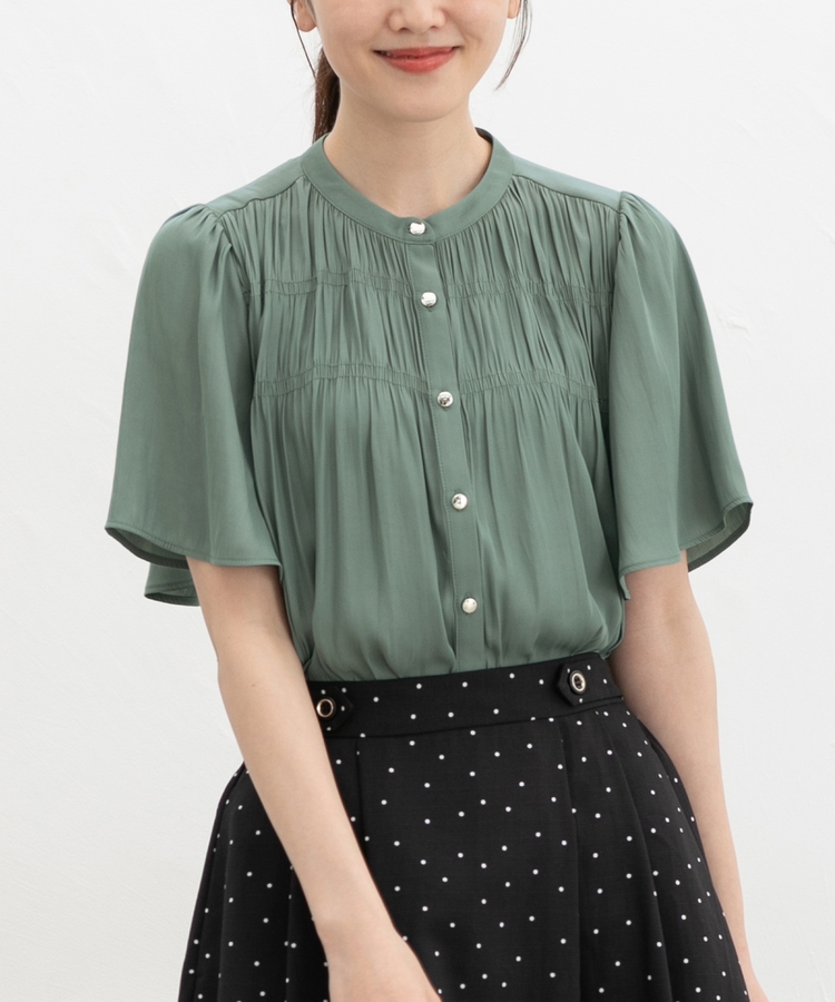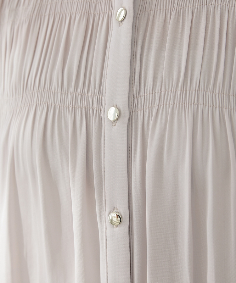 胸元シャーリングとゴールドボタンで、1枚でスタイリングがぐっと華やかに着映えるデザイン。