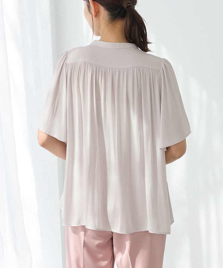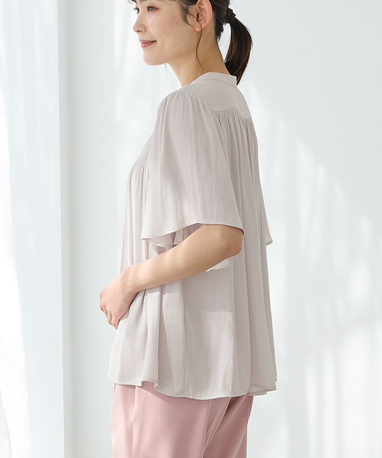 肩とバックは細かなギャザー入りで、柔らかなドレープのふわっと広がる美しいシルエットと長めのフレア袖で体型も二の腕もカバー。