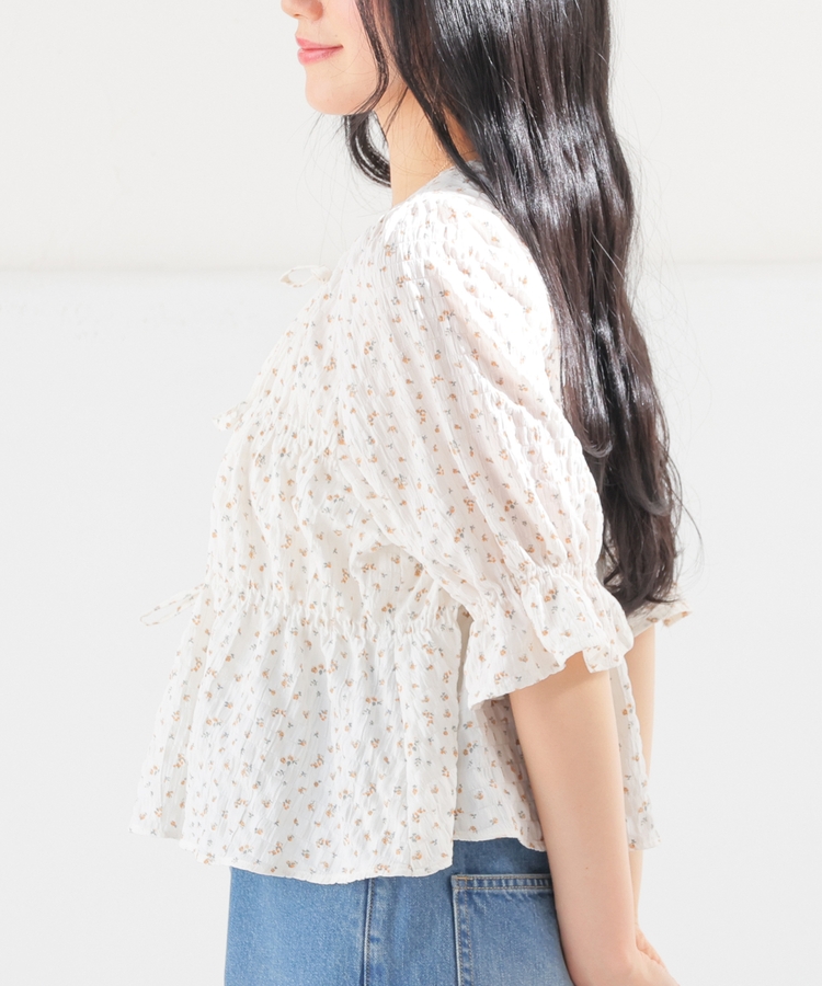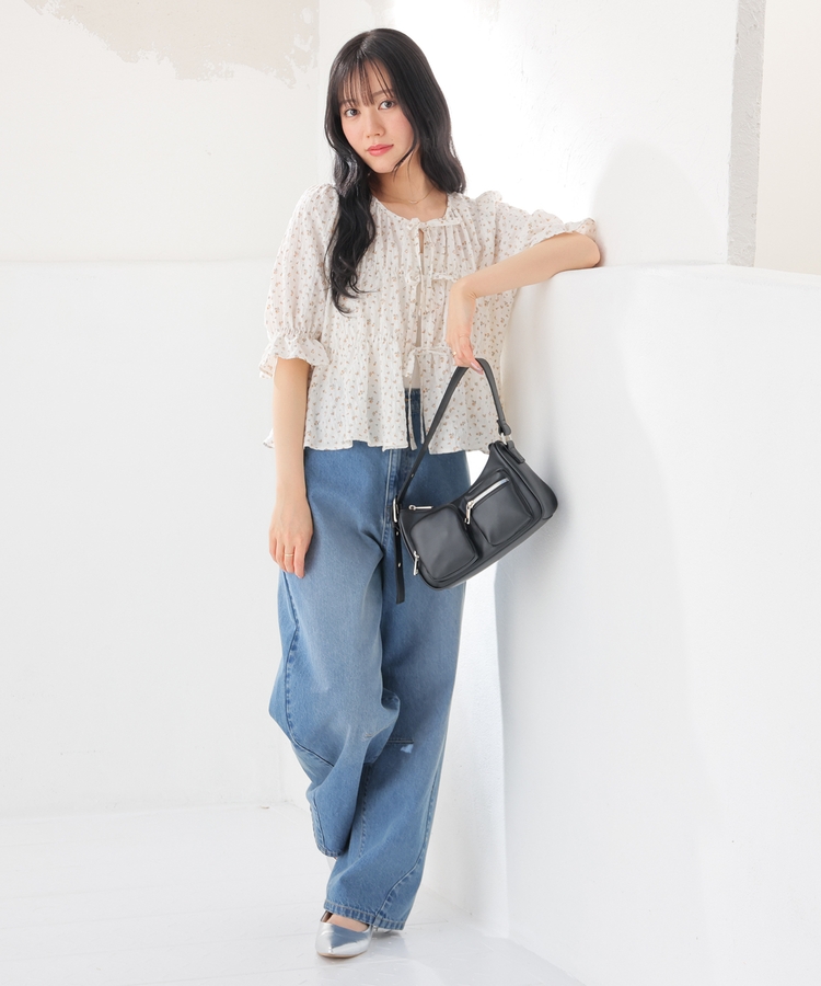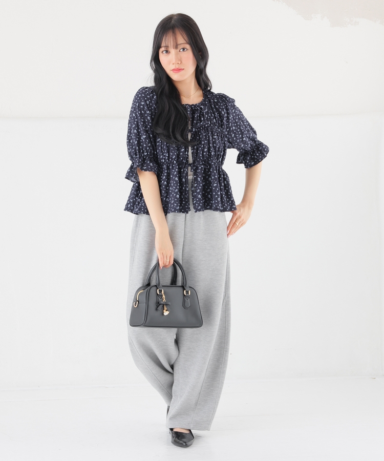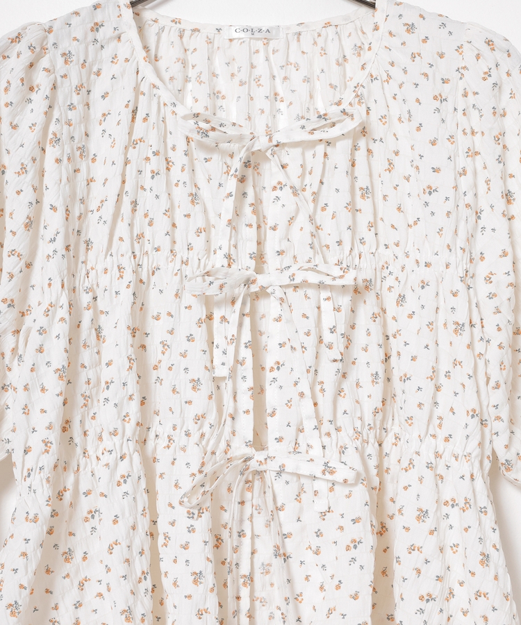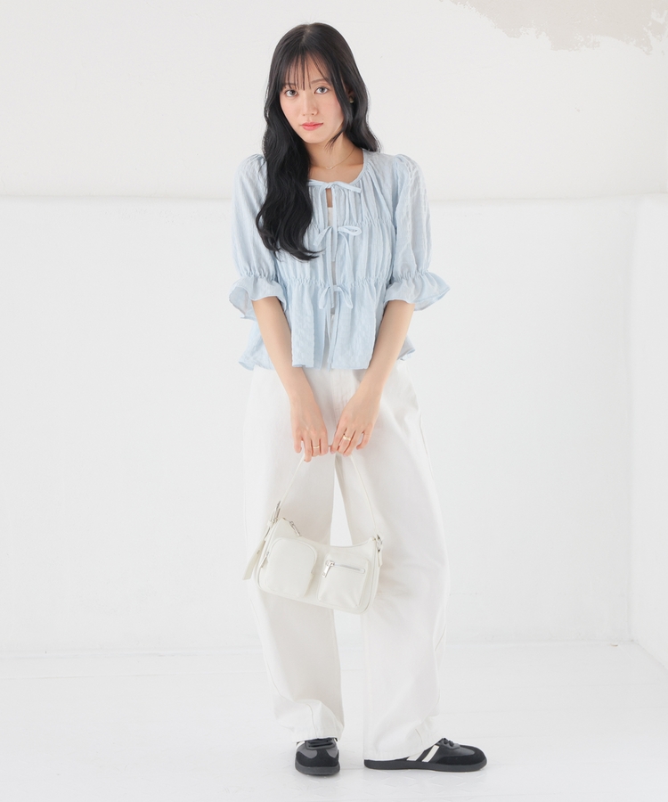 くしゅっとしたシャーリングとフロントのリボンがフェミニンなデザイン。