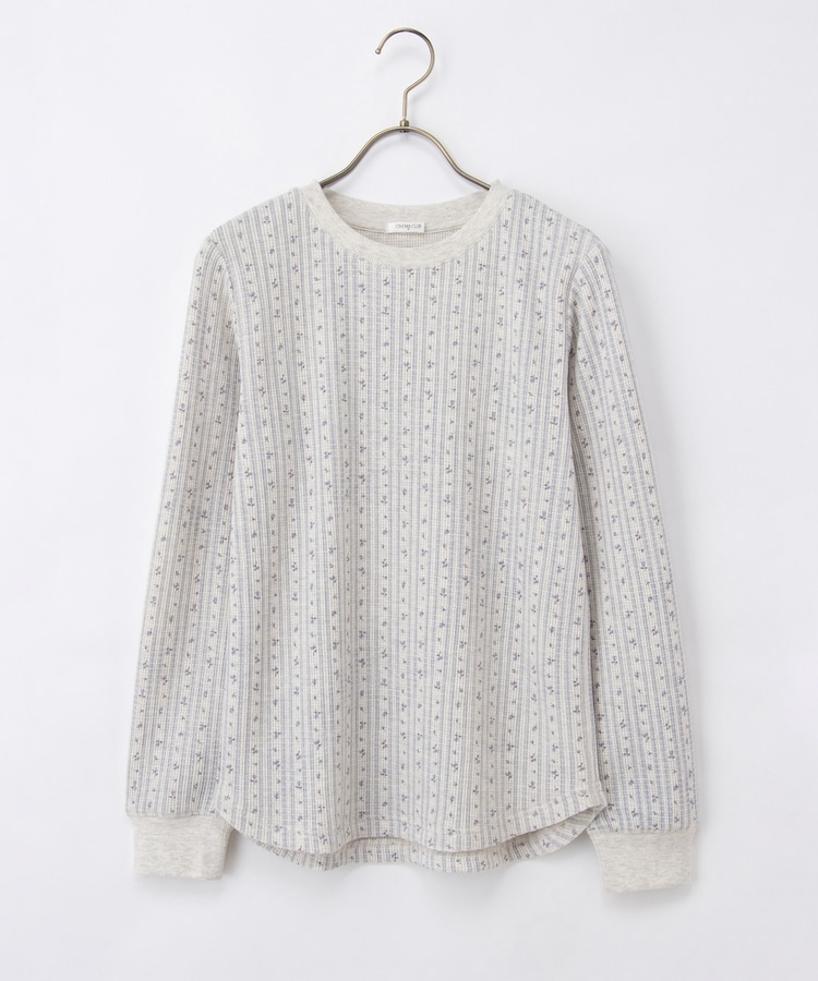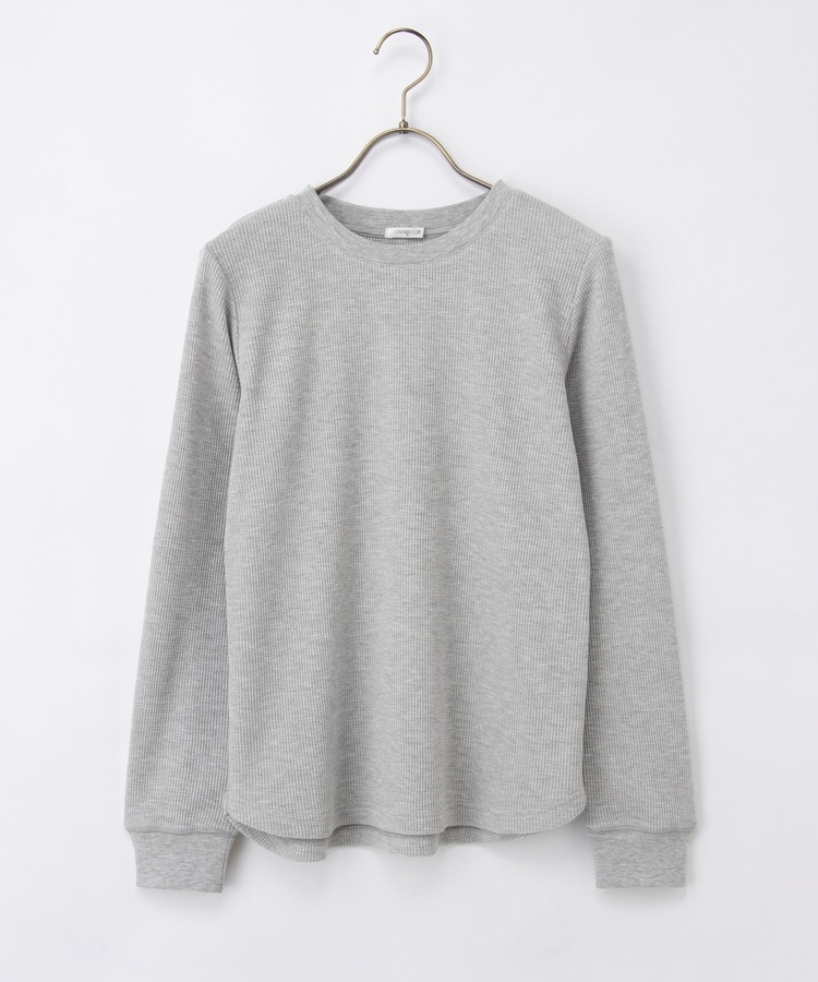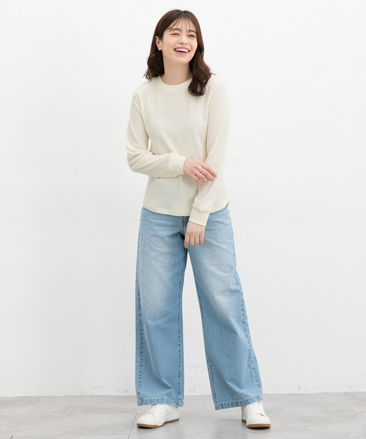 優しげなクルーネックと控えめなラウンド裾がフェミニンなデザイン。