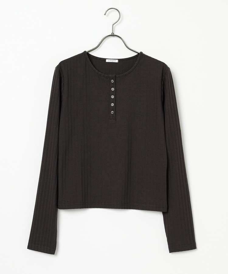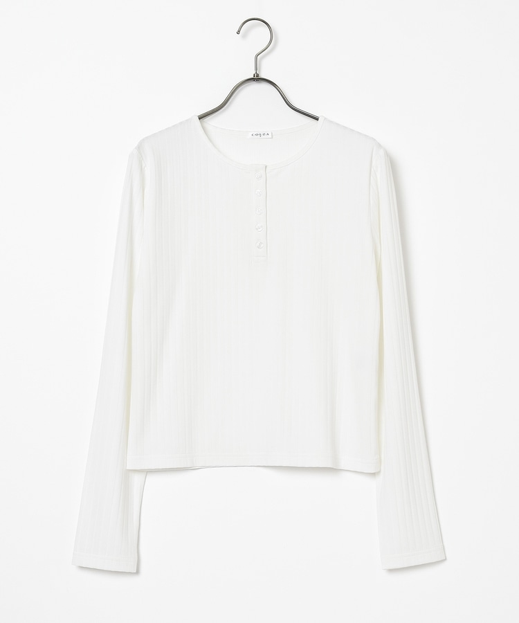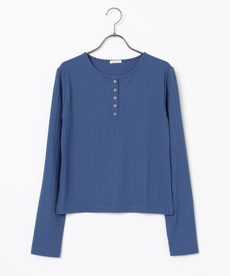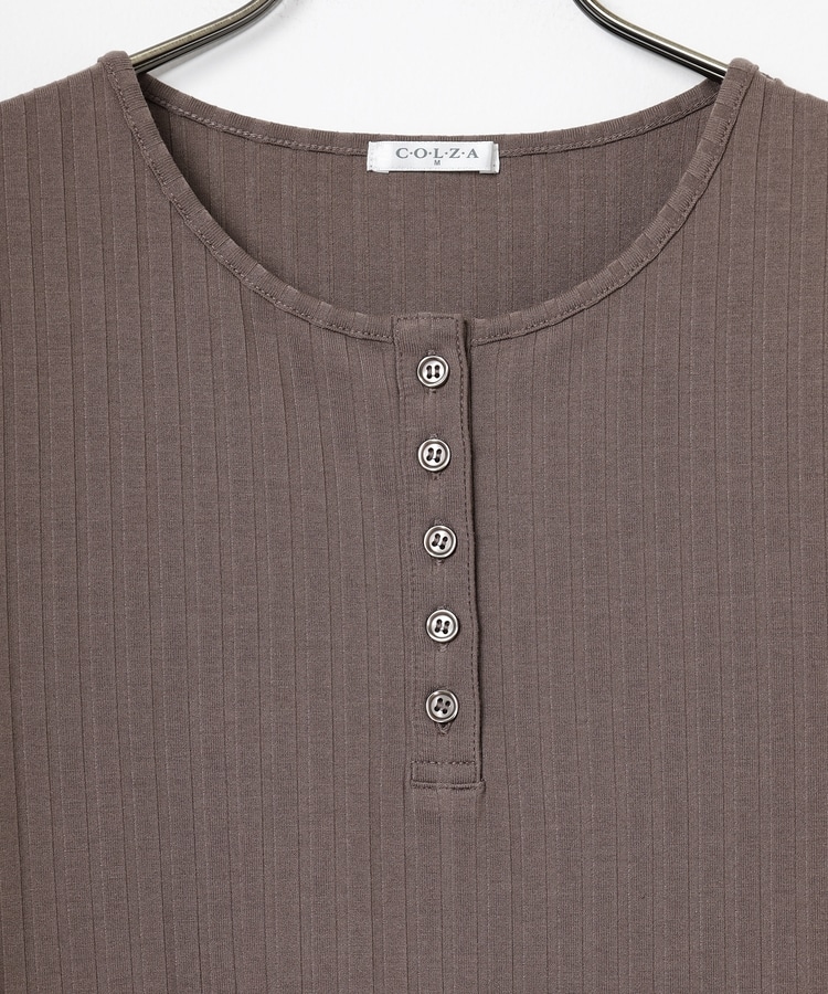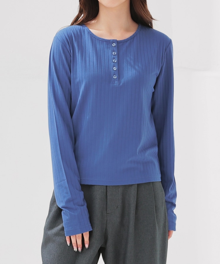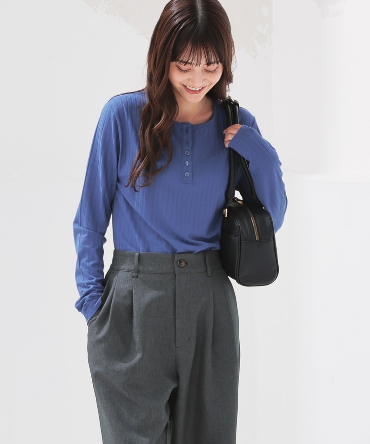 シンプルながらコーデのアクセントになるヘンリーネックデザイン。