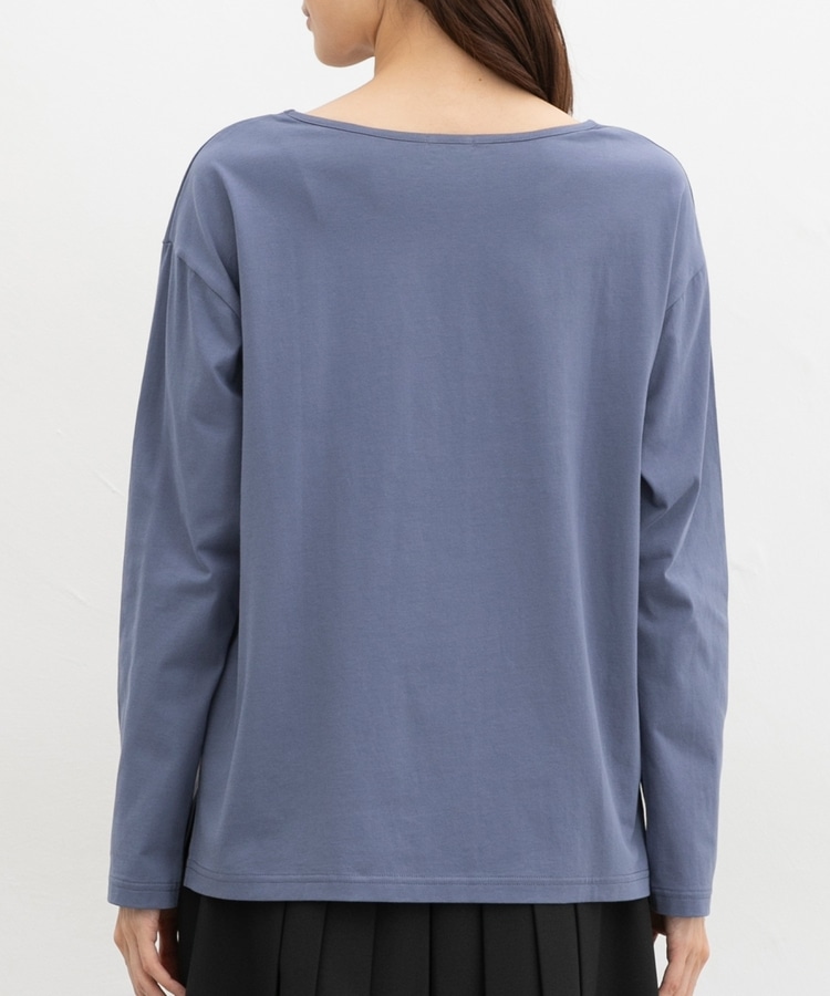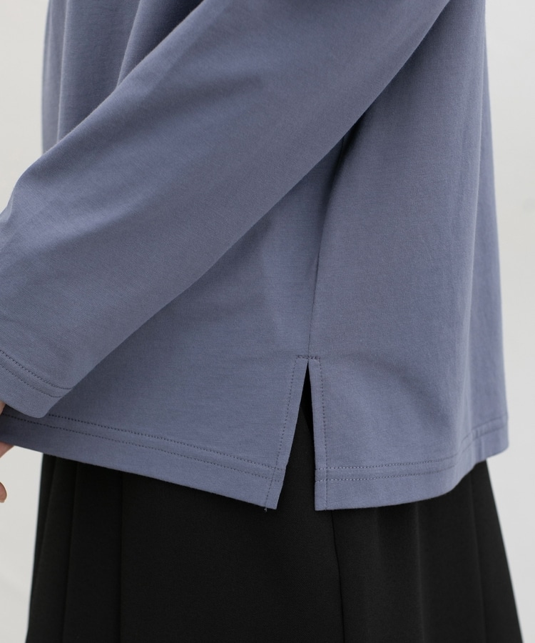ベーシックなクルーネックで、ゆったりめの幅と腰回りが隠れる丈感