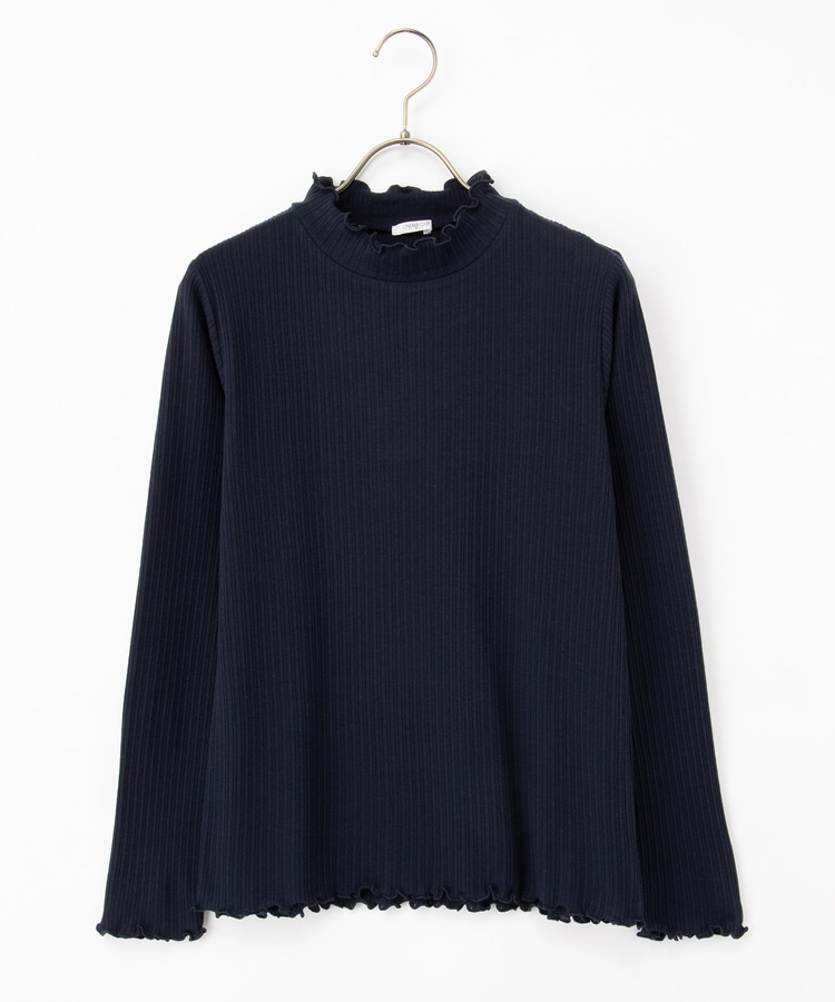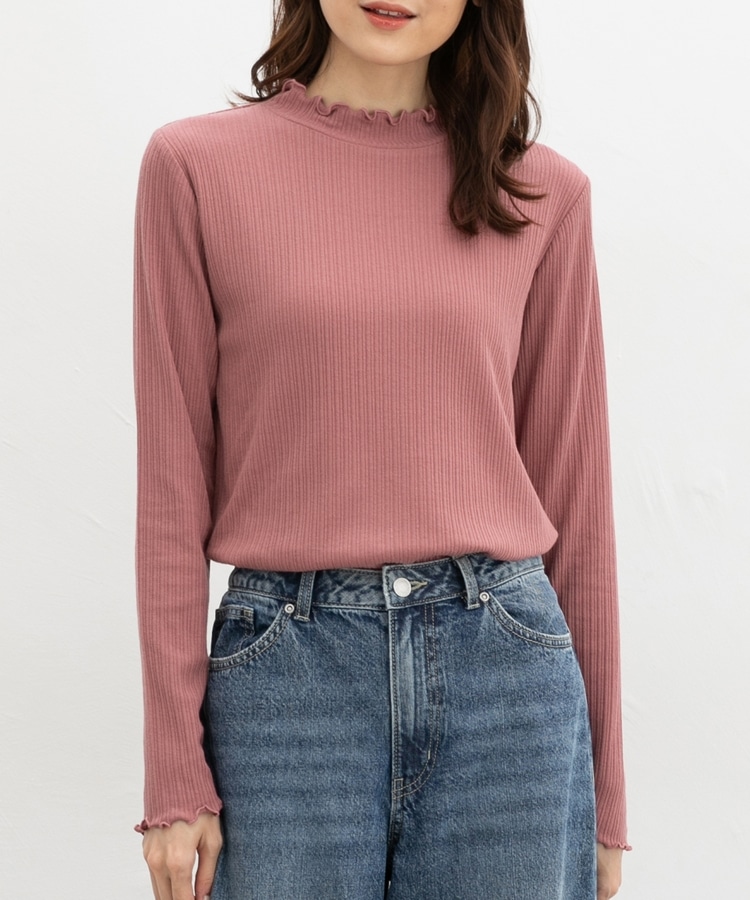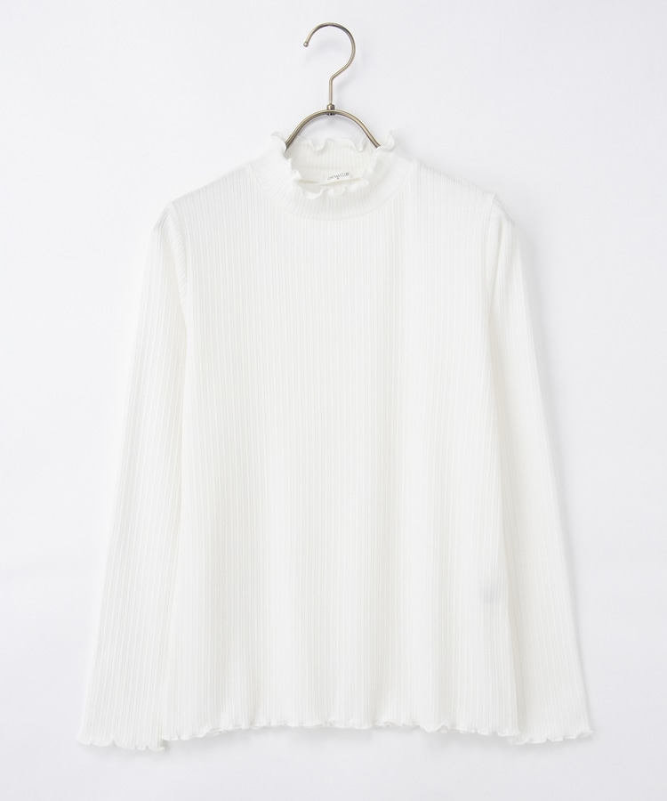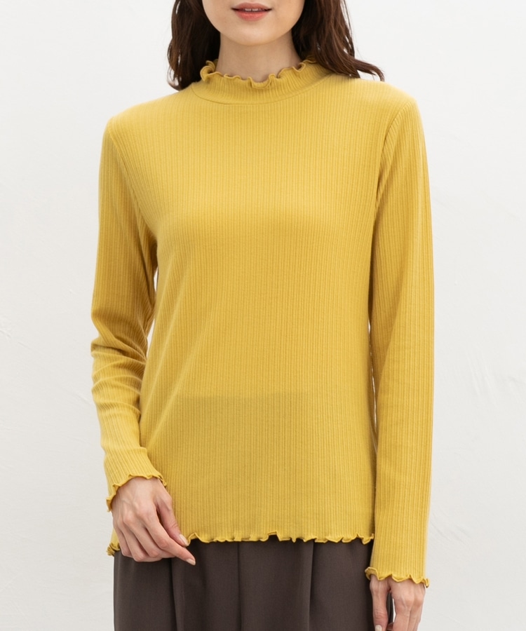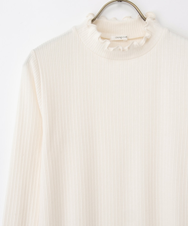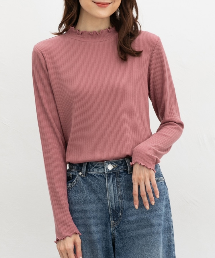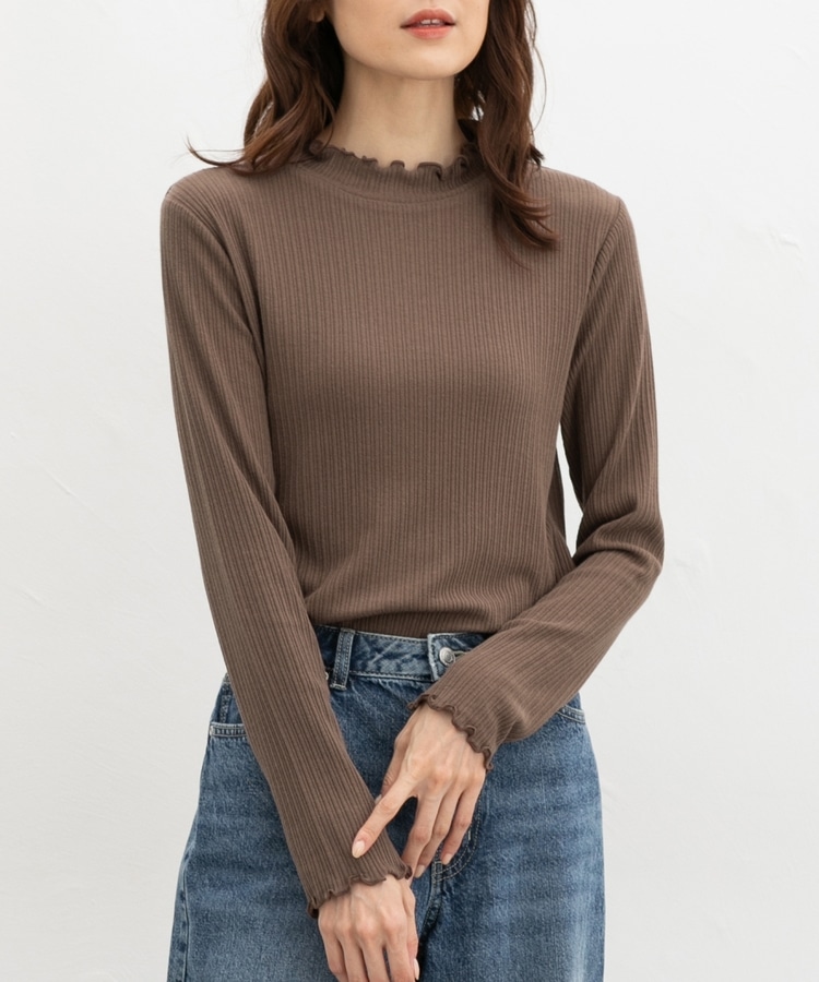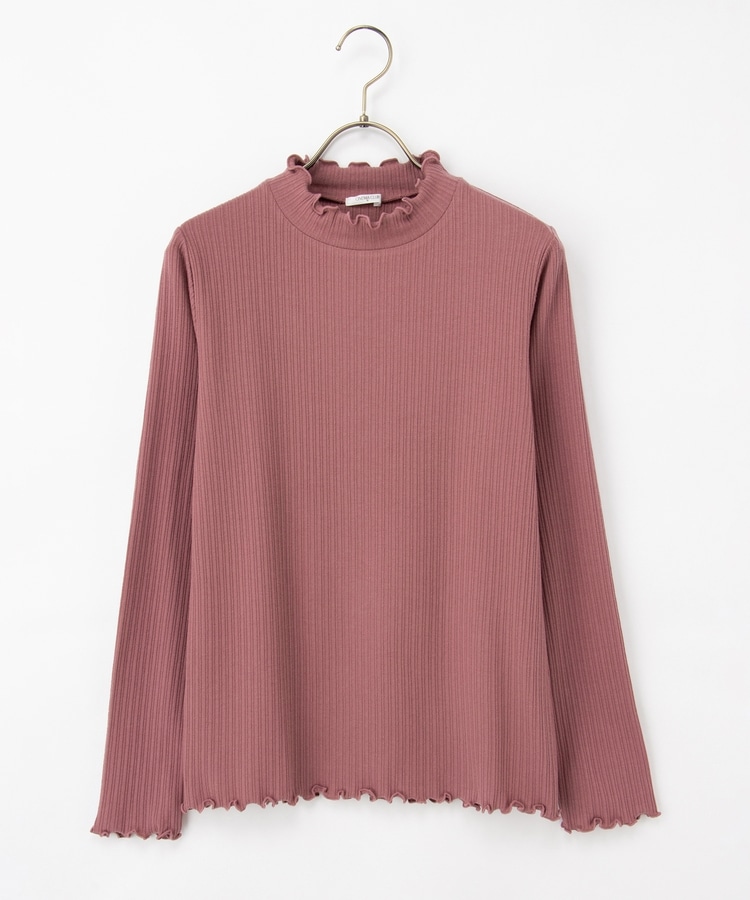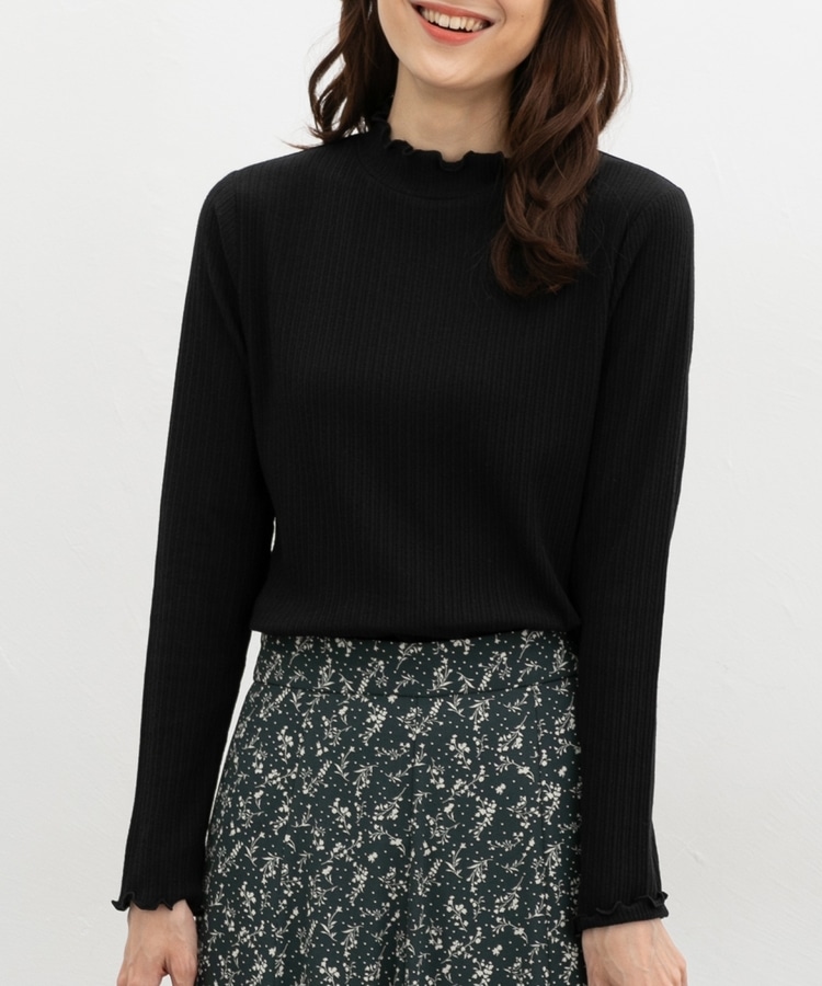 首元を隠してあったかな、程よい高さのプチハイネックに、メロー使いで洒落感もプラスしたフェミニンなデザイン。