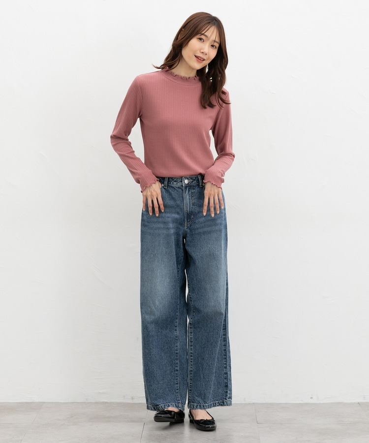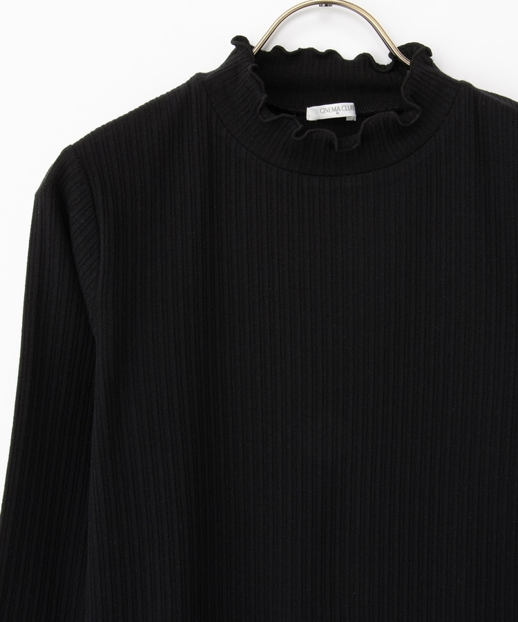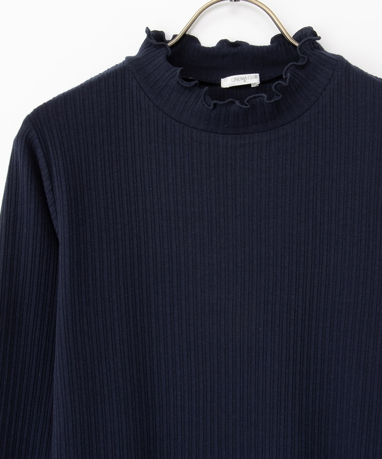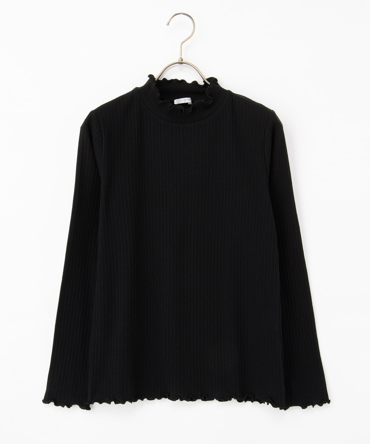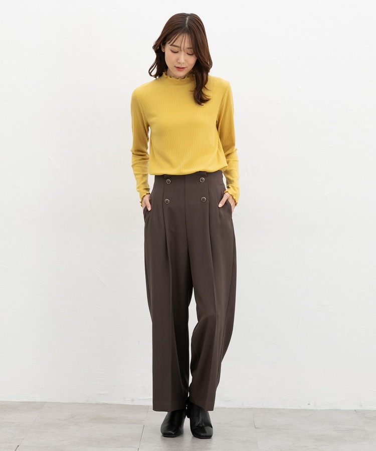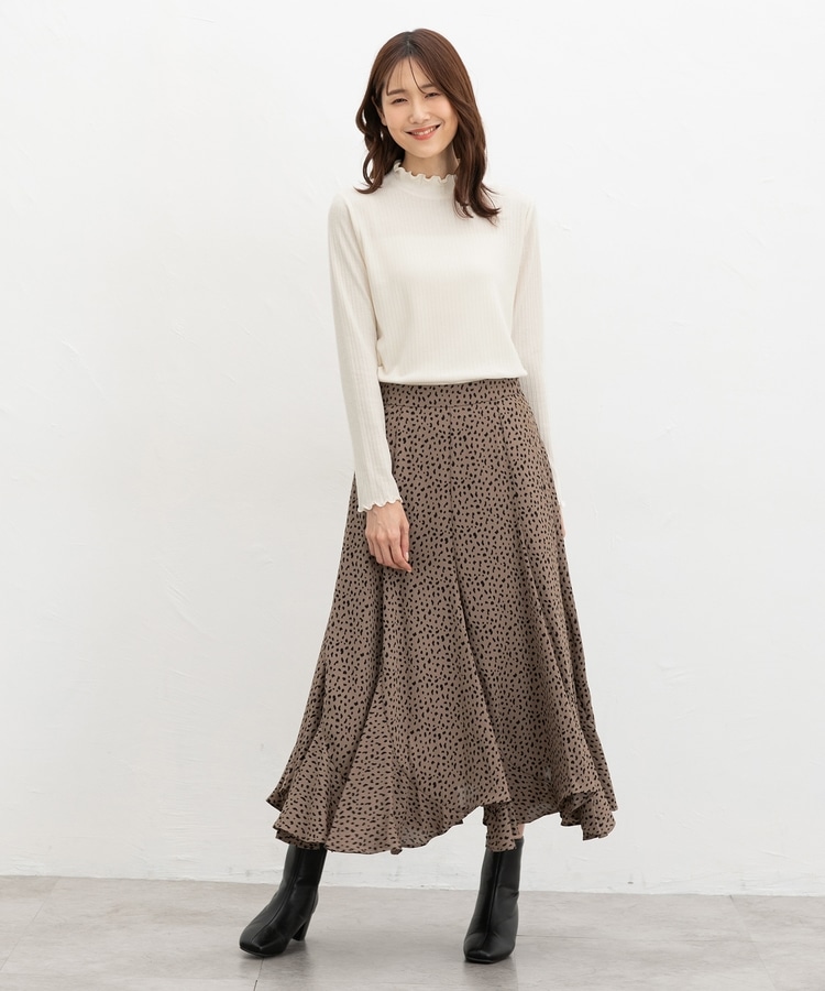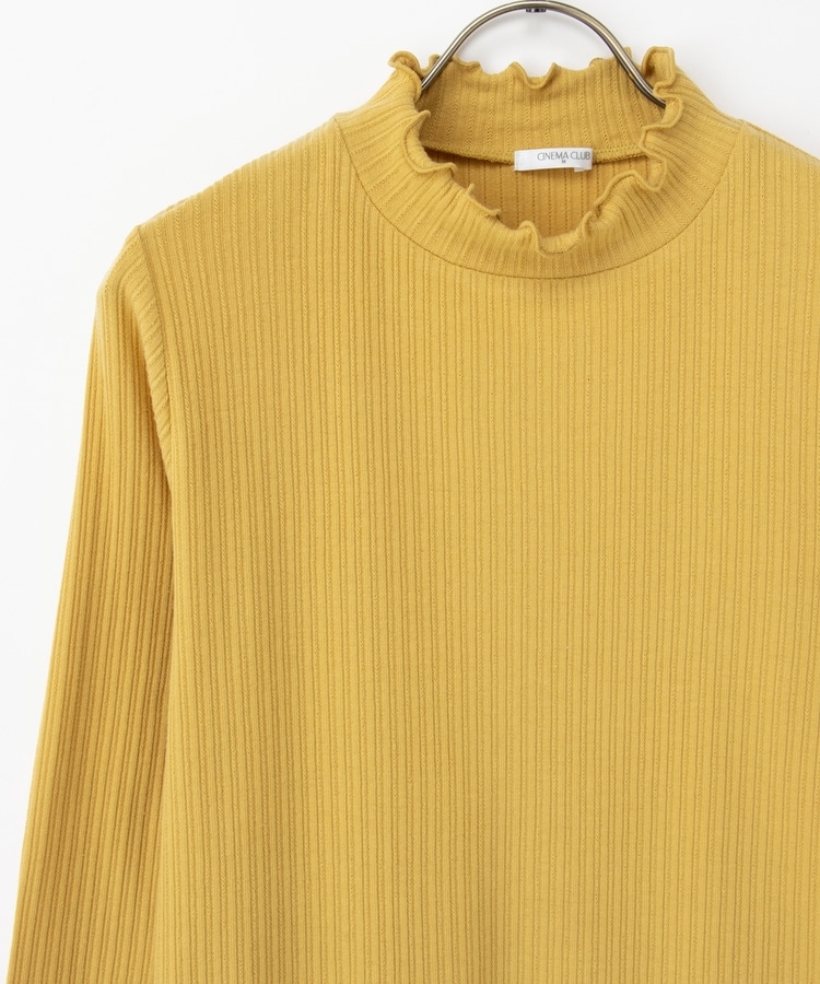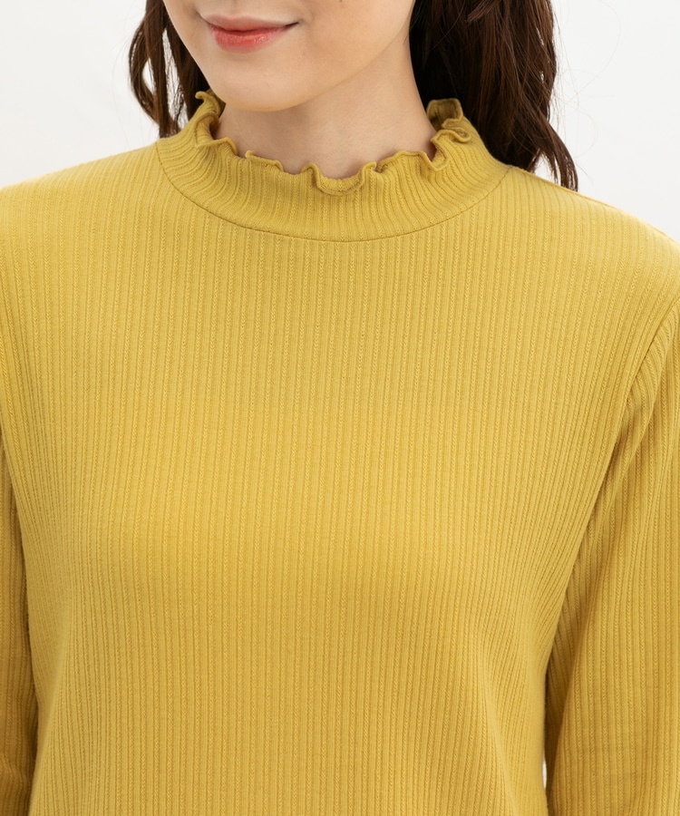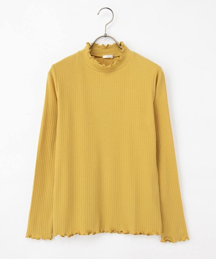 首元を隠してあったかな、程よい高さのプチハイネックに、メロー使いで洒落感もプラスしたフェミニンなデザイン。