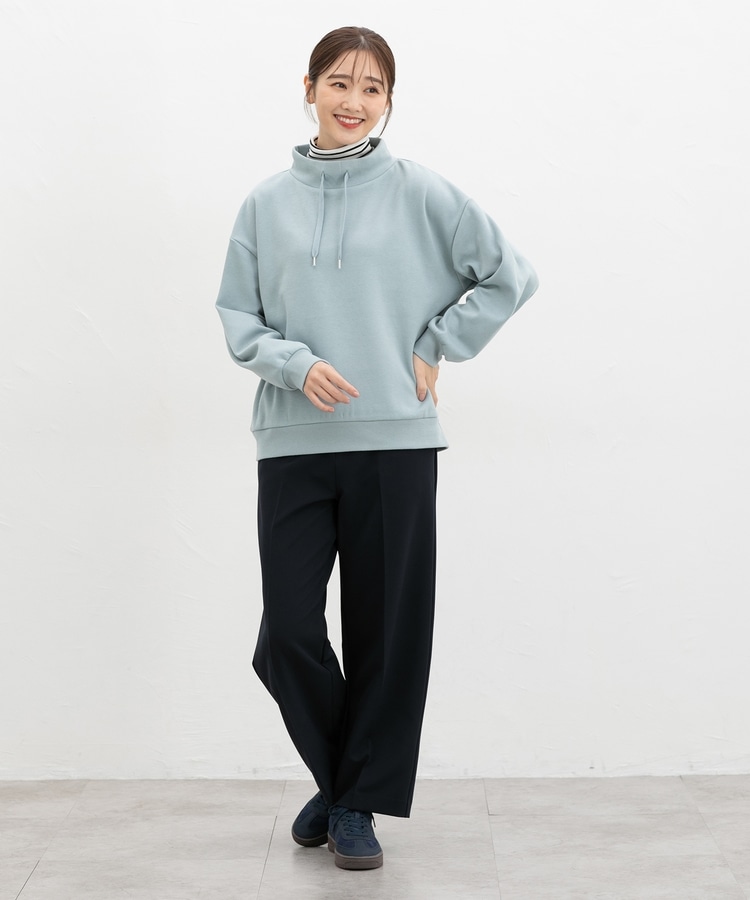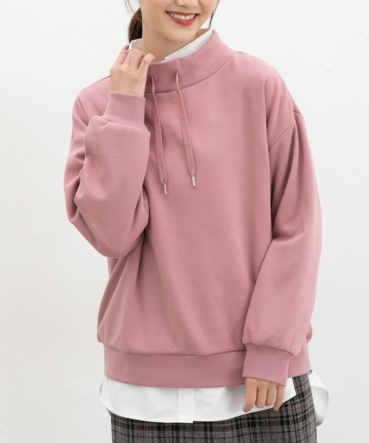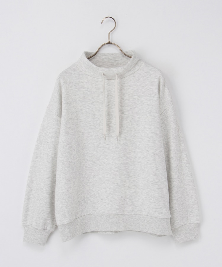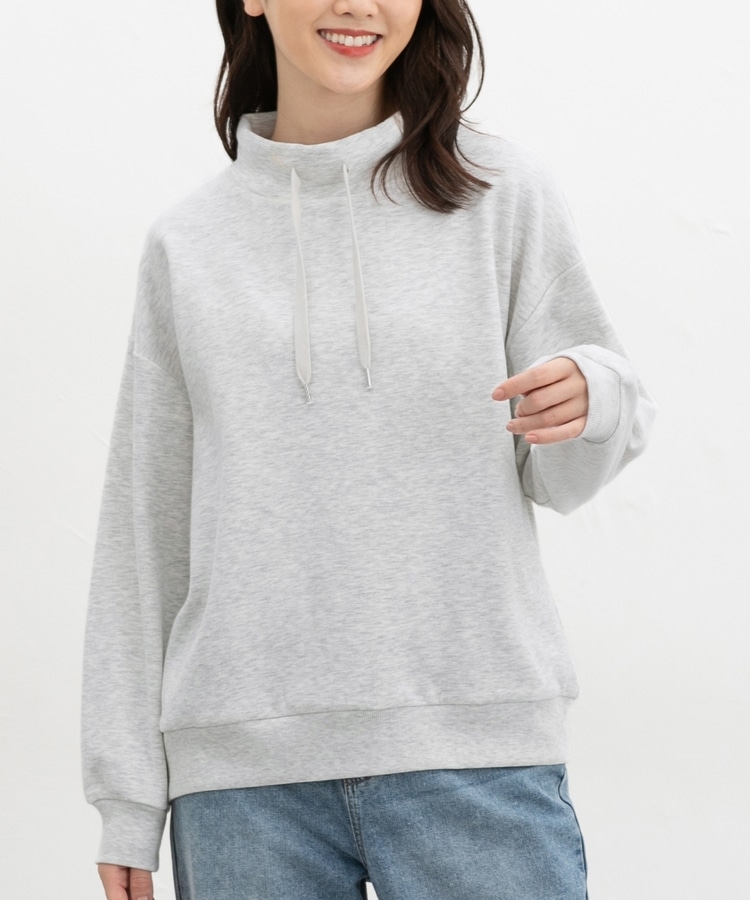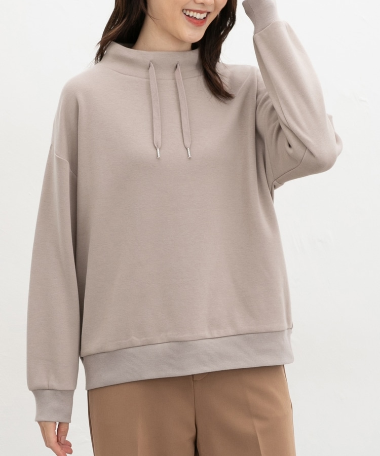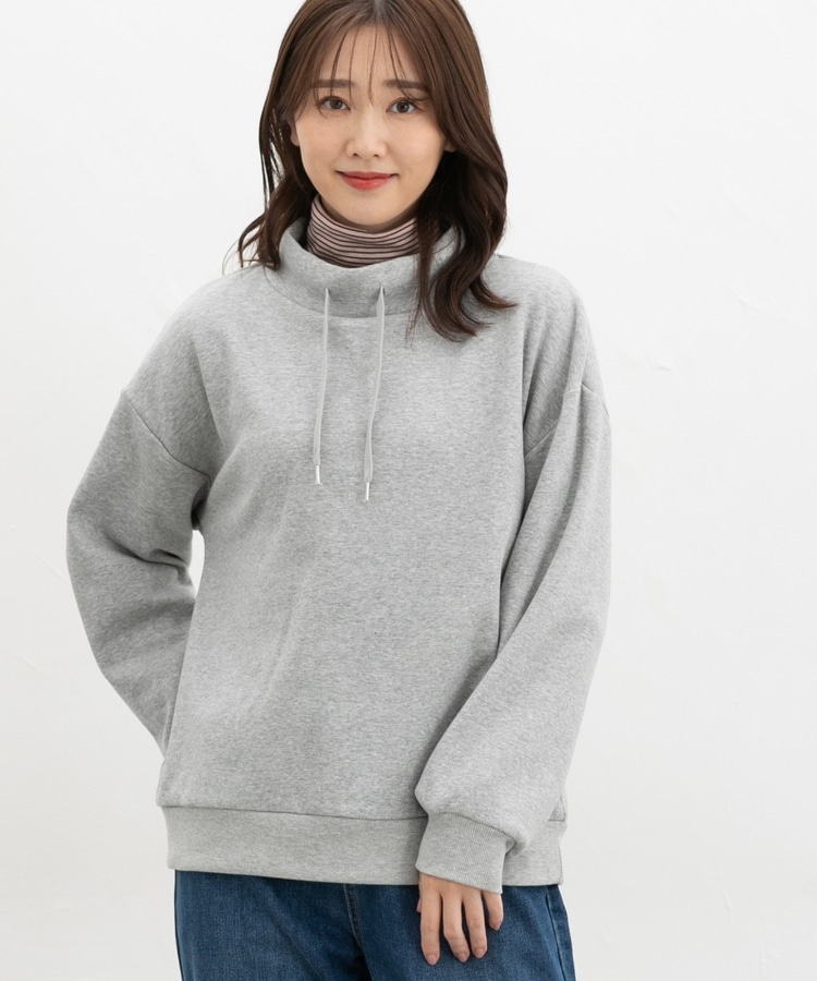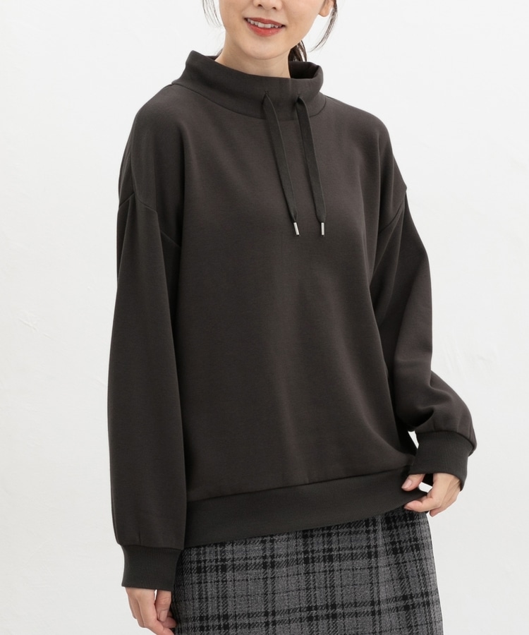首元まであったかなスタンドネックに、衿元のスピンドルがアクセントになるシンプルデザイン。