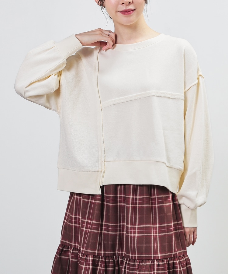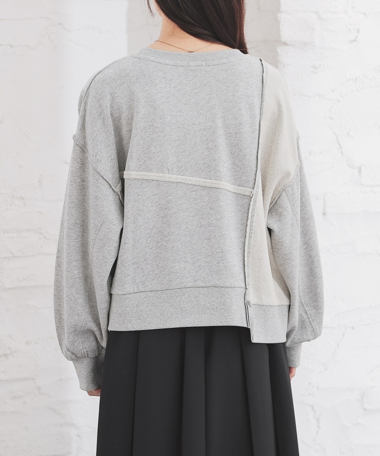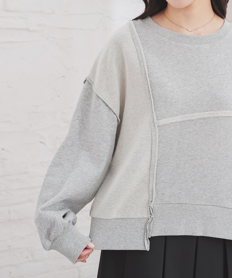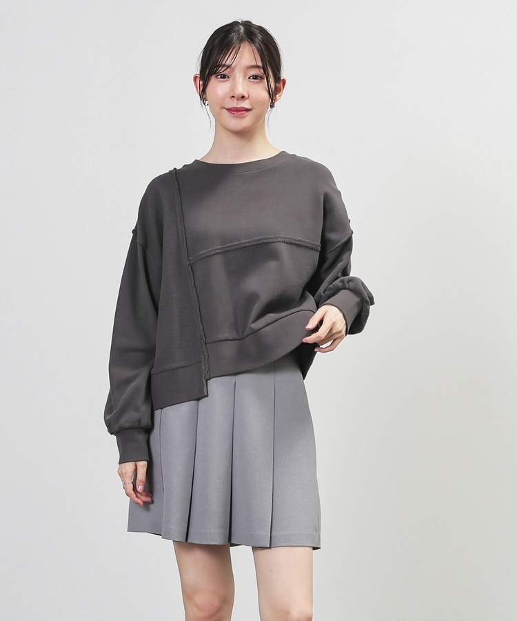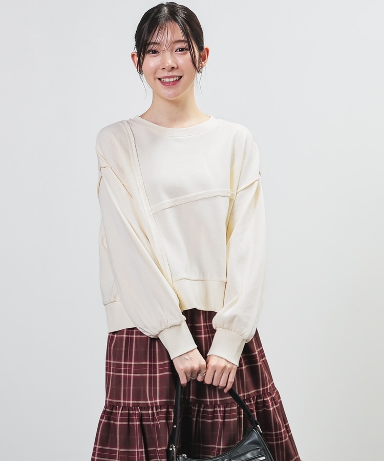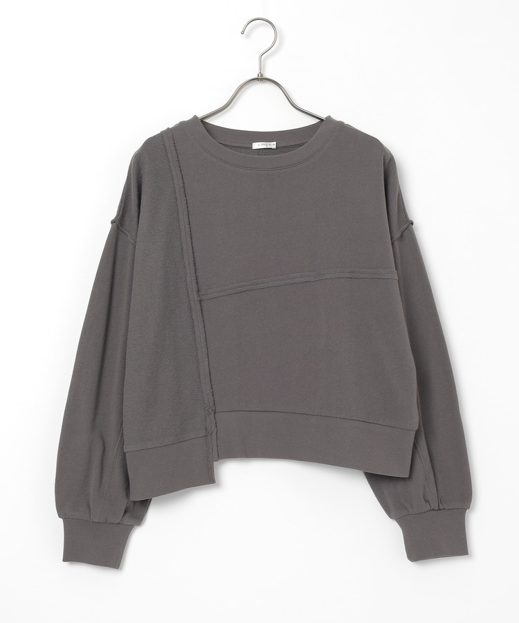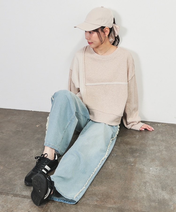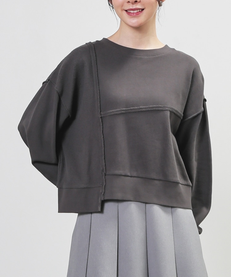 部分的に生地の裏側や縫い目を表側にして、リメイク風に仕上げた、こなれ感のあるデザイン。