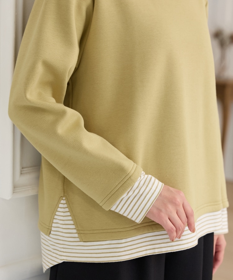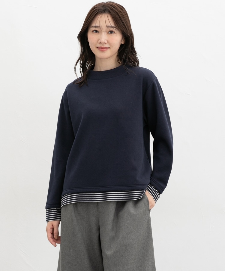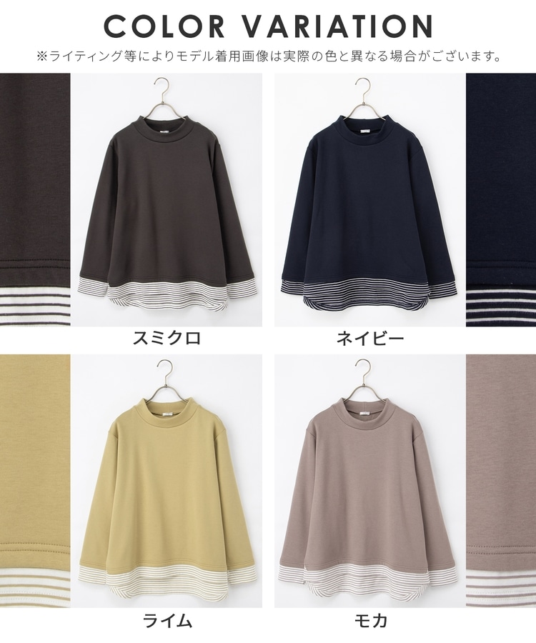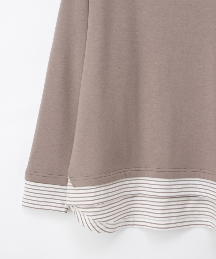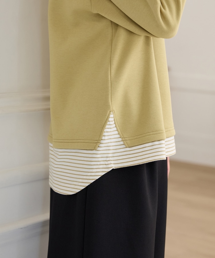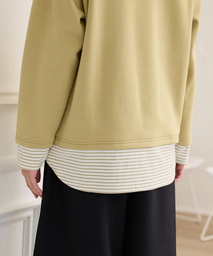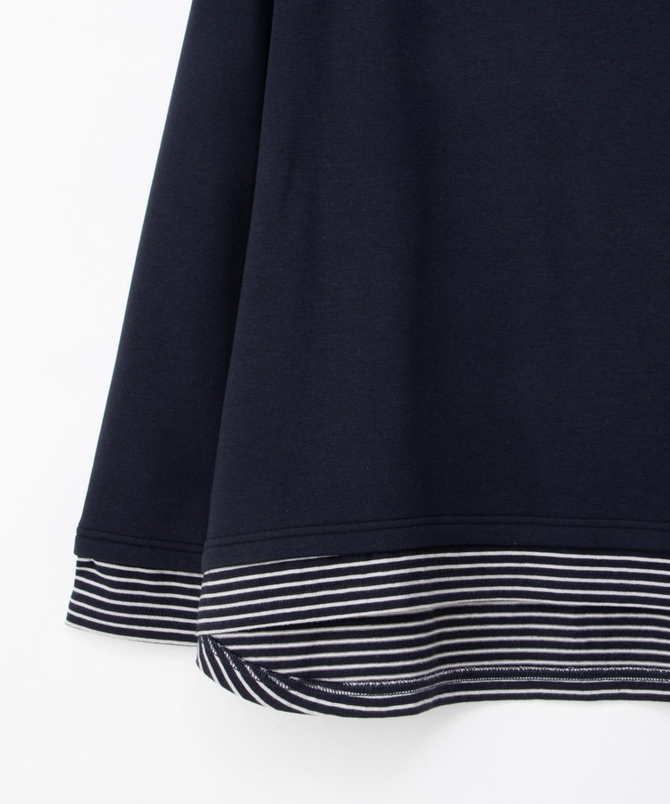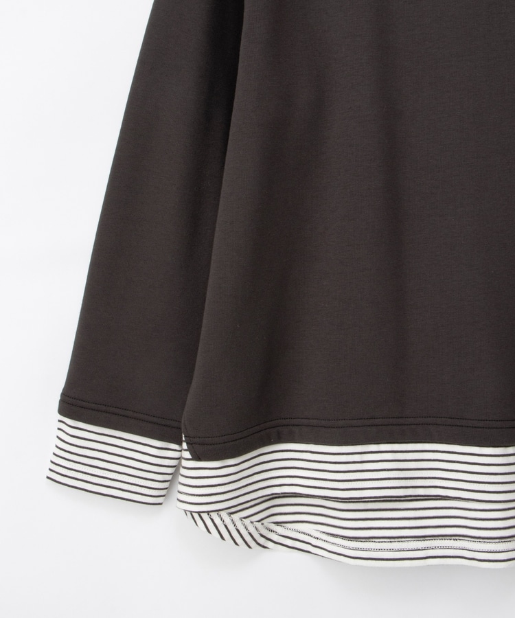 1枚でおしゃれに決まる、裾からボーダーTシャツをのぞかせたようなレイヤード風デザイン。