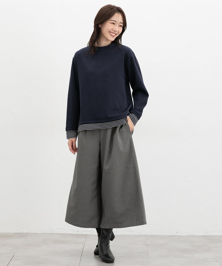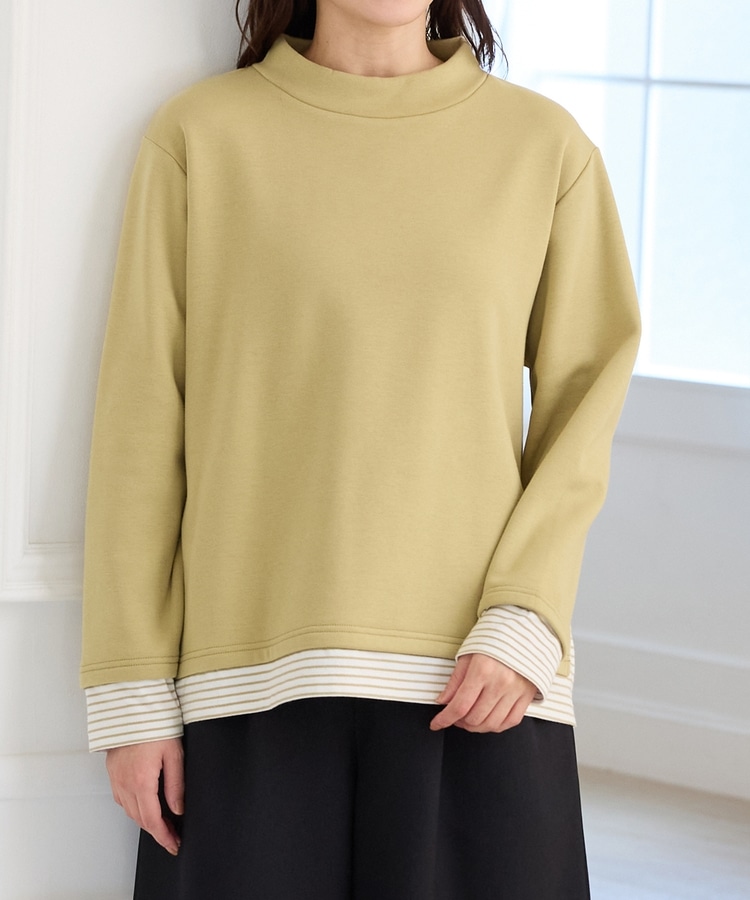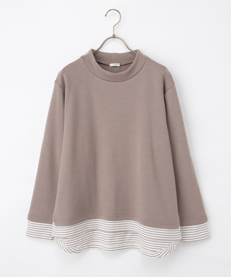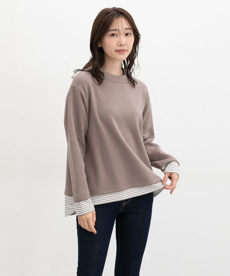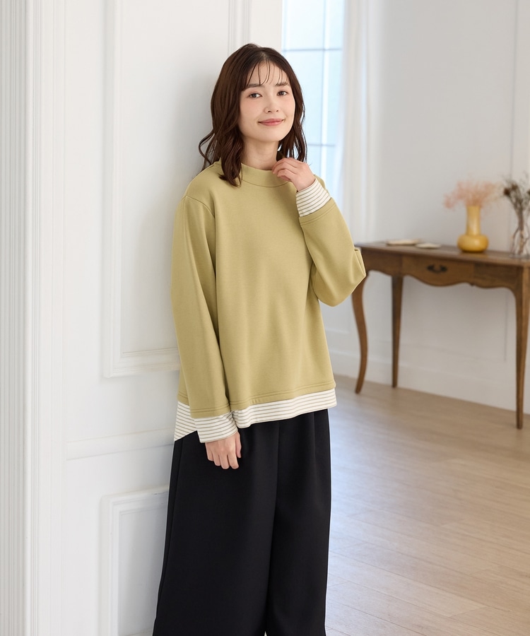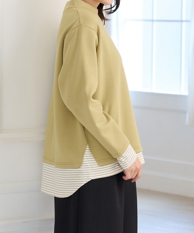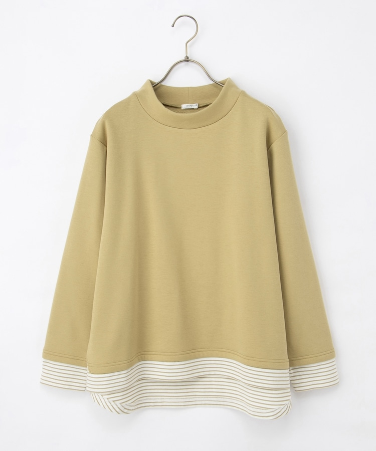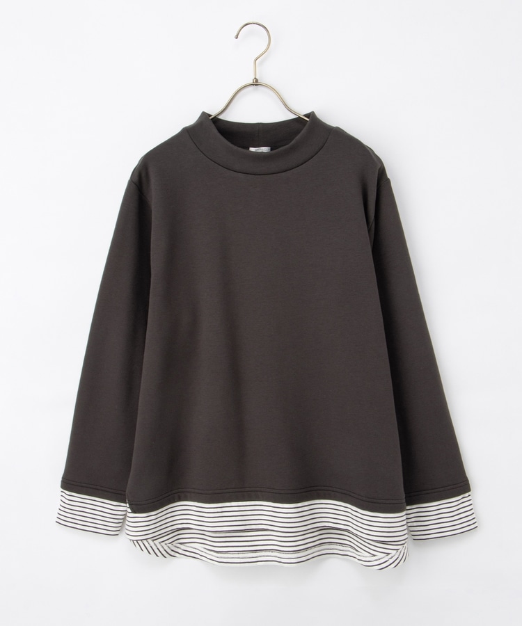 1枚でおしゃれに決まる、裾からボーダーTシャツをのぞかせたようなレイヤード風デザイン。
