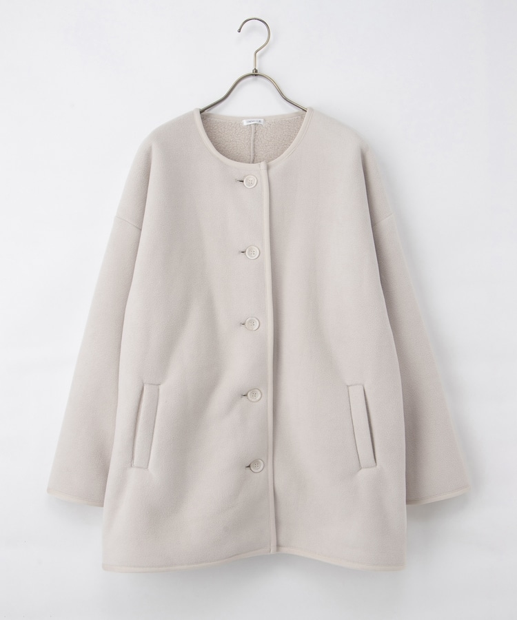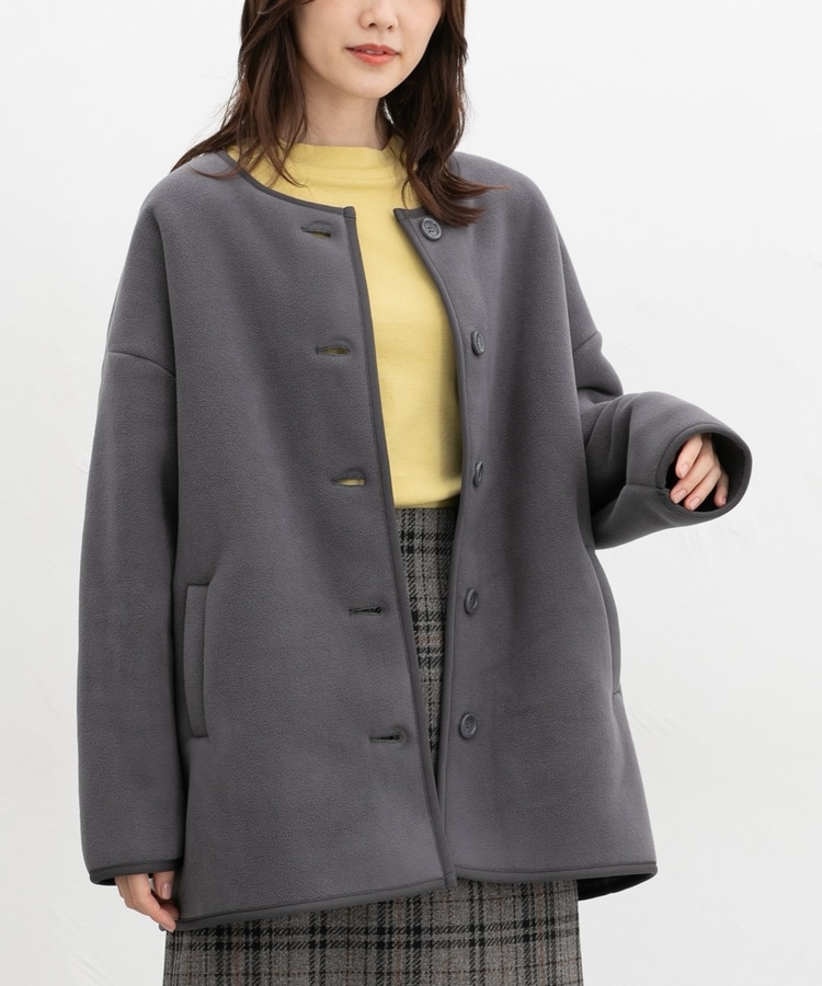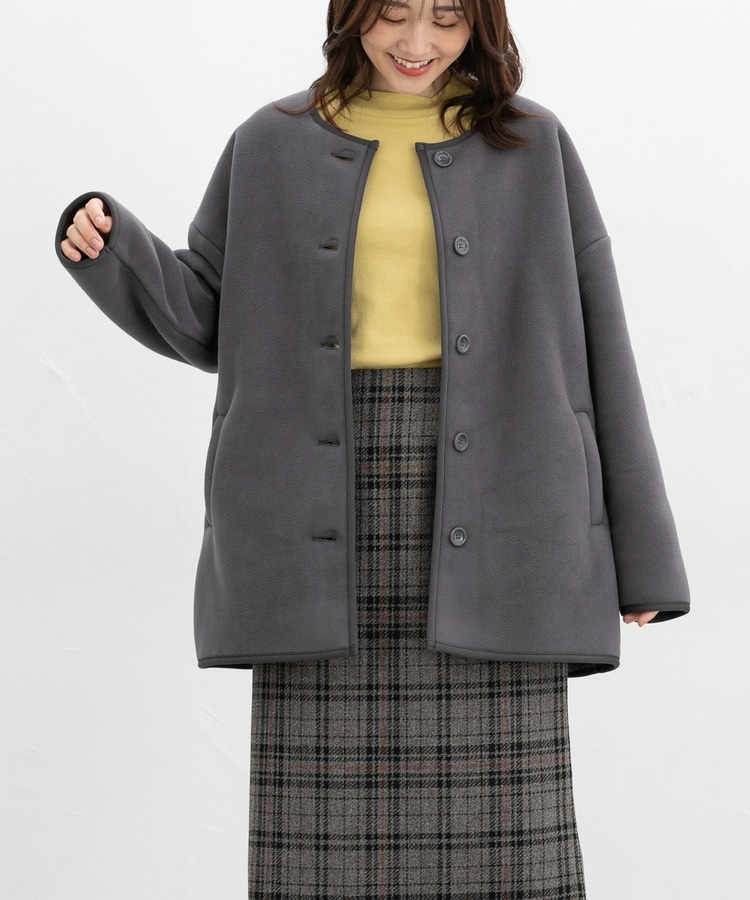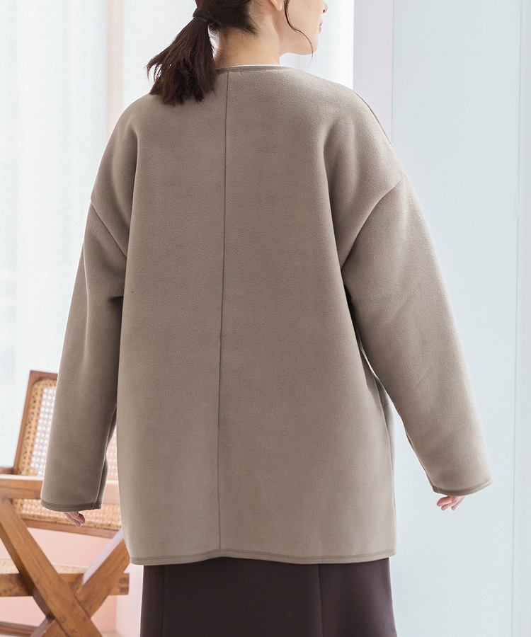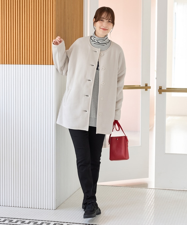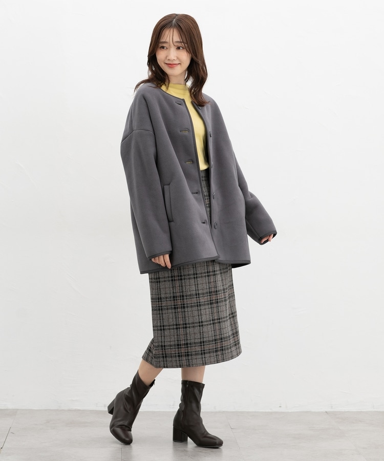 ニットやスウェットなどの上にも羽織りやすい、ゆったり幅とヒップまですっぽり隠れる丈感のリラクシーなシルエットで、体型もカバー。