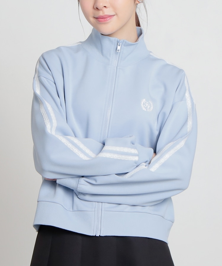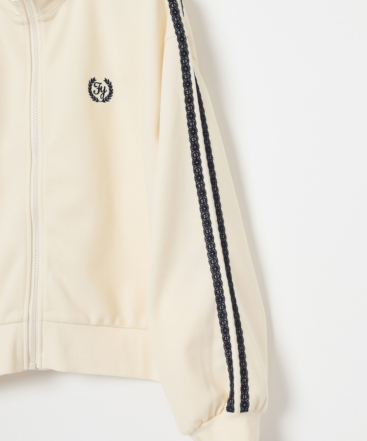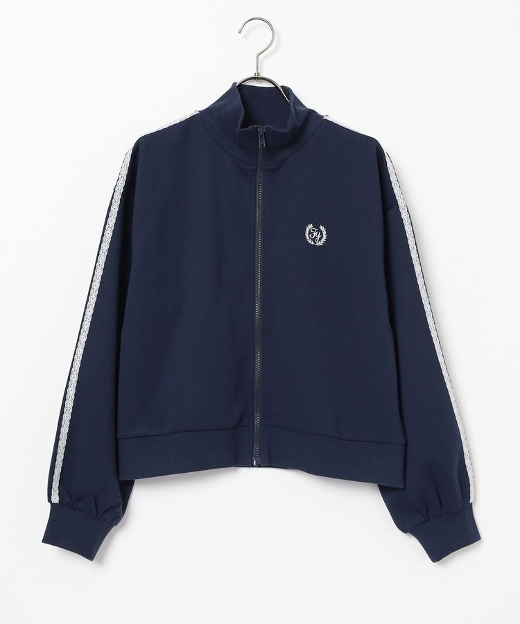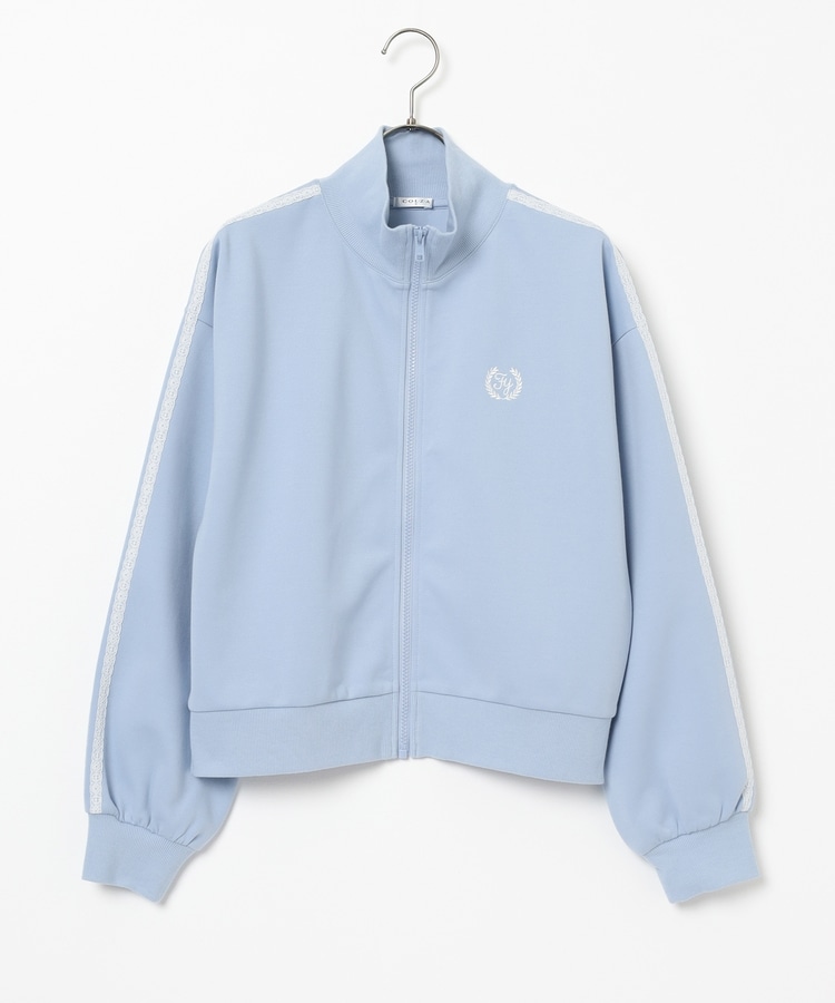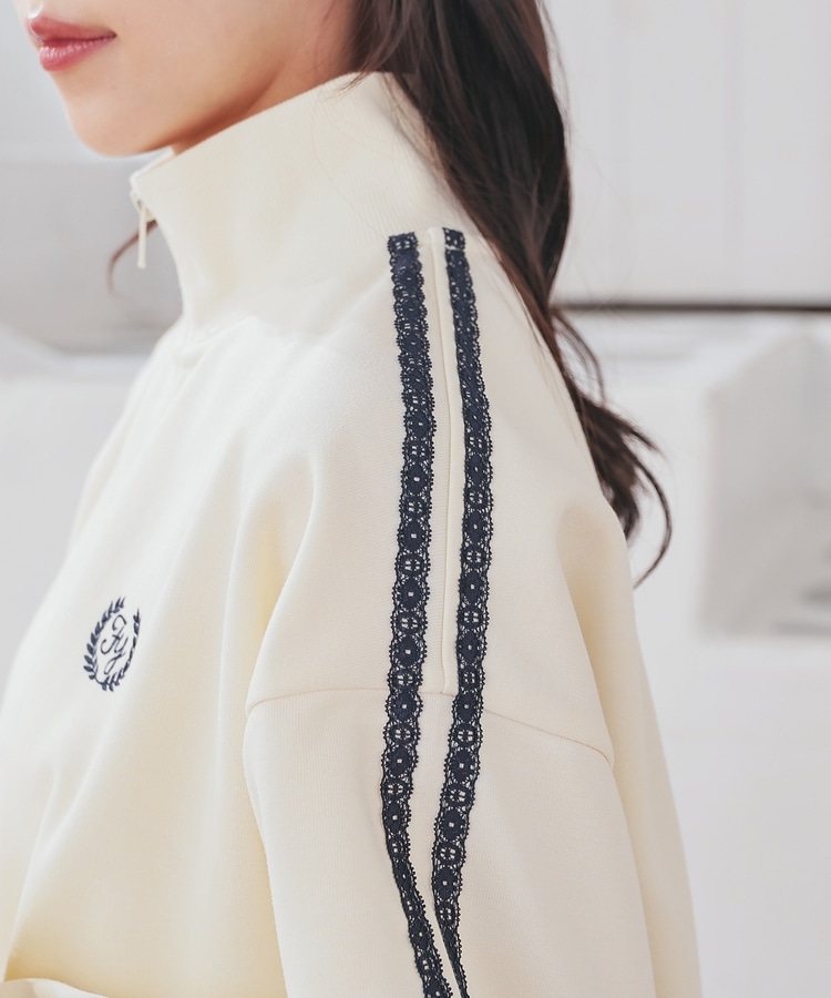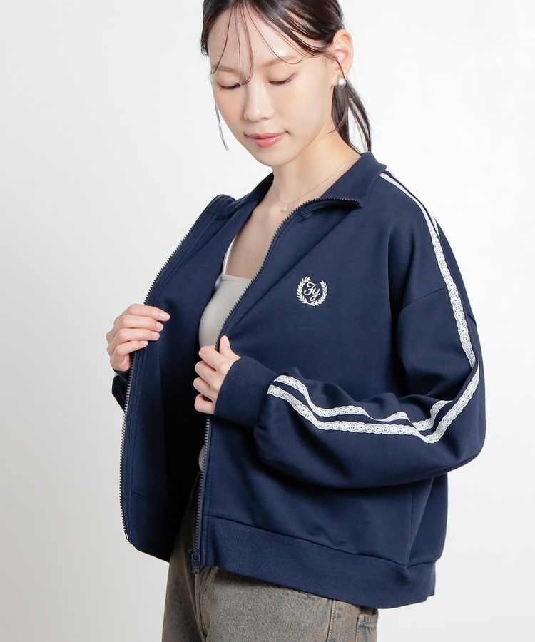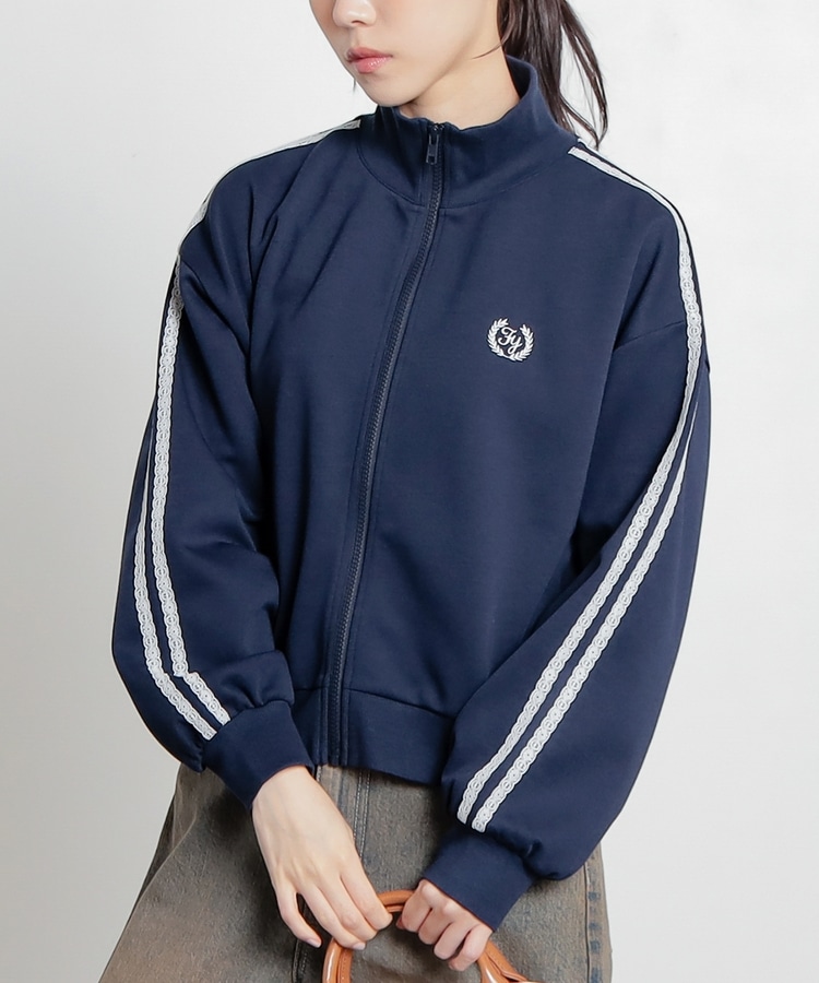 スポーティーなトラックジャケットの袖ラインにレースを使い、甘さをプラスしたデザイン。