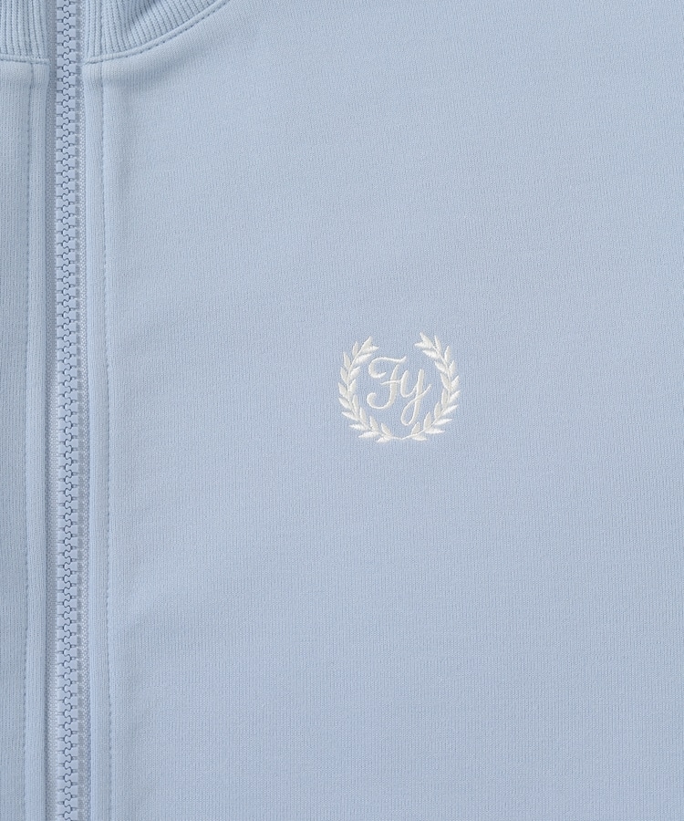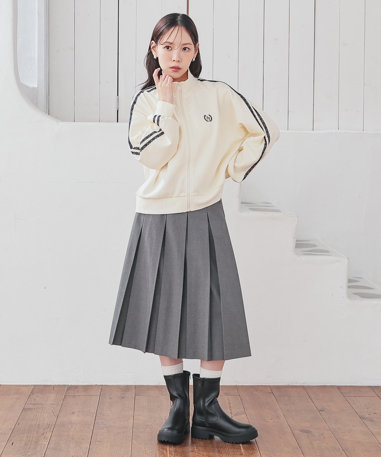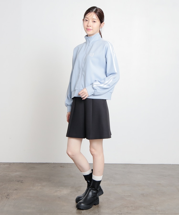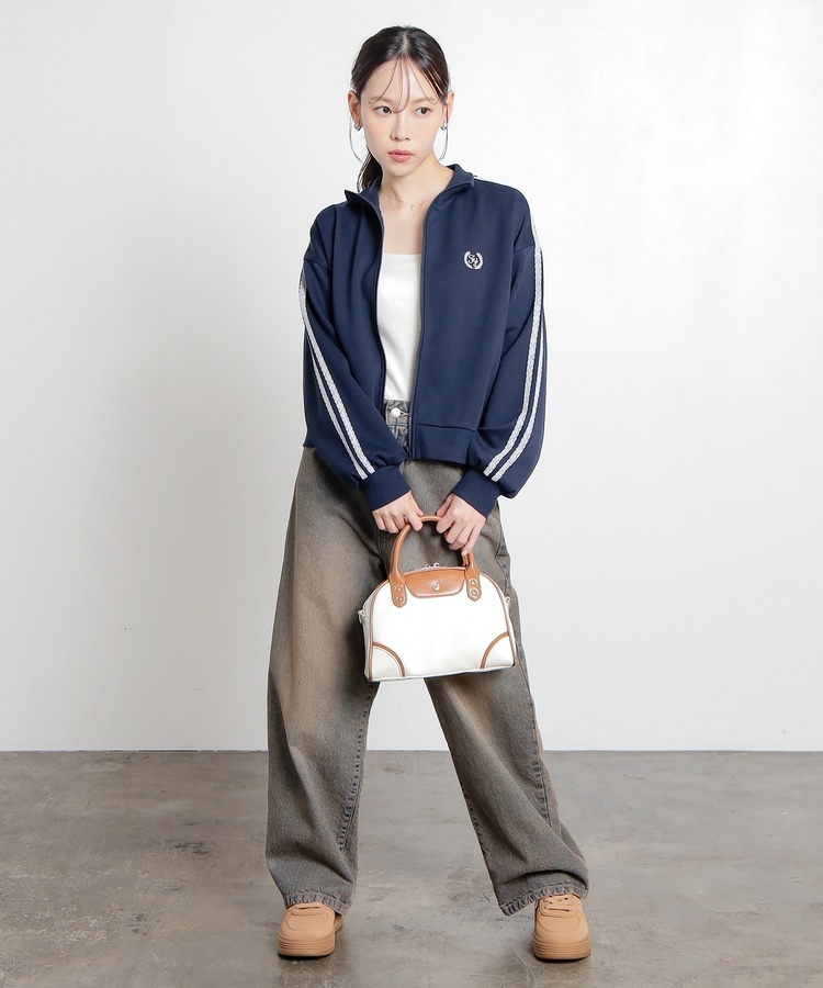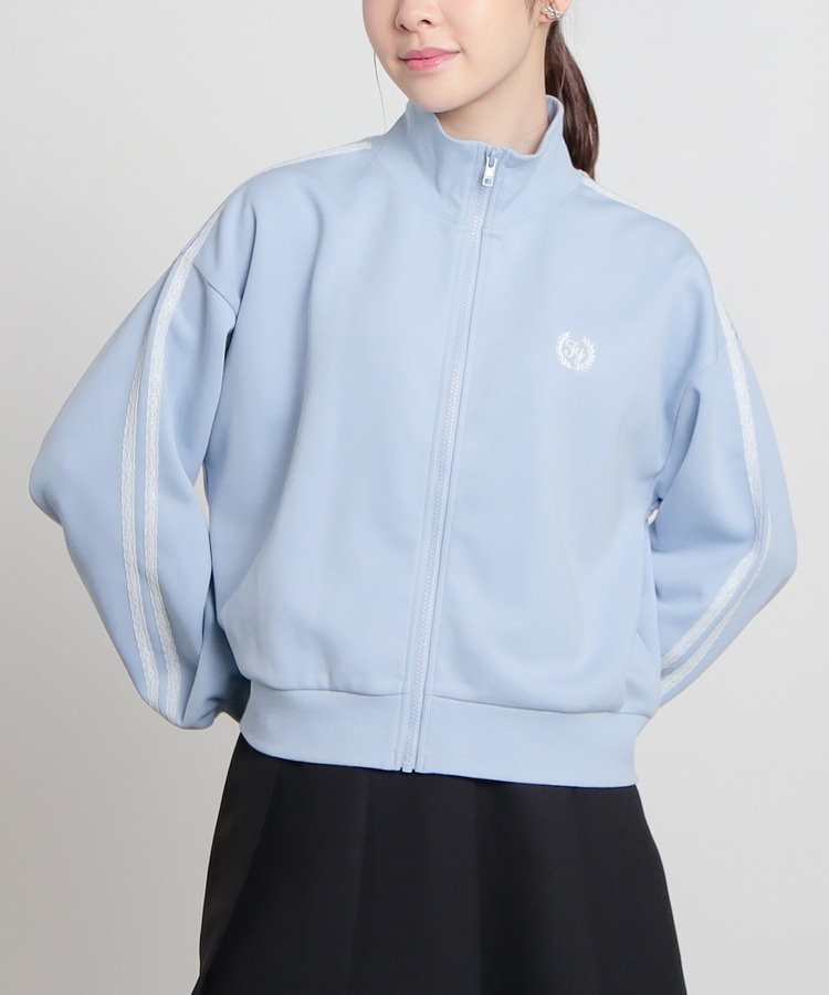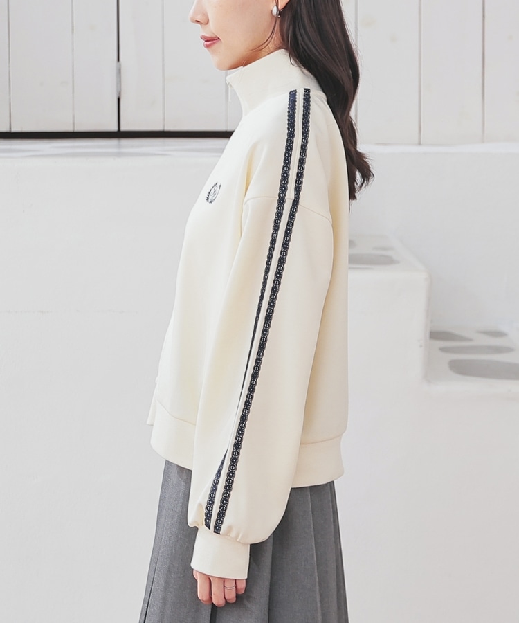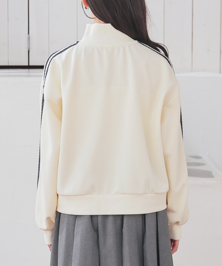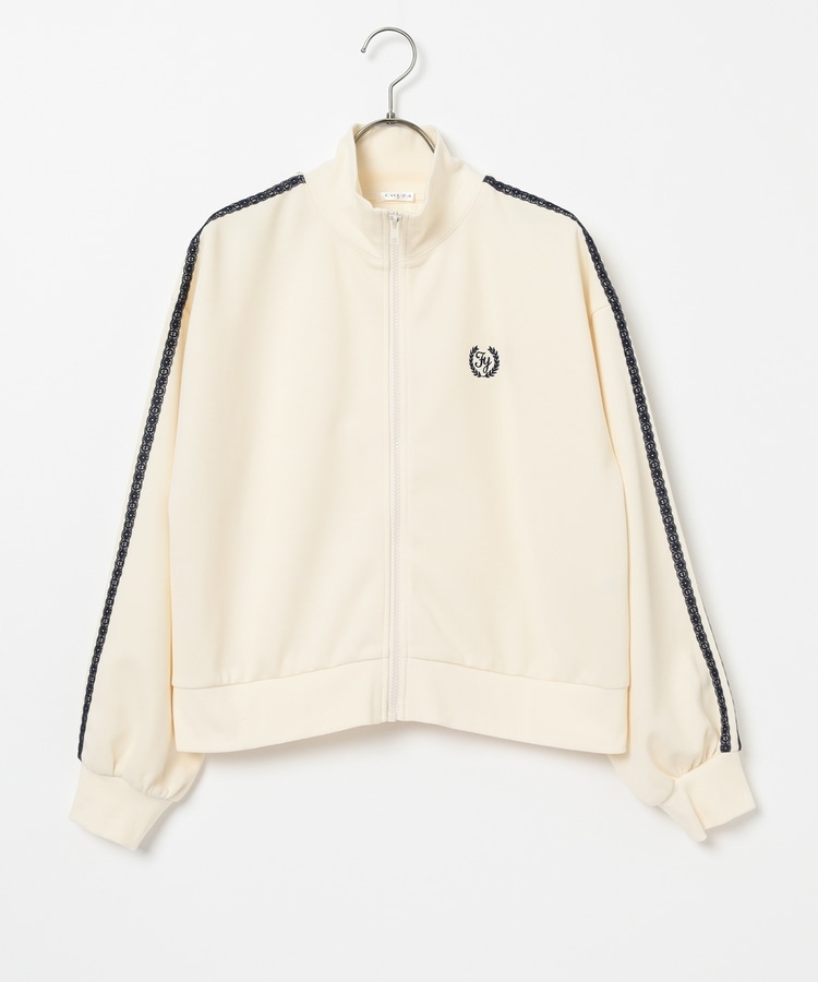 スポーティーなトラックジャケットの袖ラインにレースを使い、甘さをプラスしたデザイン。