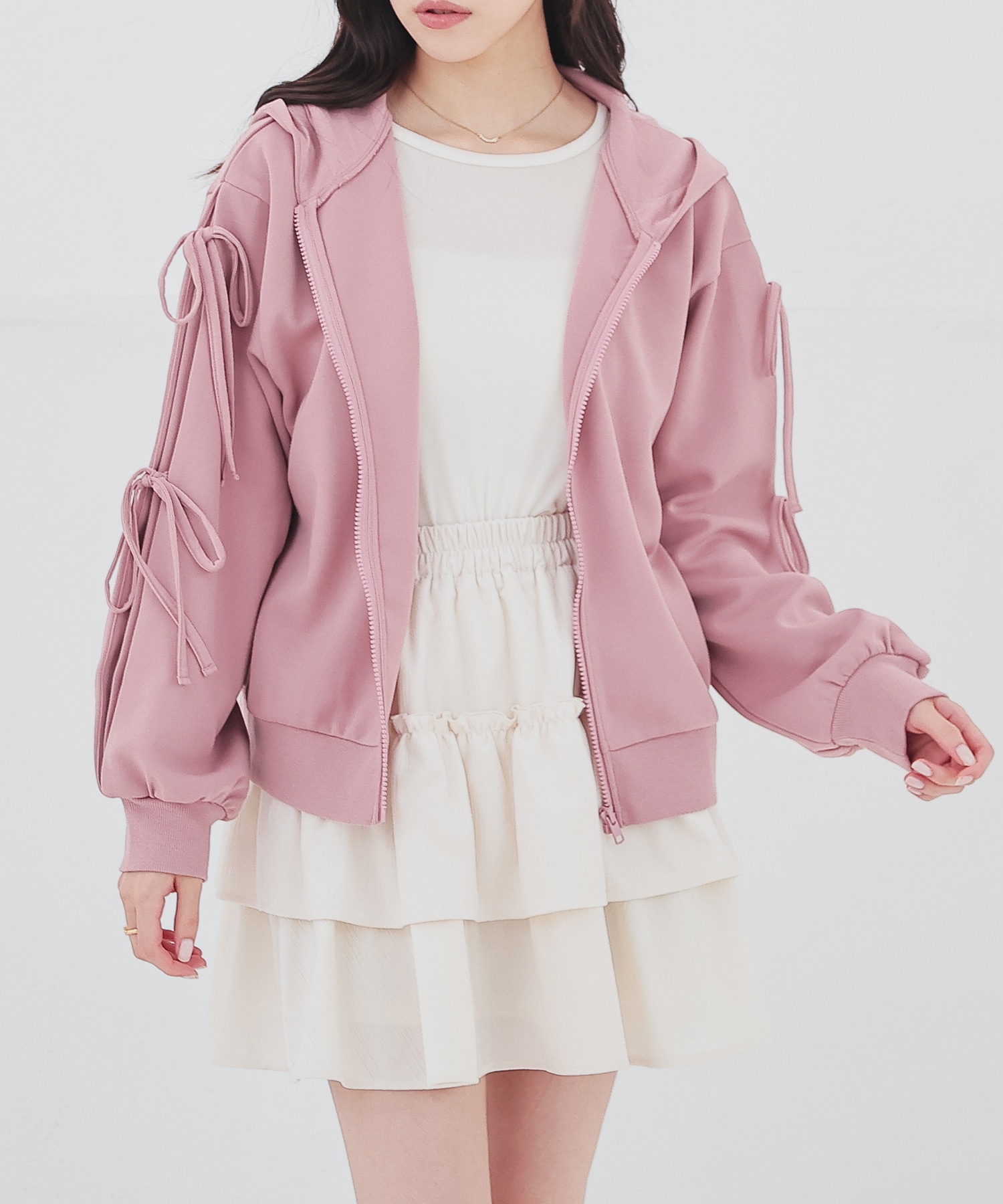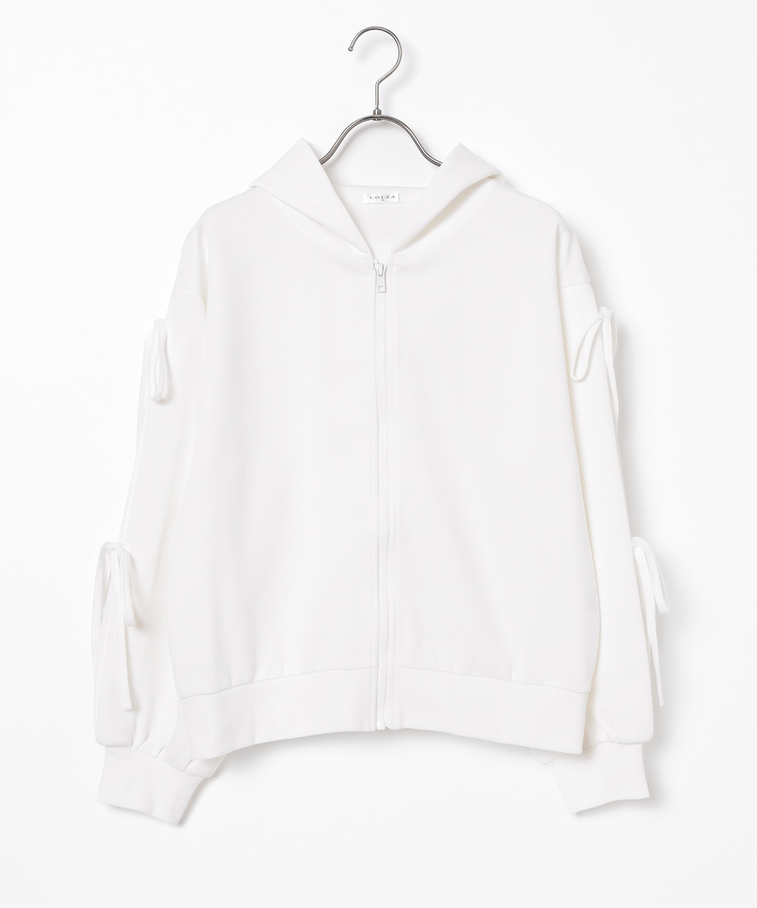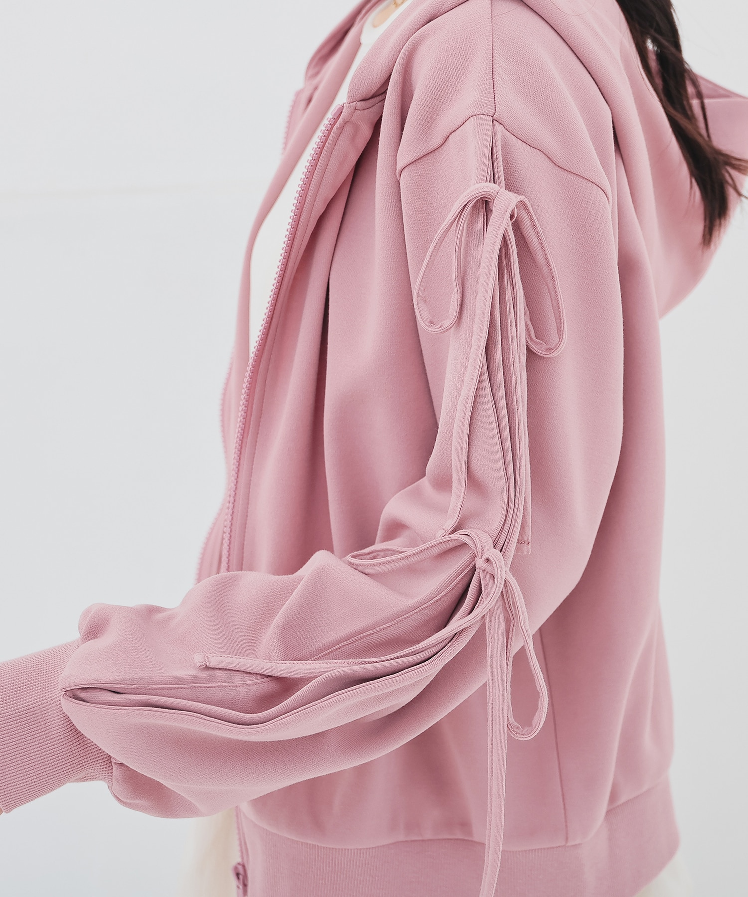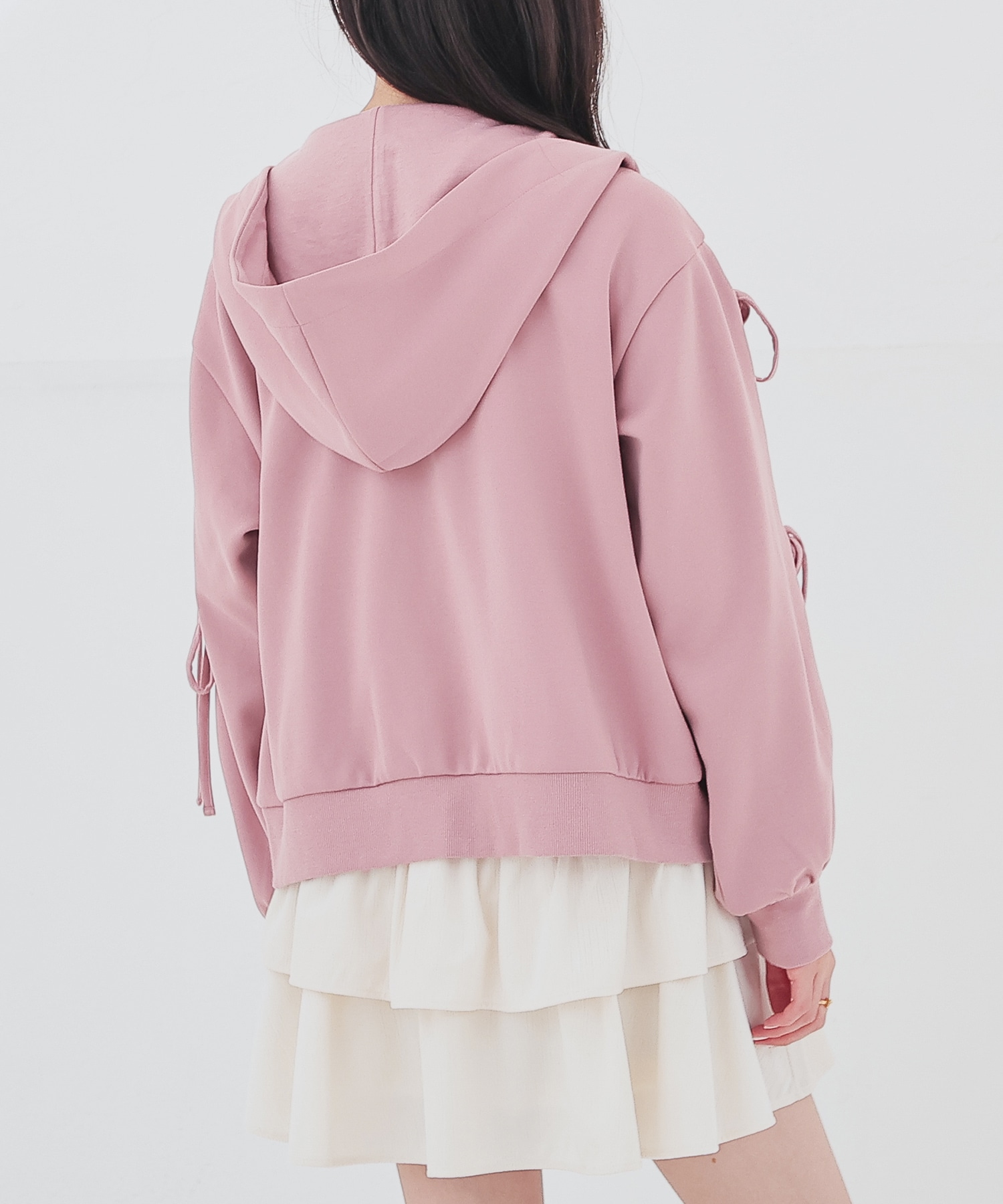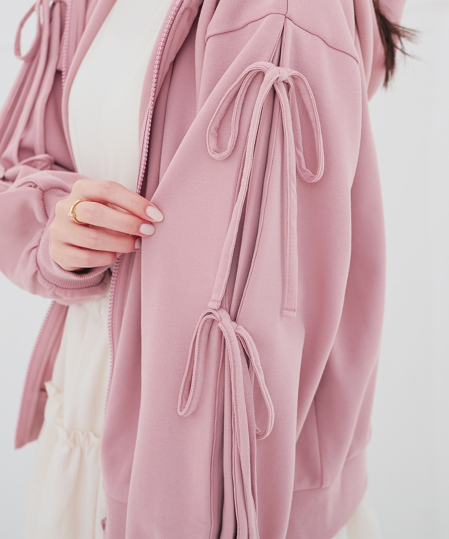 シンプルなジップパーカーの袖に、甘すぎない同色リボンをプラスしたキュートなデザイン。