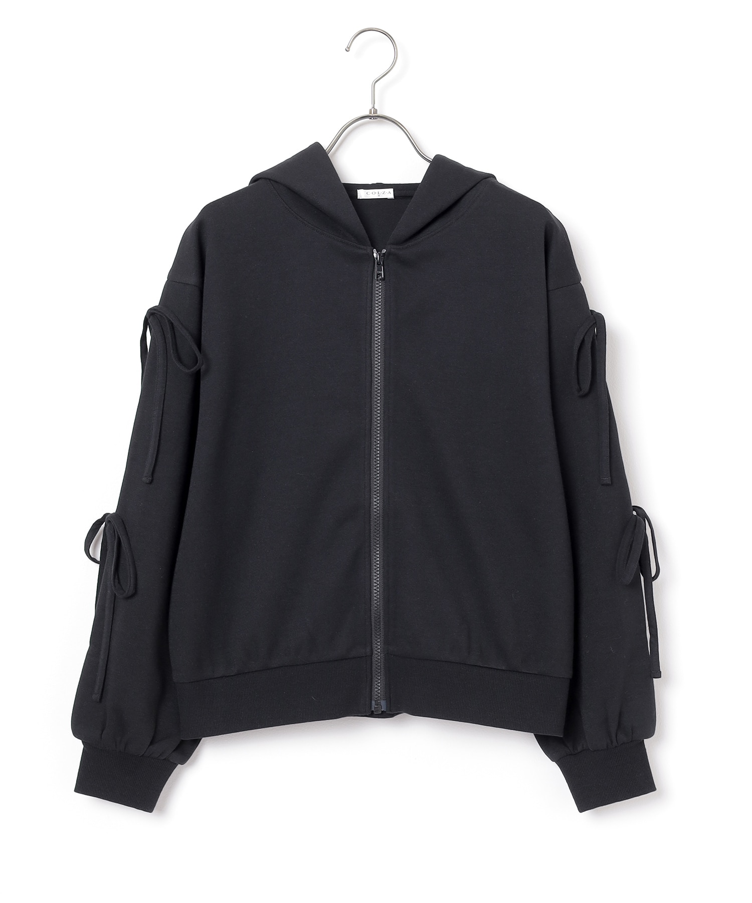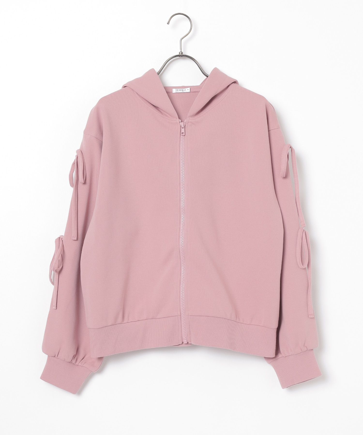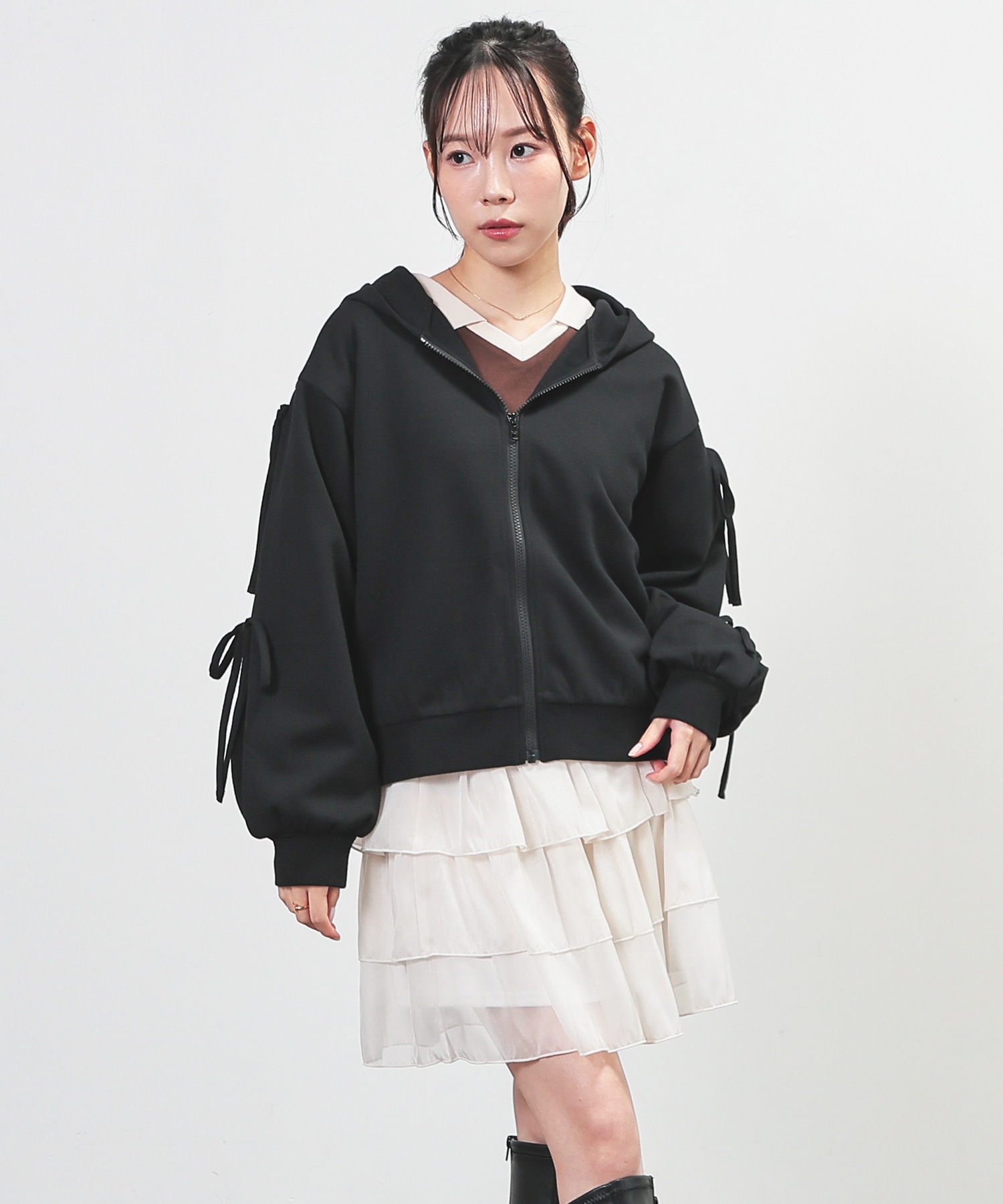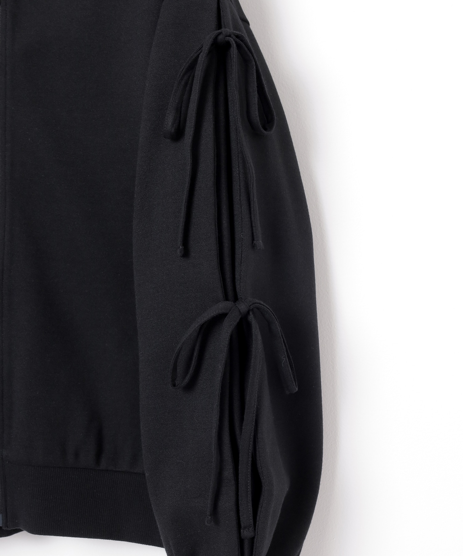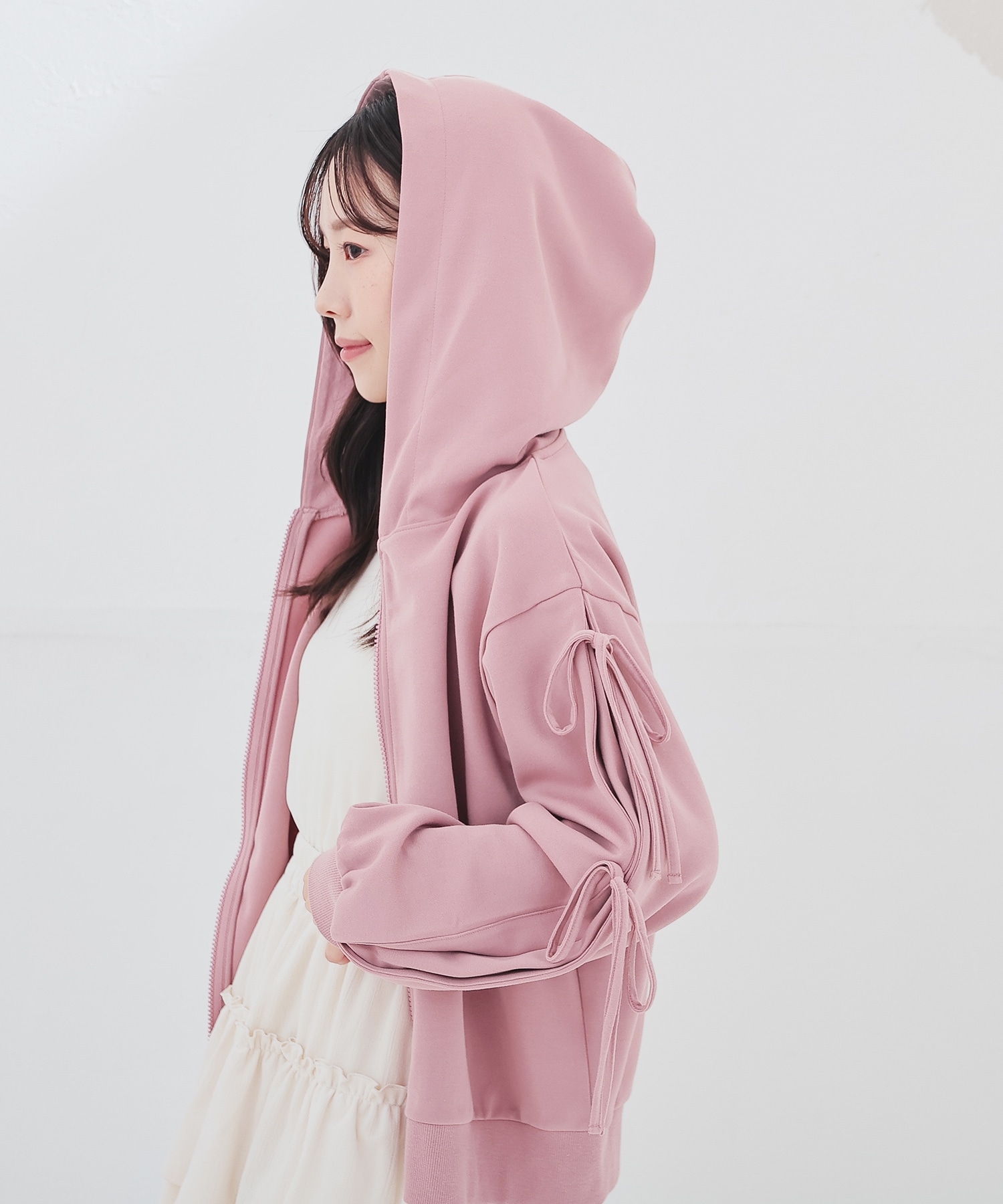 シンプルなジップパーカーの袖に、甘すぎない同色リボンをプラスしたキュートなデザイン。