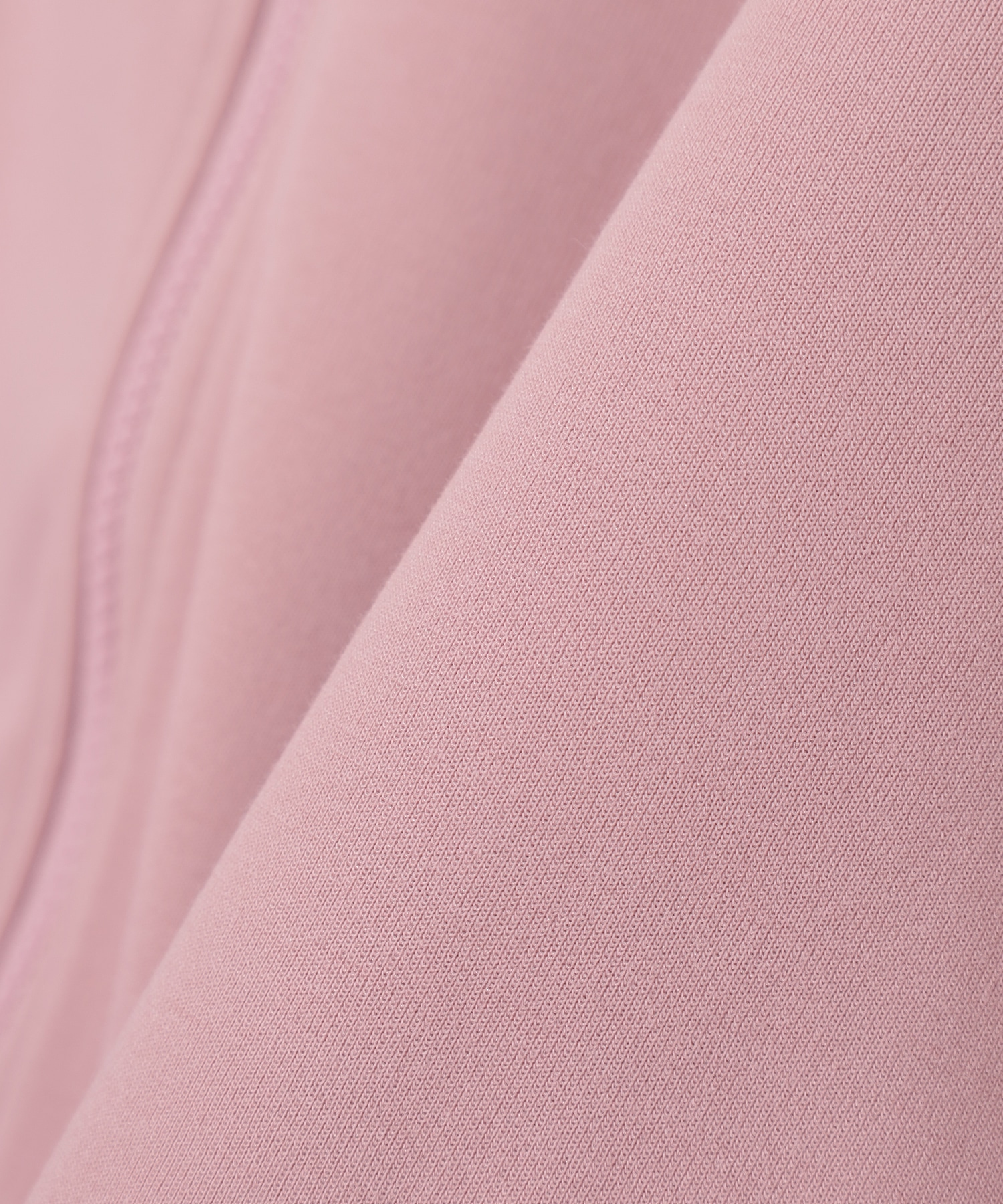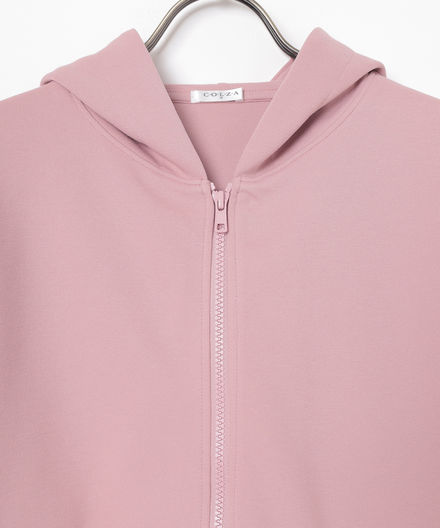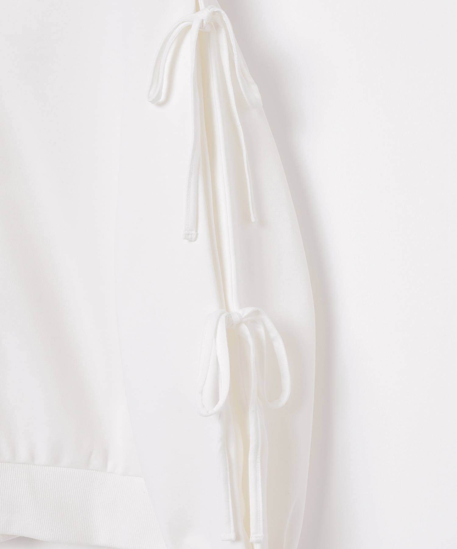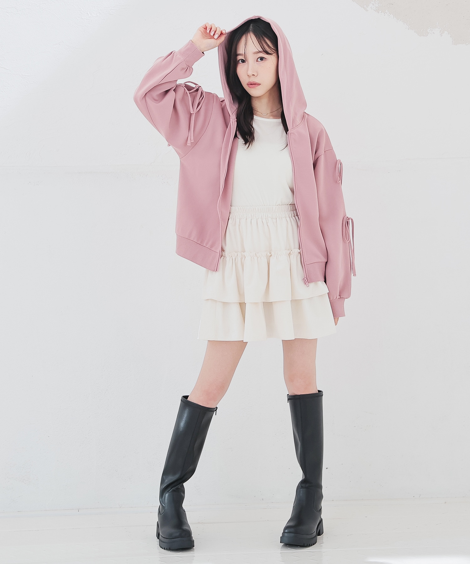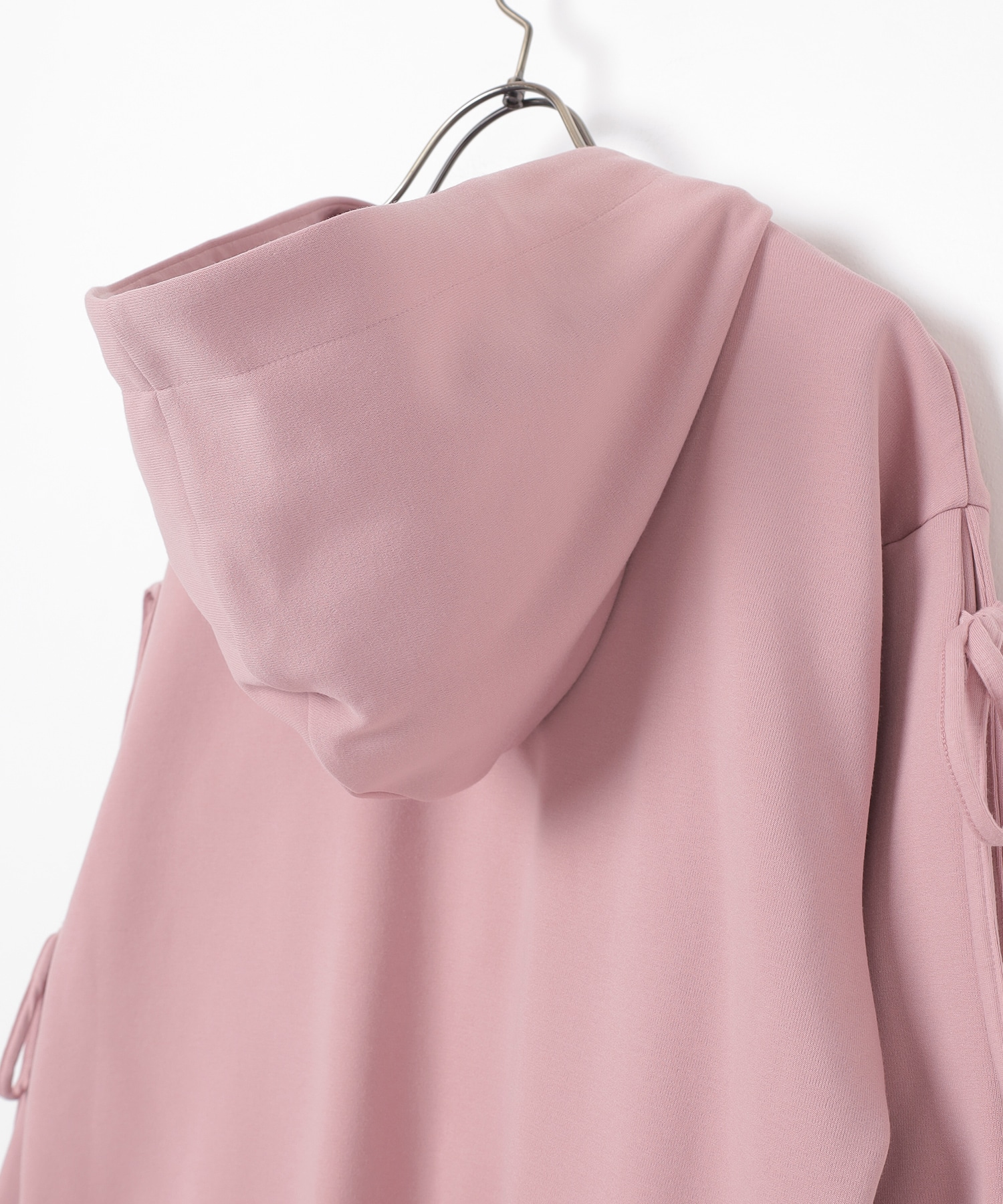 シンプルなジップパーカーの袖に、甘すぎない同色リボンをプラスしたキュートなデザイン。