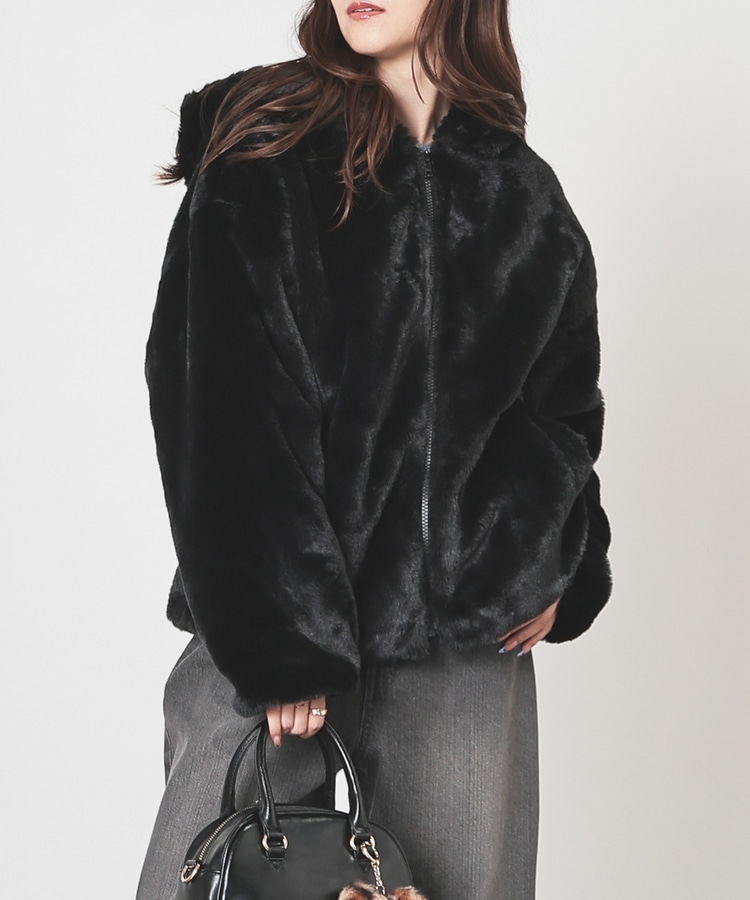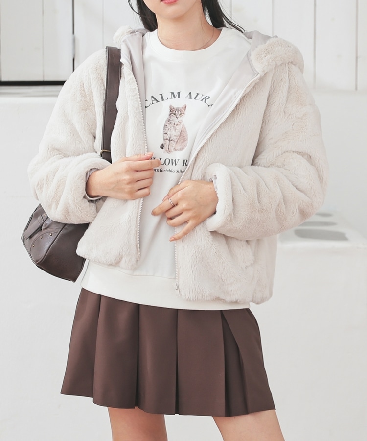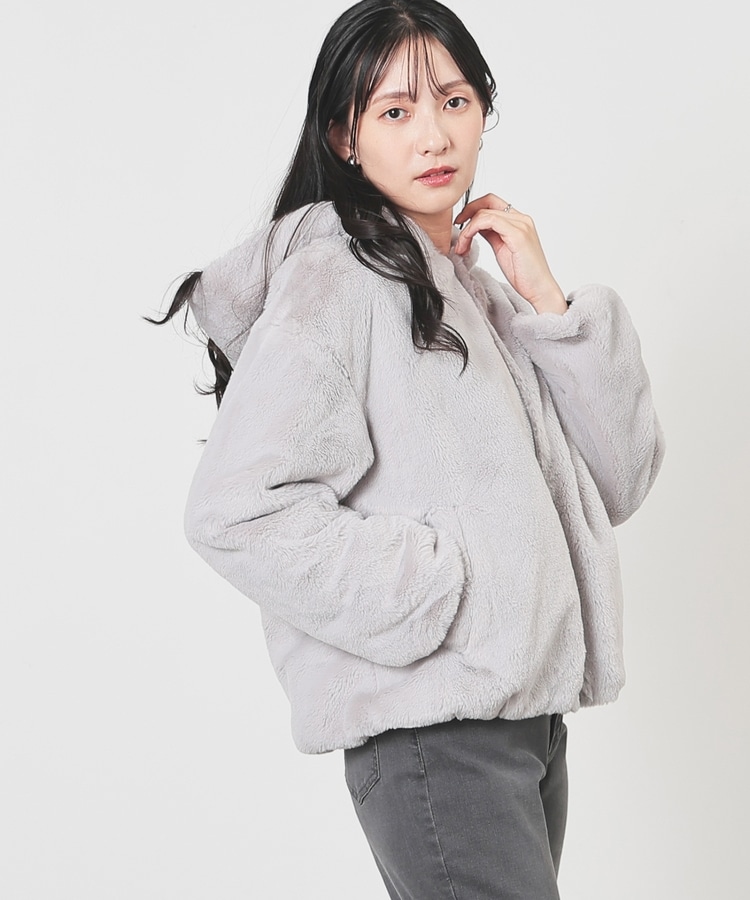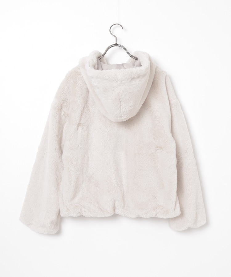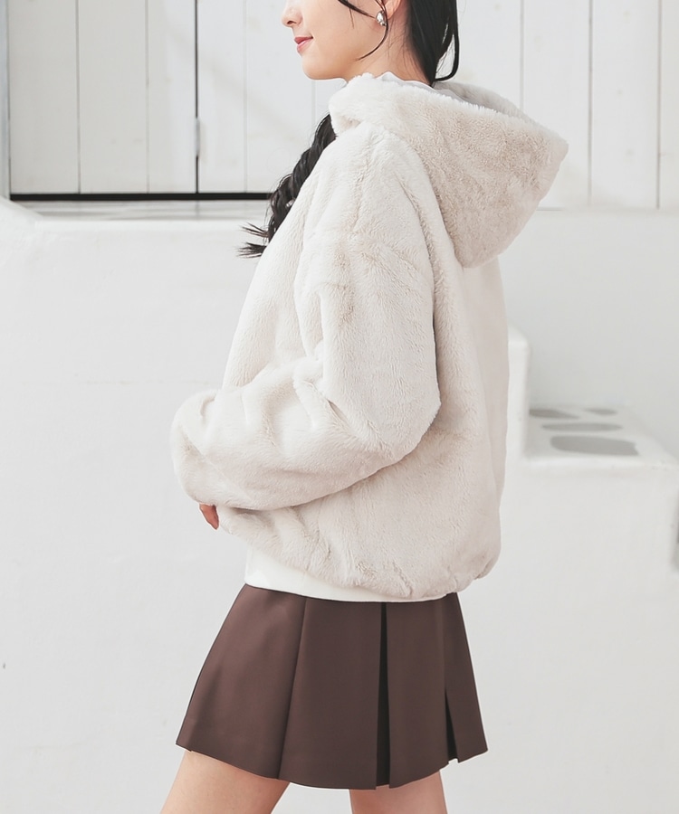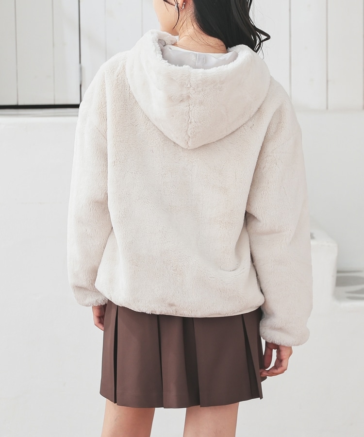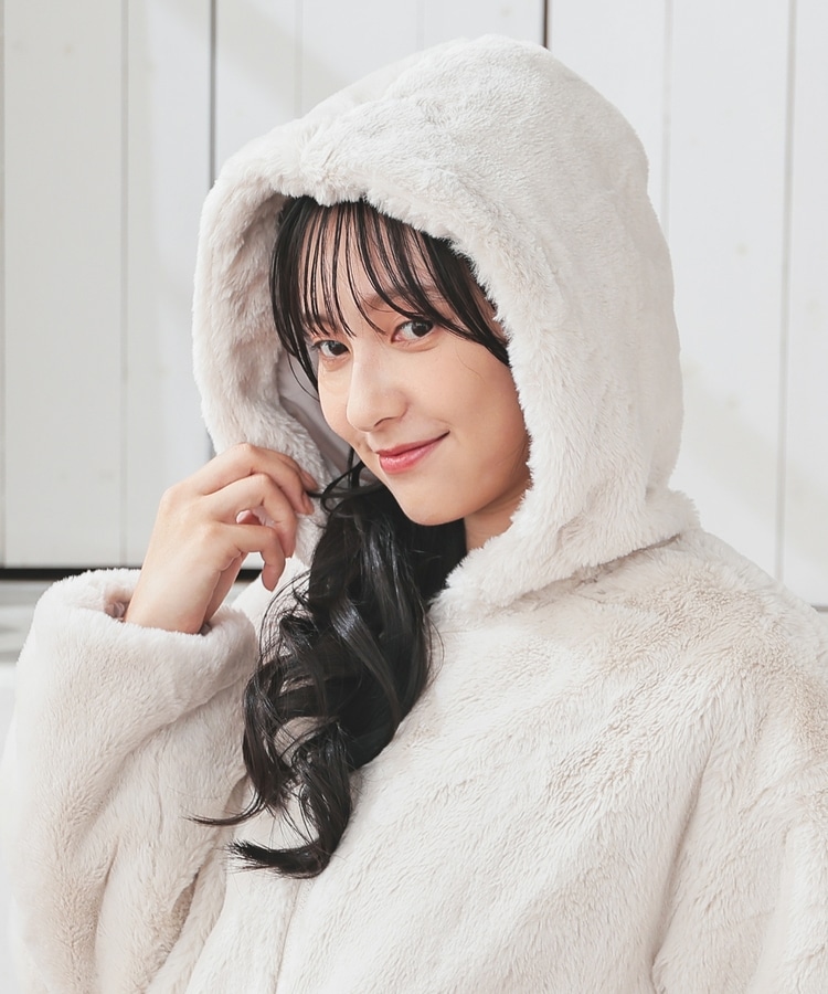 シーズンムードたっぷりなふわもこの、小顔効果も期待できるフード付きデザイン。