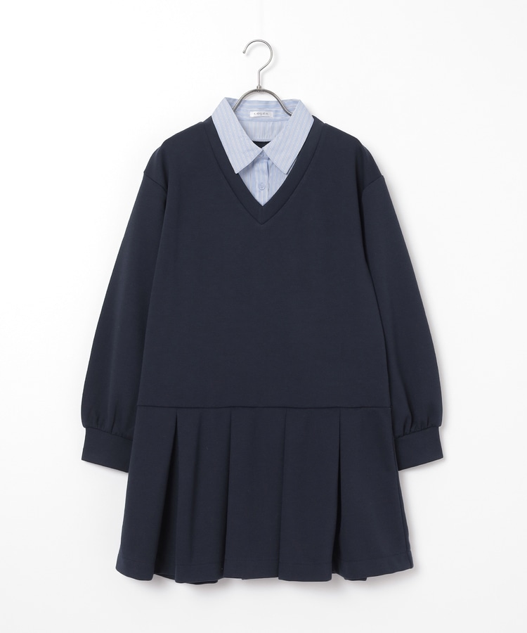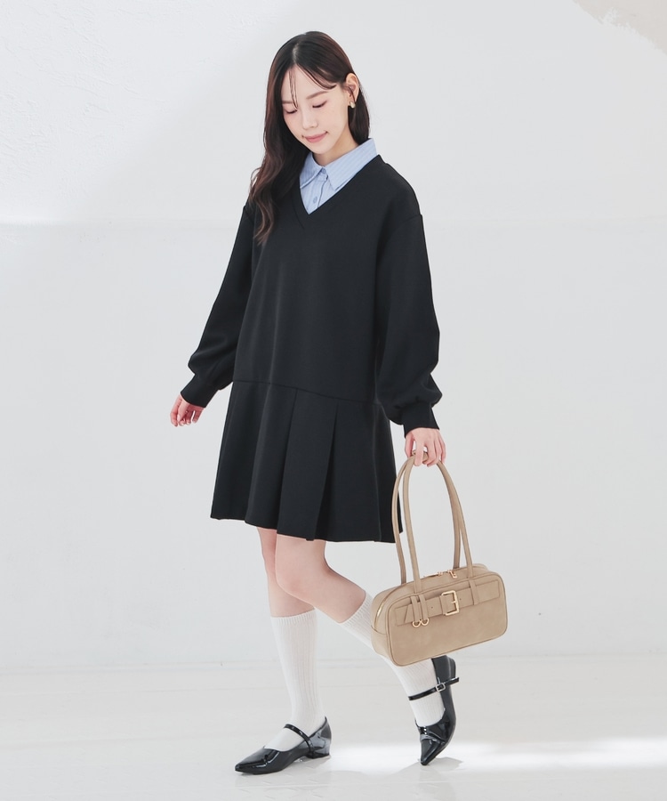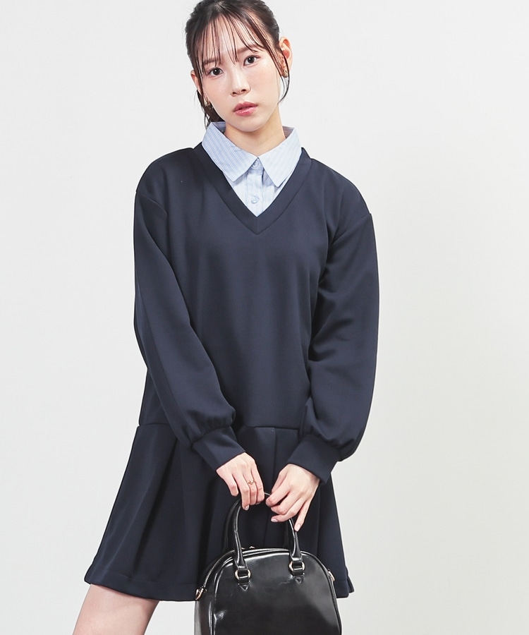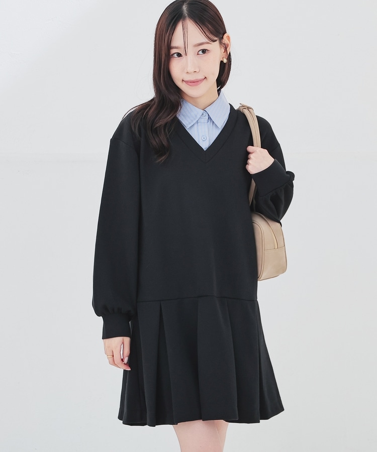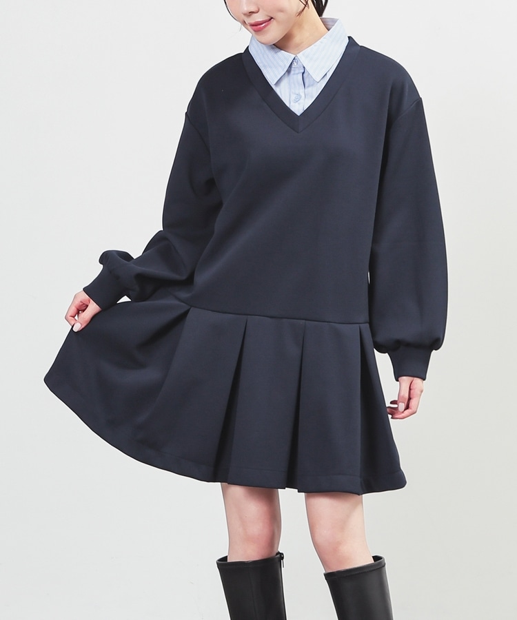 きちんと感のあるレギュラーカラーのシャツ衿とプリーツワンピースをドッキングしたレイヤード風デザイン。
