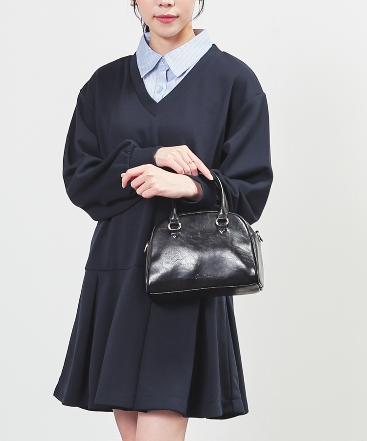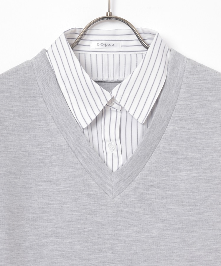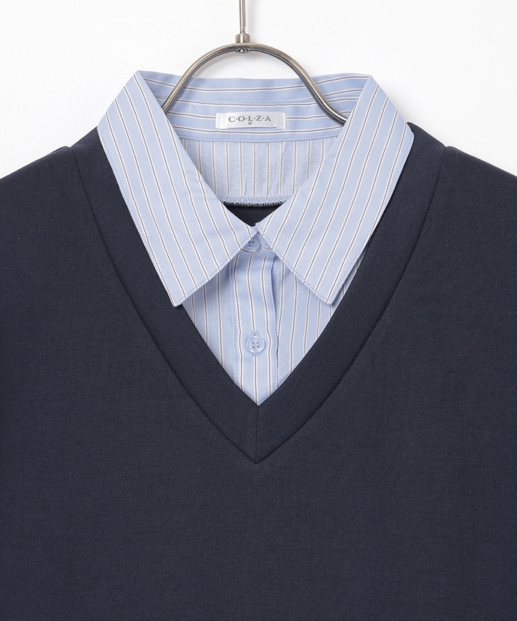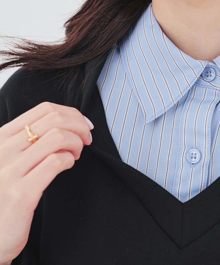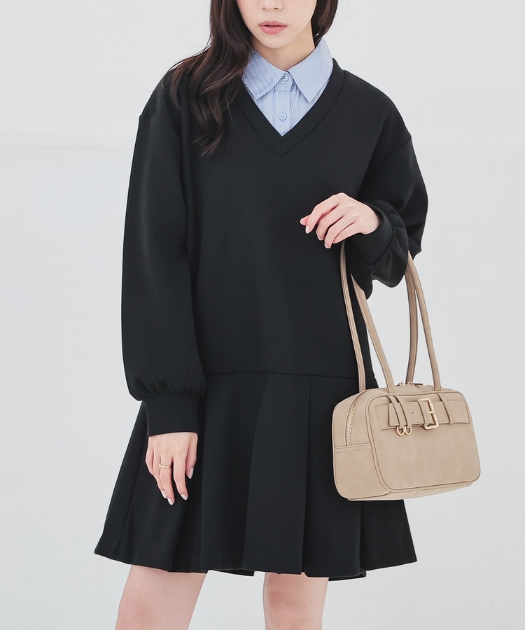 きちんと感のあるレギュラーカラーのシャツ衿とプリーツワンピースをドッキングしたレイヤード風デザイン。