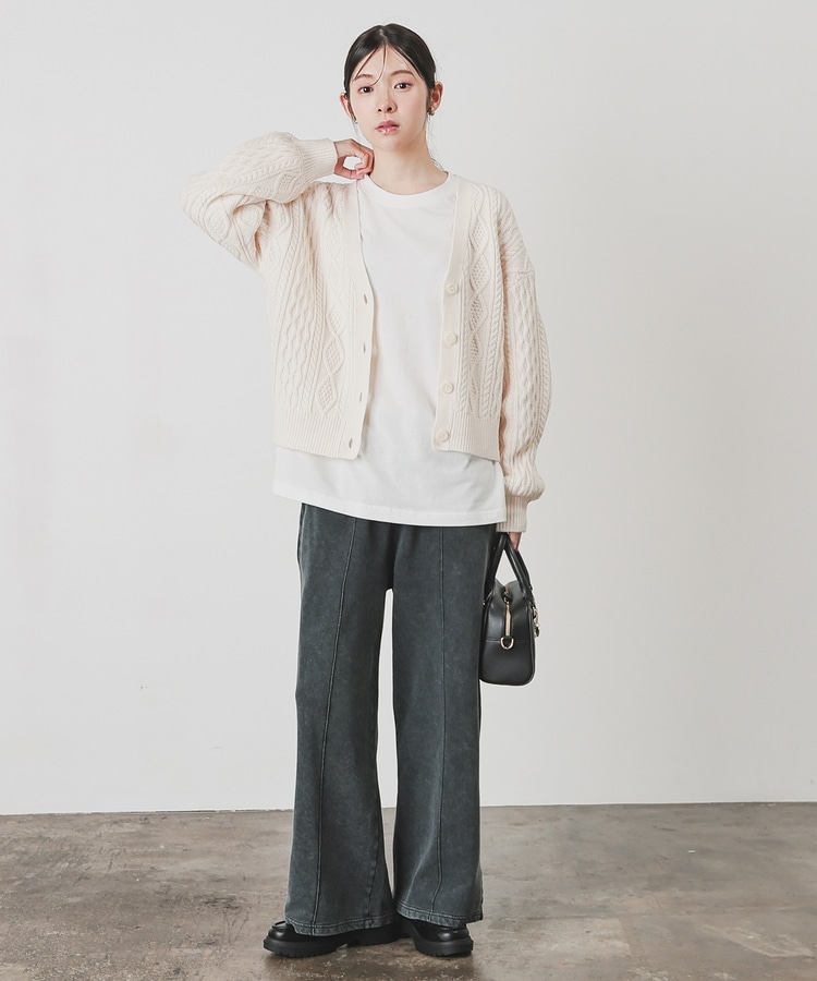 程よくゆったりとしたワイドシルエットで体のラインを拾いすぎず、体型もカバー。