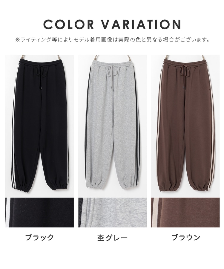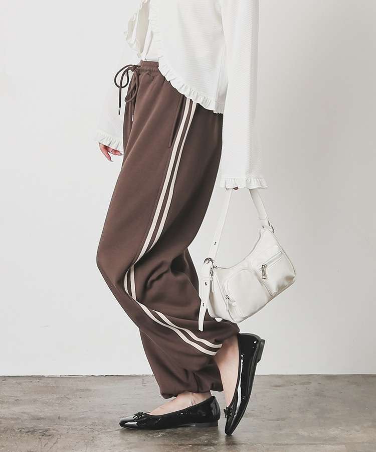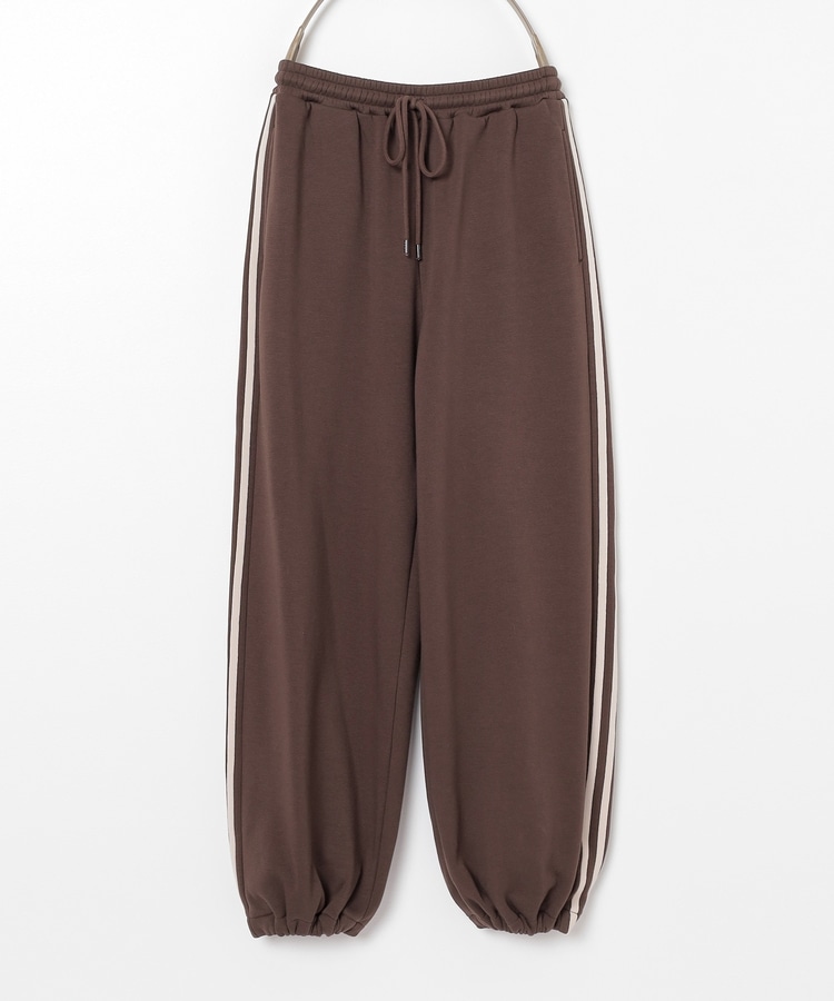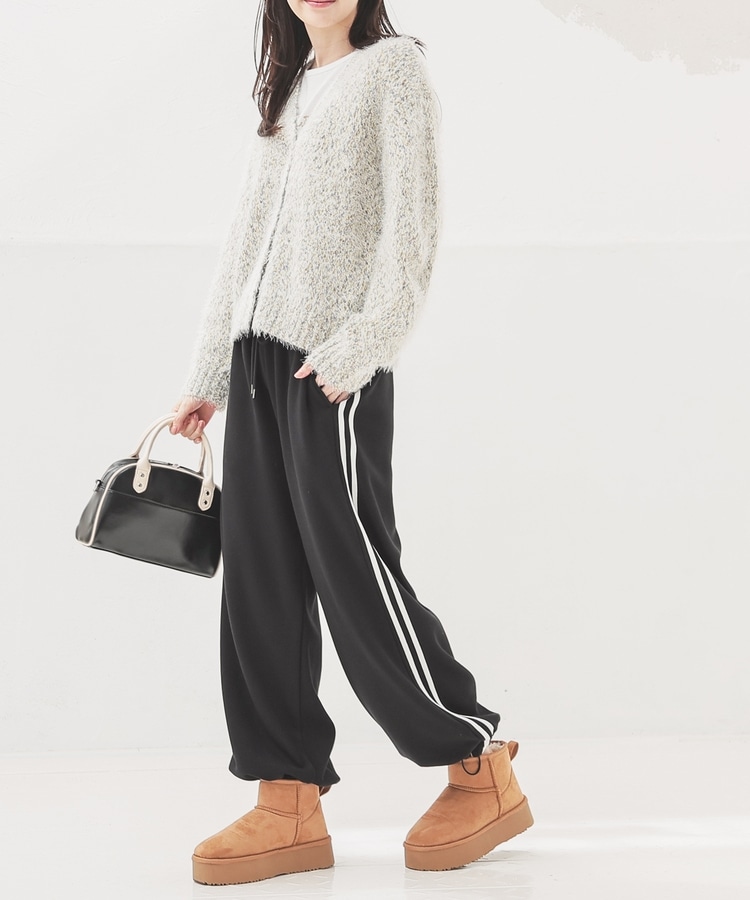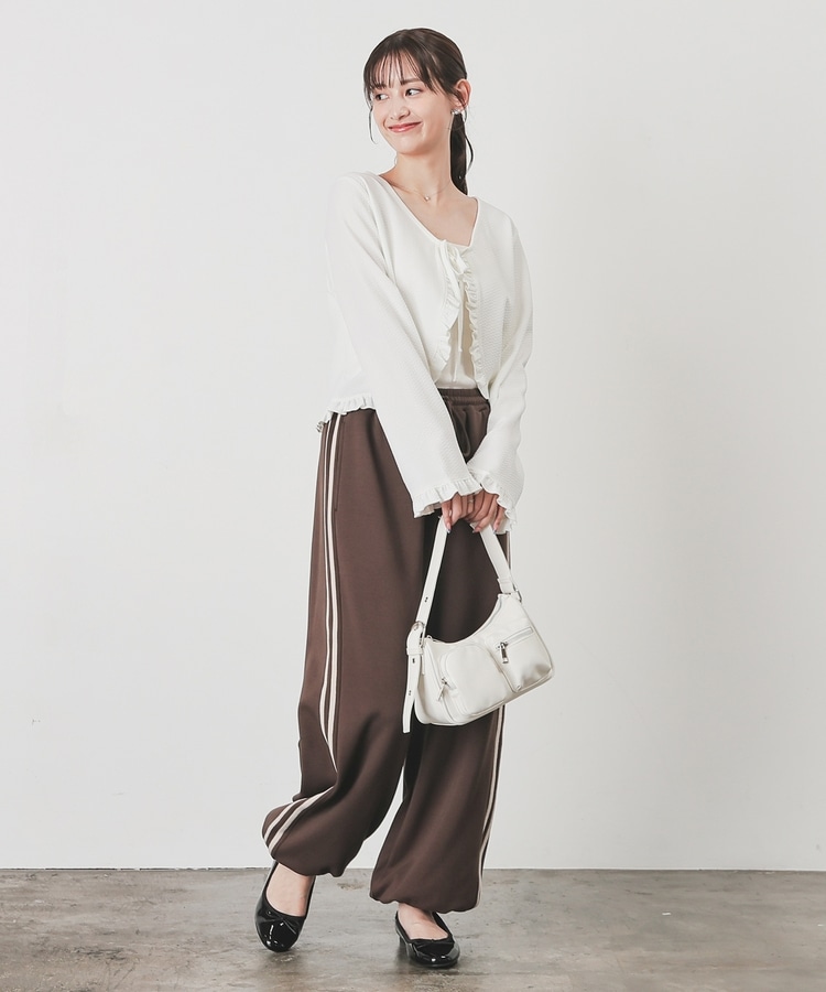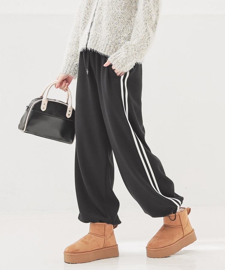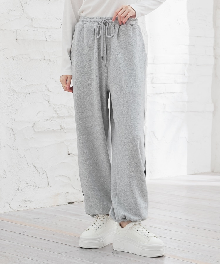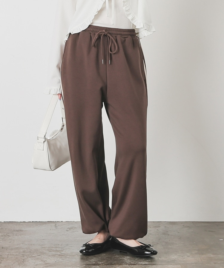 裾のドロストコードを緩めてストレートパンツとしても着用可能。