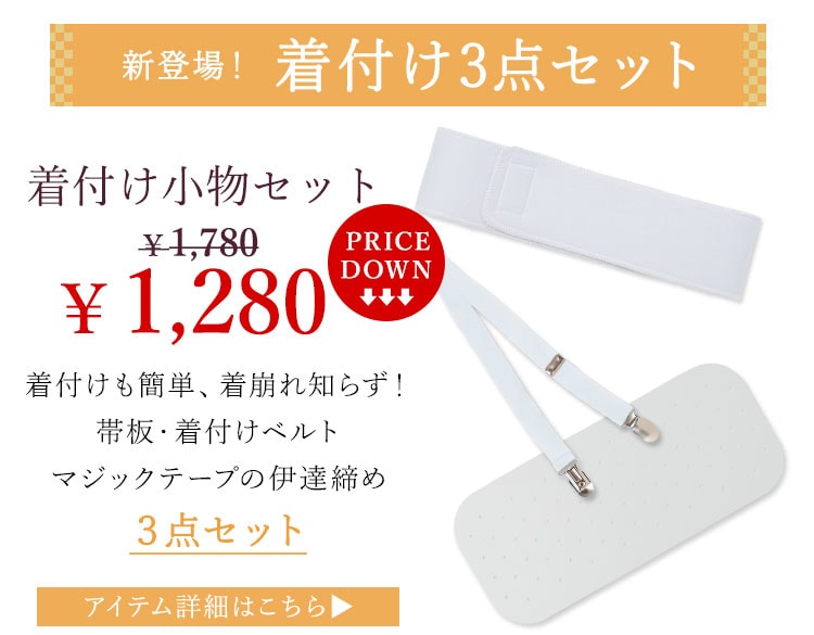 浴衣の着付けにあると便利な小物が揃った、前板・伊達締め・着付ベルトの3点セット。