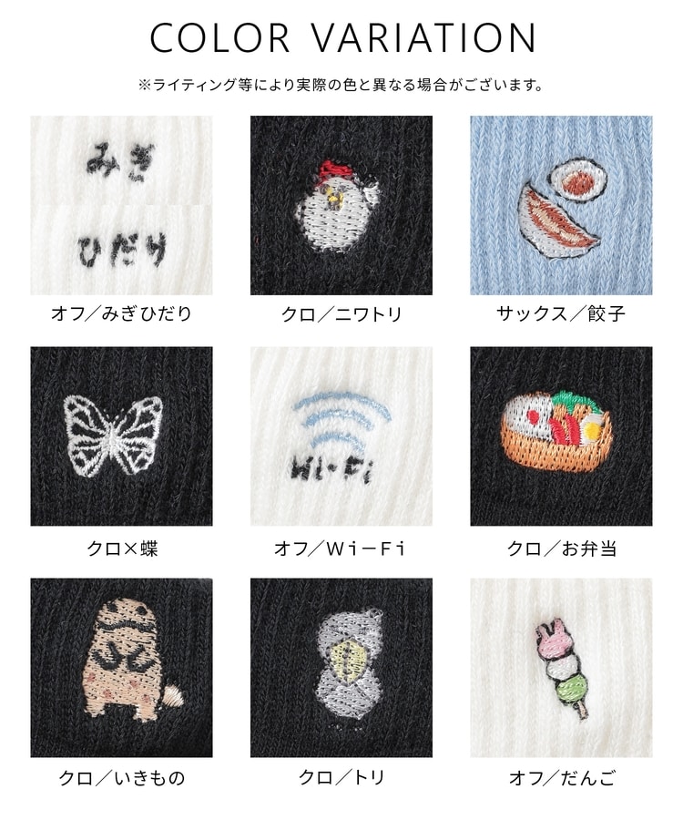 食べ物やアニマルなどのほっこりユニークなワンポイント刺繍。