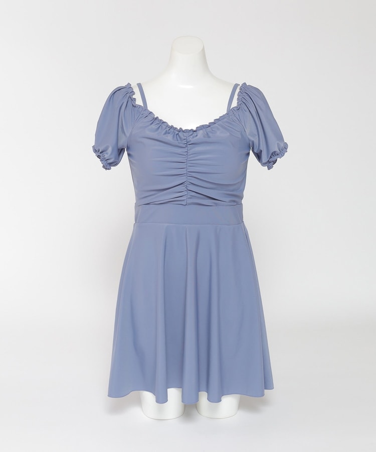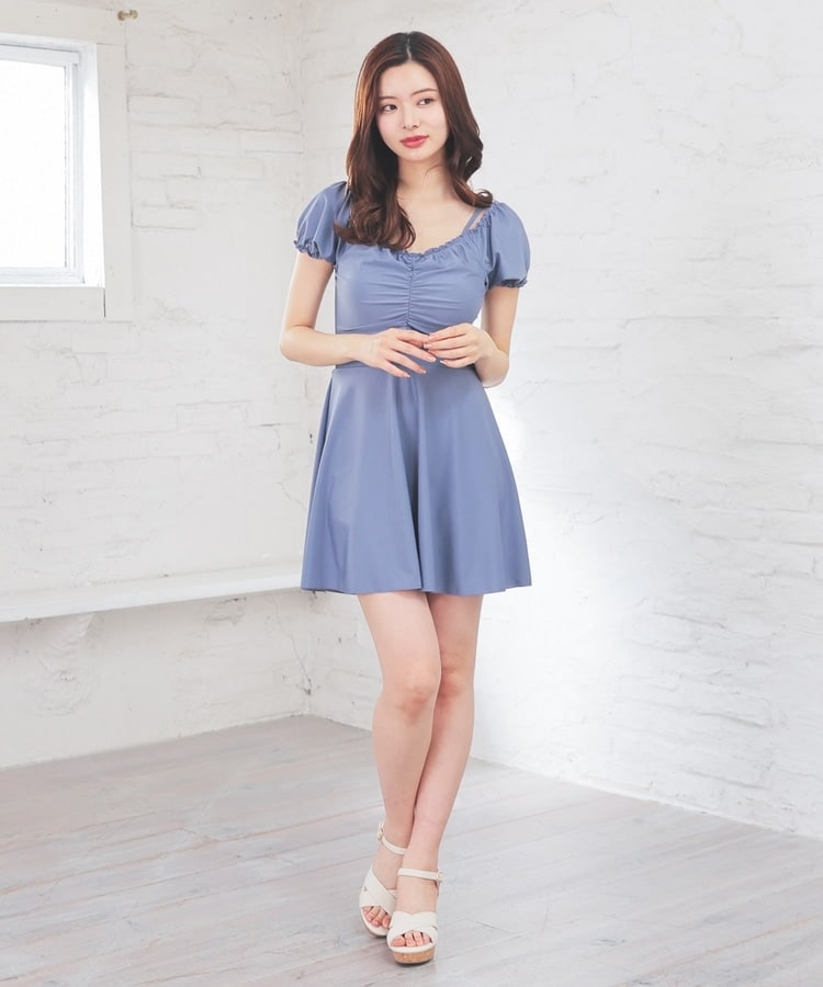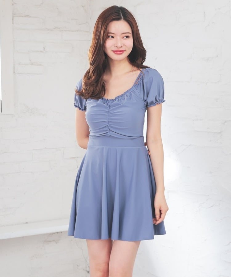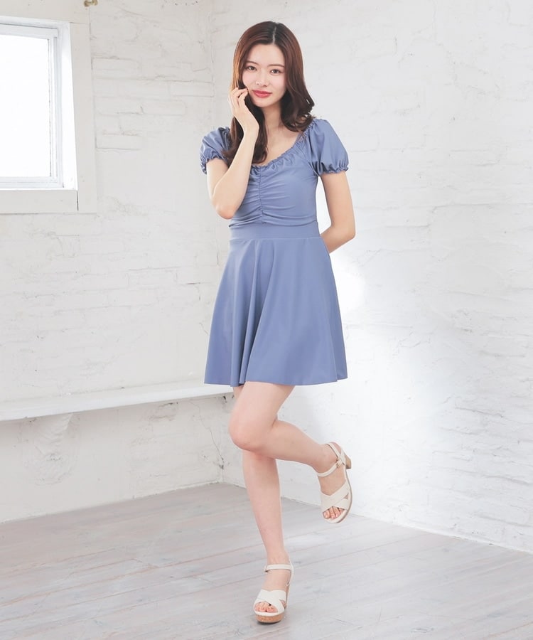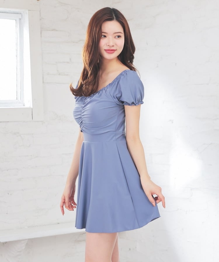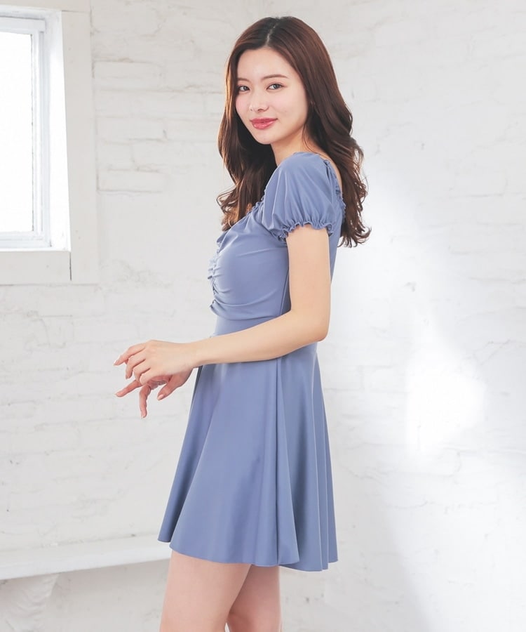 ふんわり広がるフレアシルエットに、胸元のギャザーがアクセント。