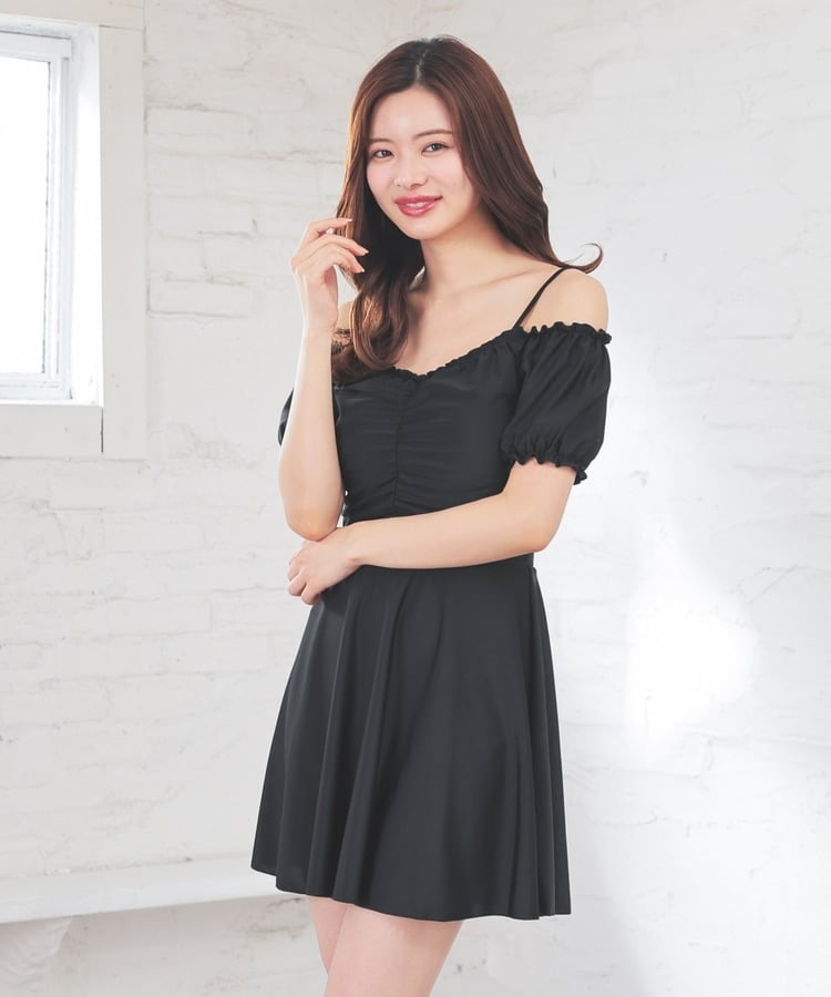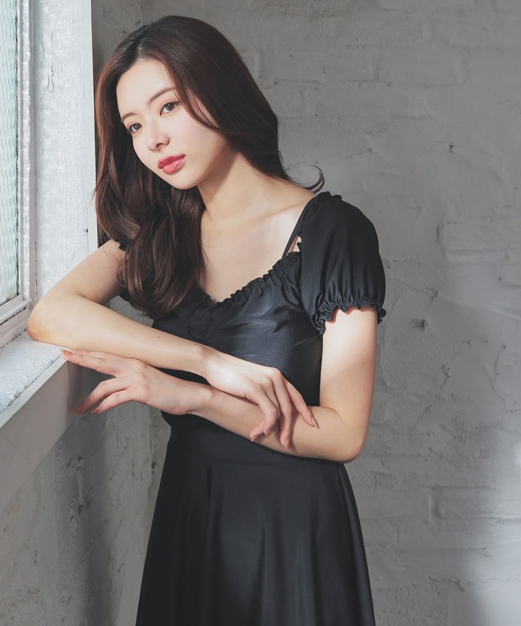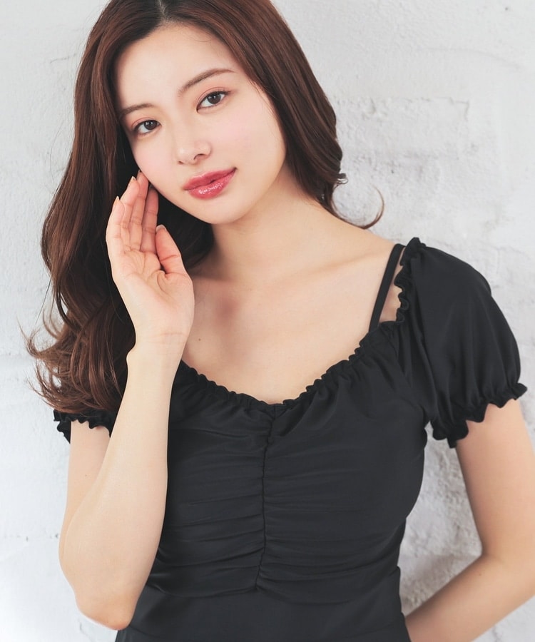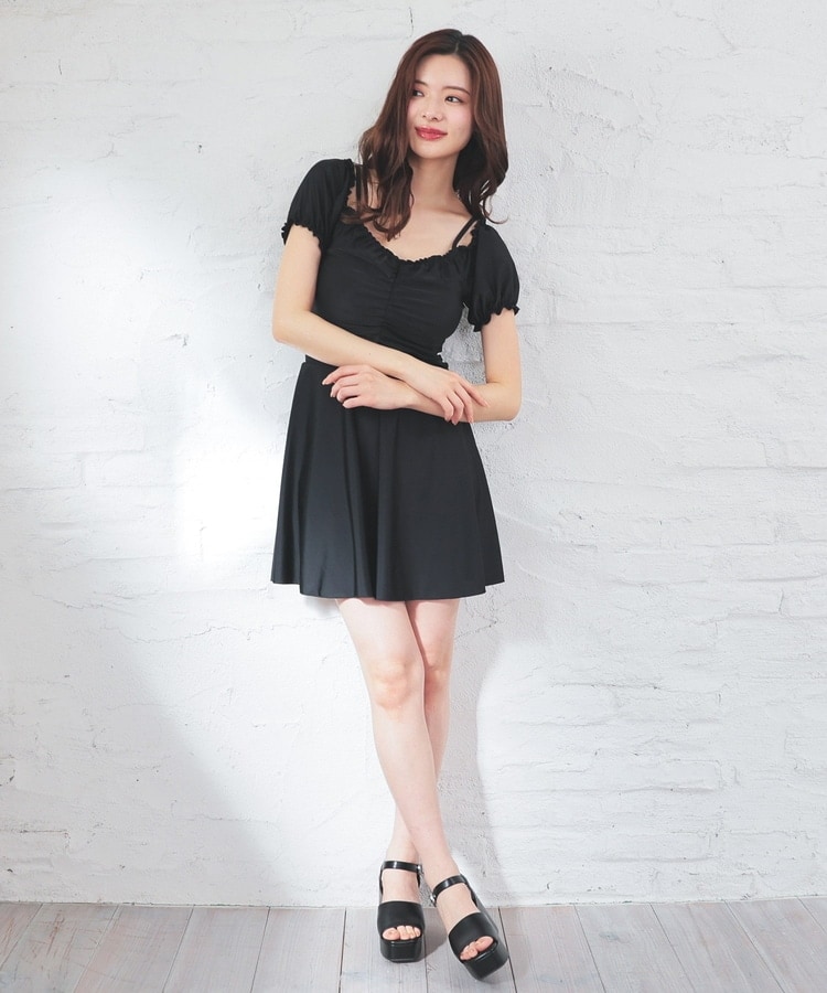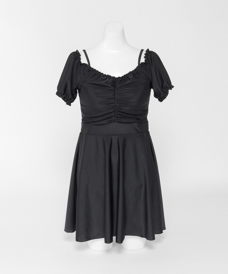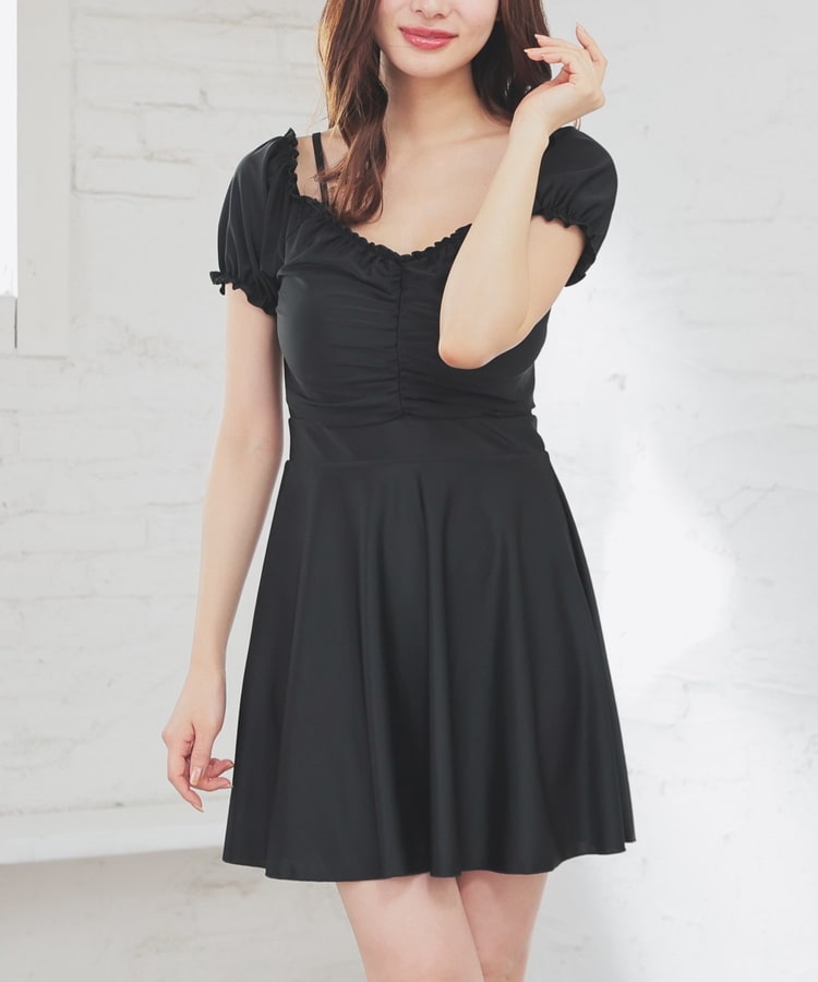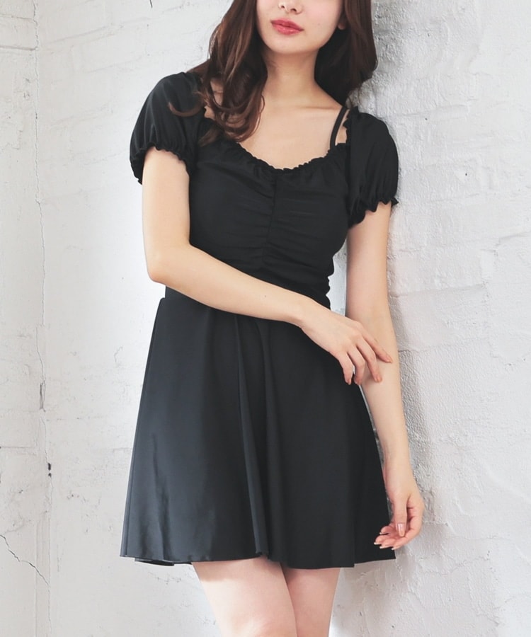 ふんわり広がるフレアシルエットに、胸元のギャザーがアクセント。