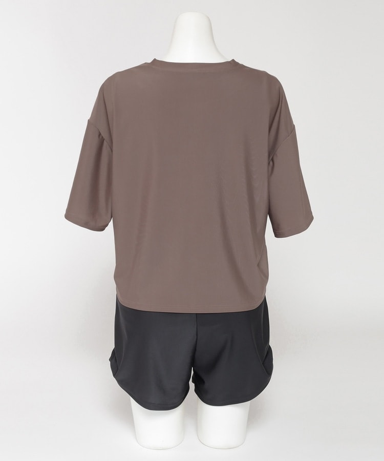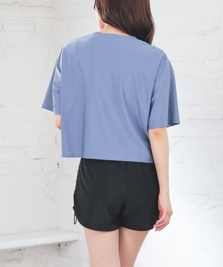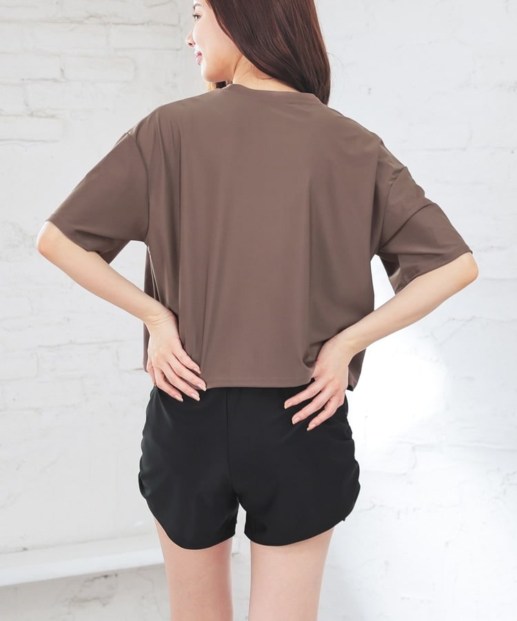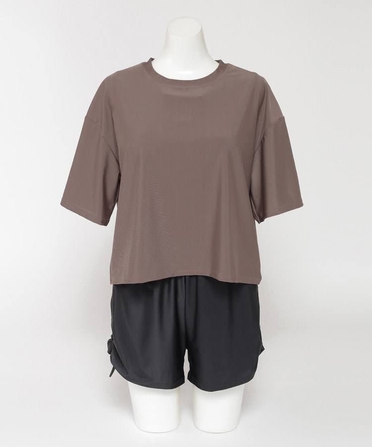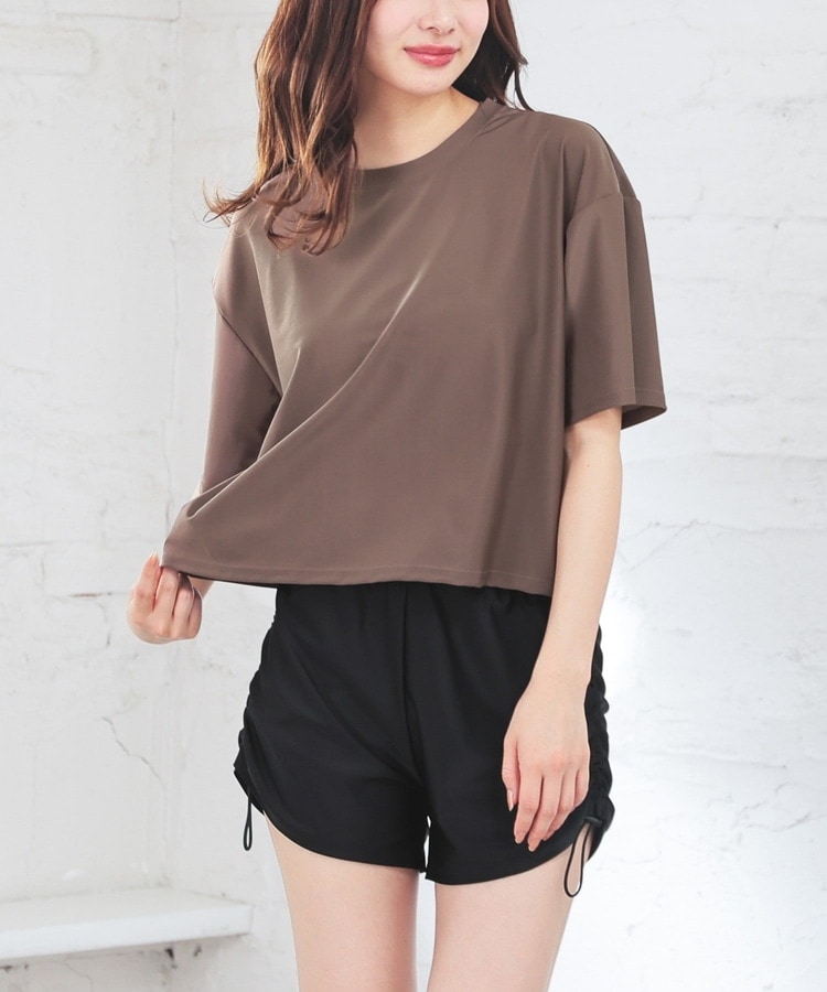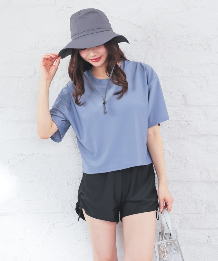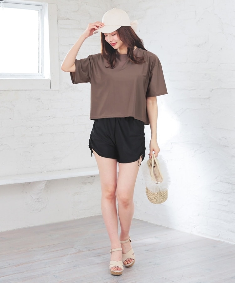 Tシャツは日焼け対策にもおすすめの半袖タイプで、オシャレしながら体型カバーも◎