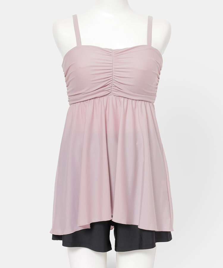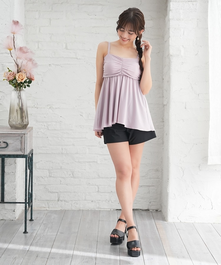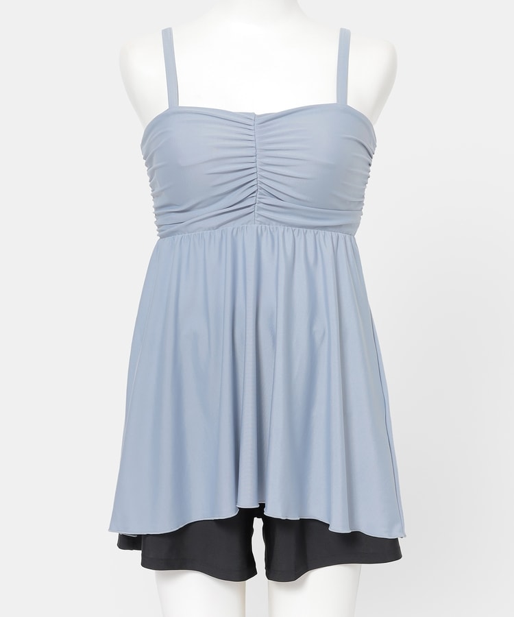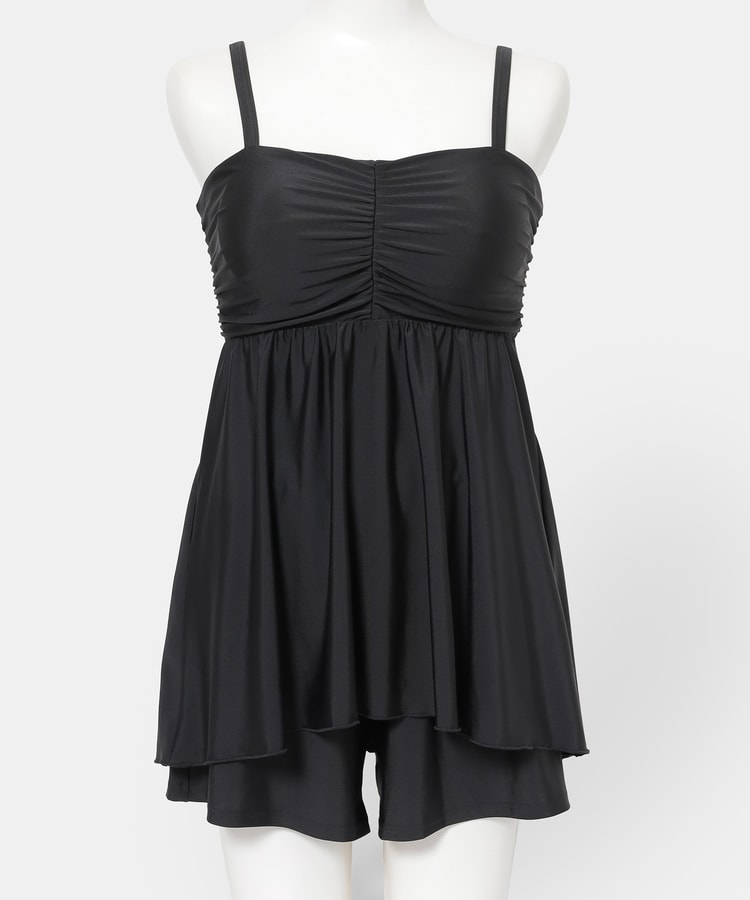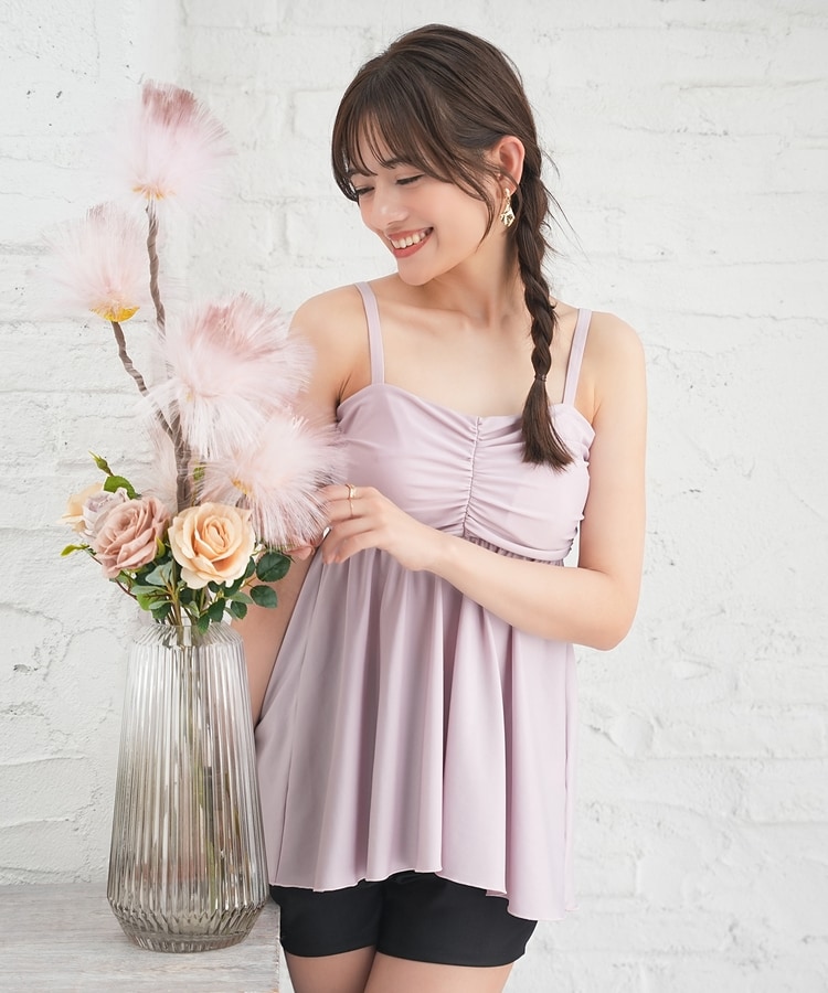 ふんわり広がるフレアシルエットに胸元のギャザーがアクセント。