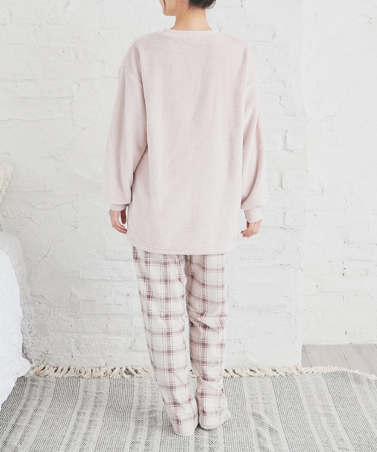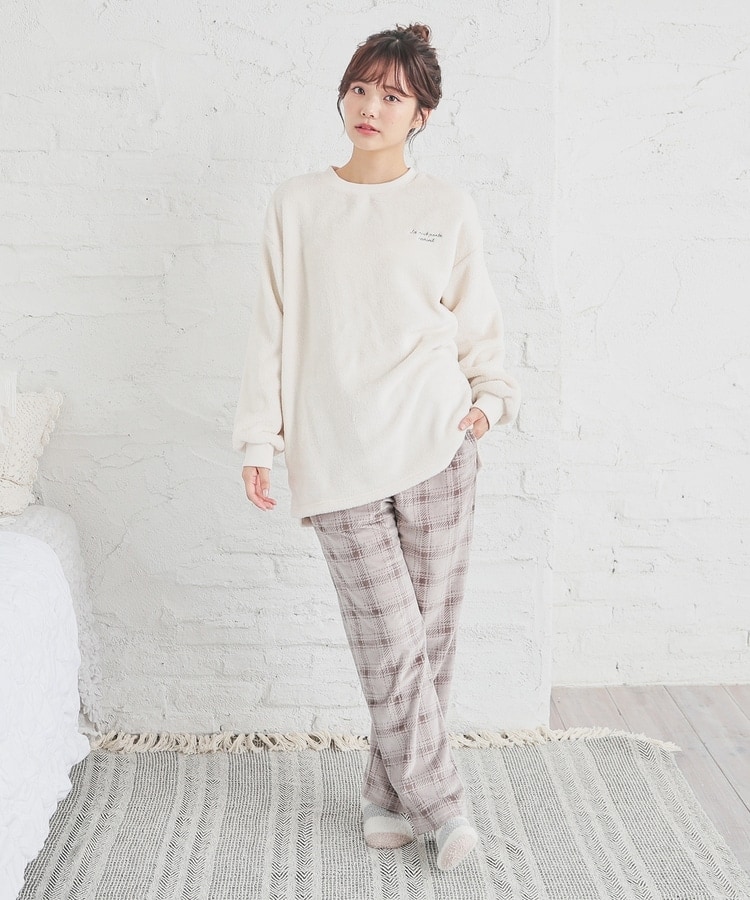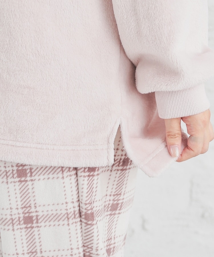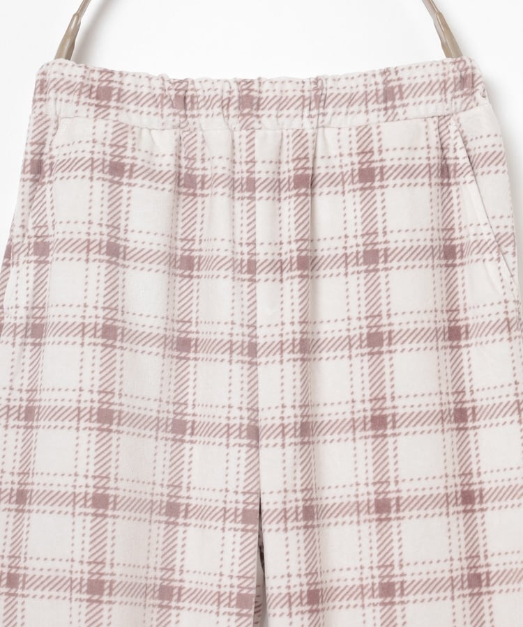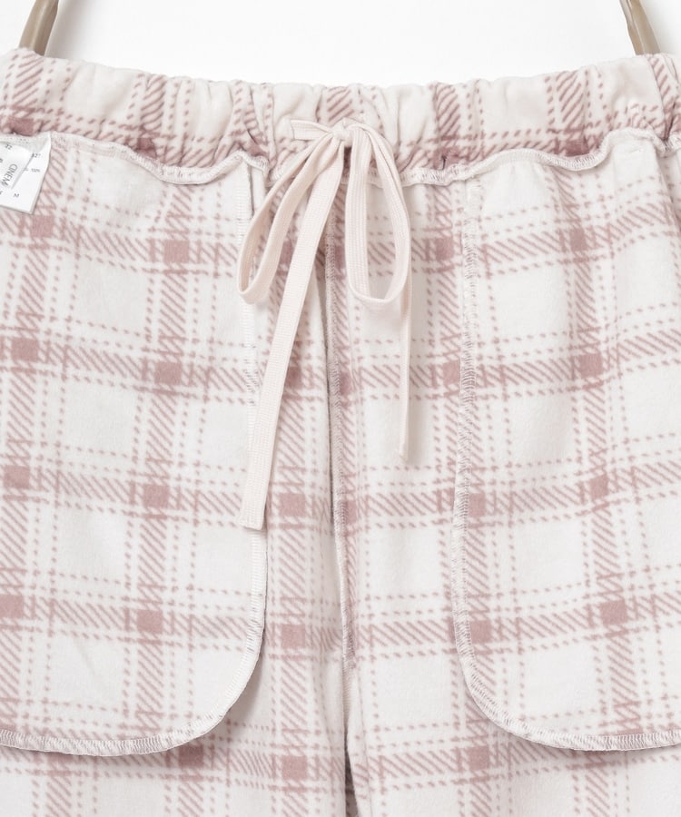 ボトムスは保温性抜群のフリース素材で、両サイドに便利なポケットと、ウエストにサイズ調整ができる紐付き。