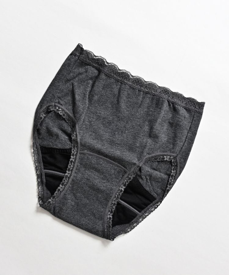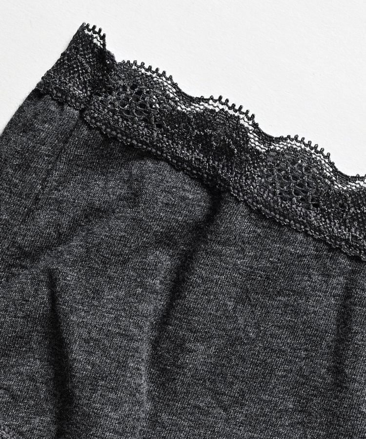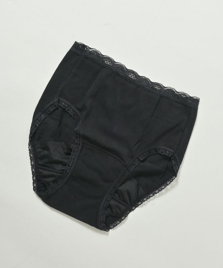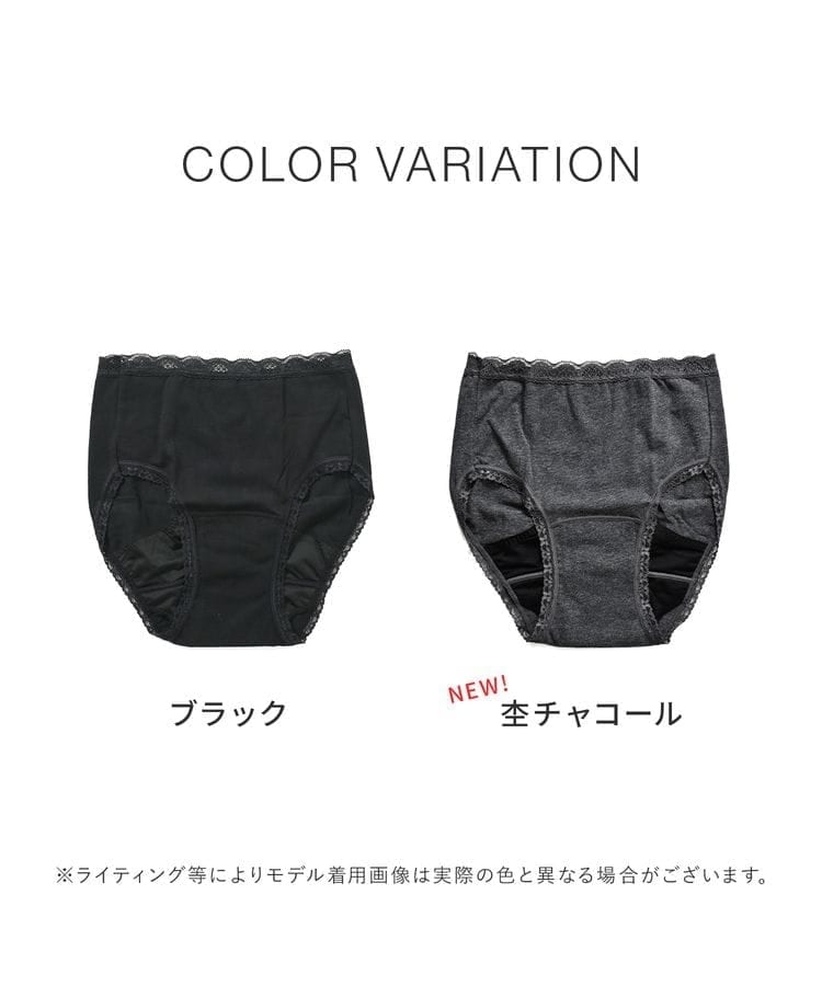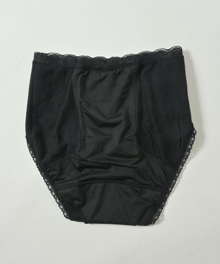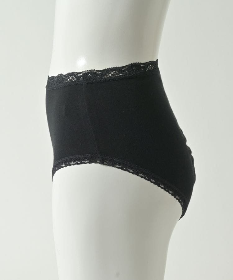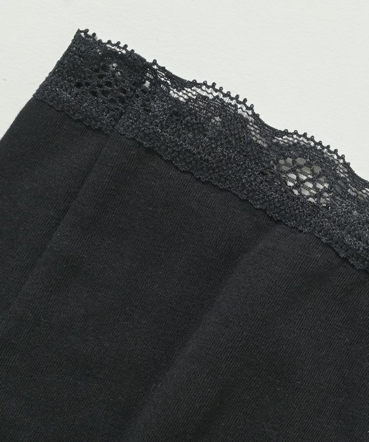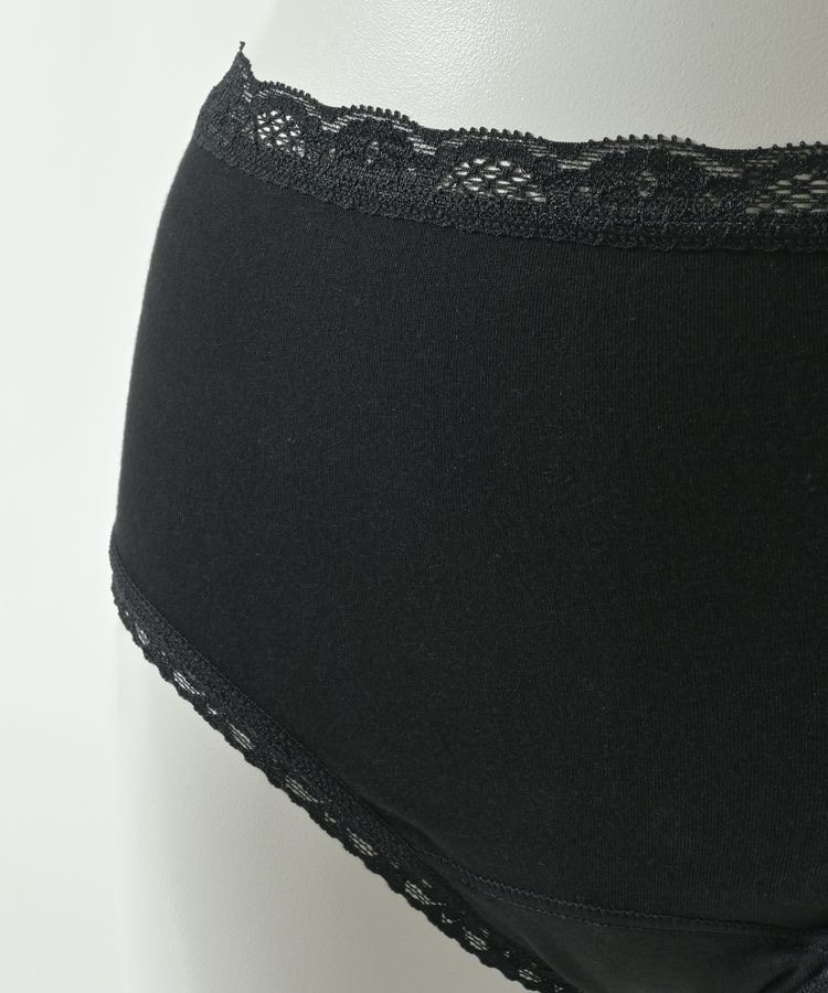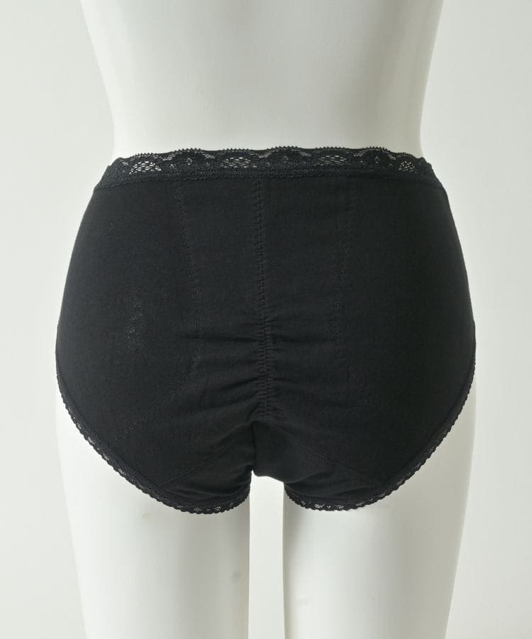 ウエスト・脚ぐりは締め付けず楽ちんなレース付きで、ボトムスにひびきにくいデザイン。
