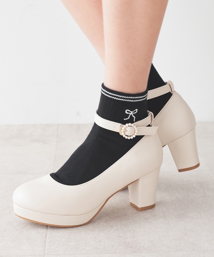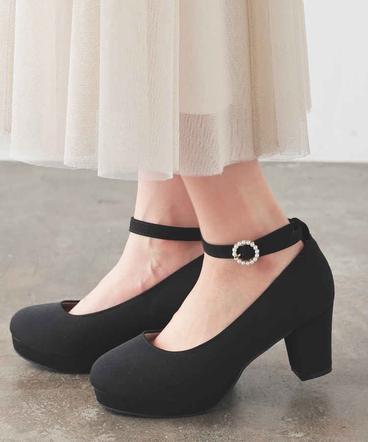 ストラップのバックルが、シンプルな角バックルとパールビジューバックルの2種類。