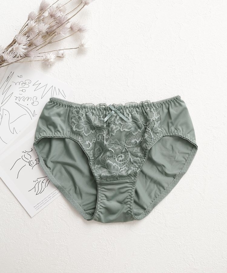 光沢感のある、フロントの花柄レースがフェミニンなショーツ。