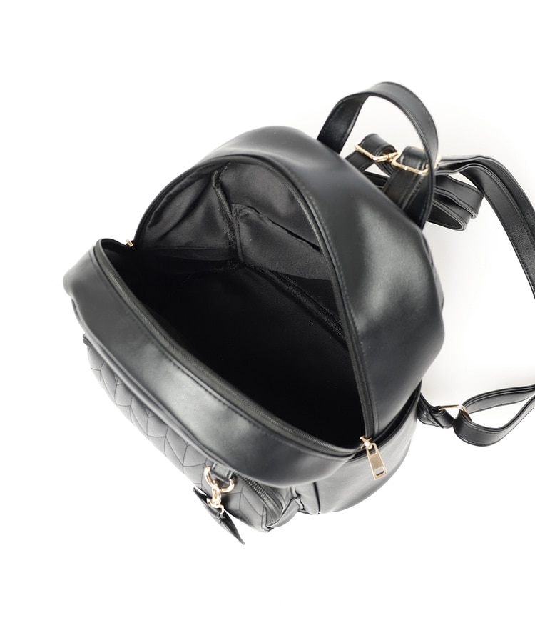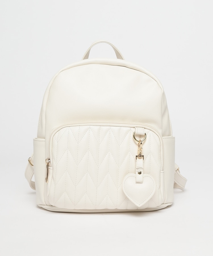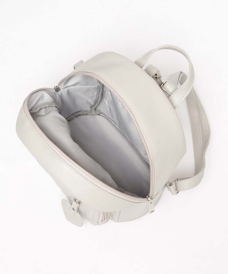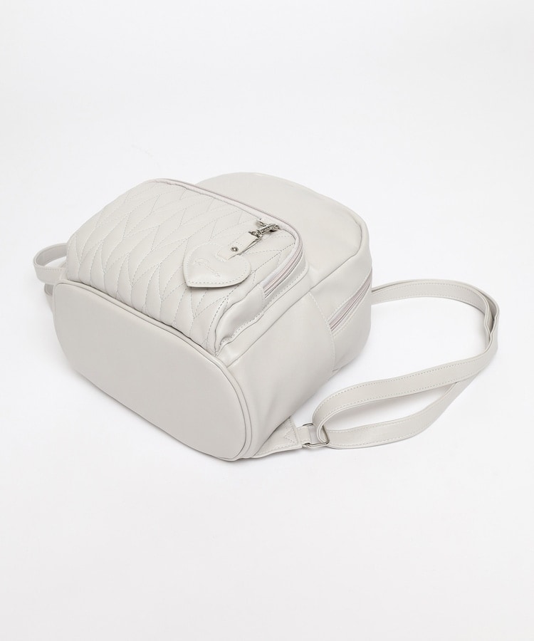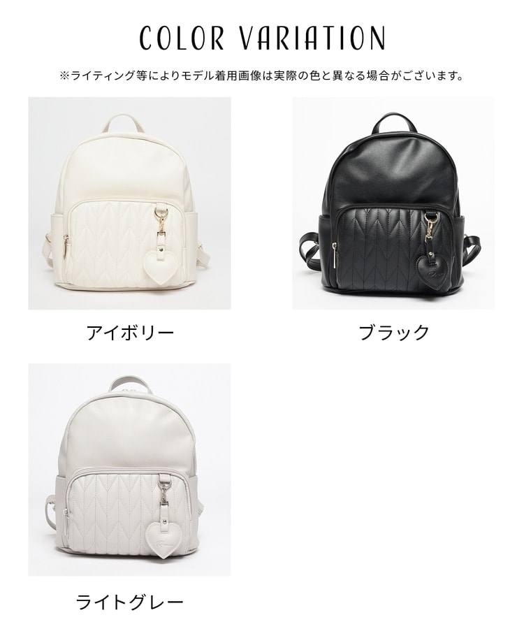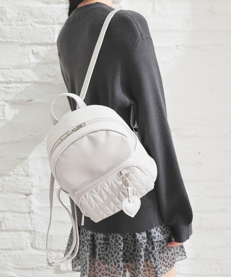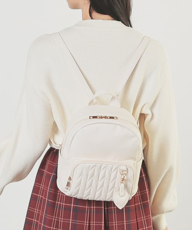 ポケットのステッチとハートモチーフのチャームがアクセント。