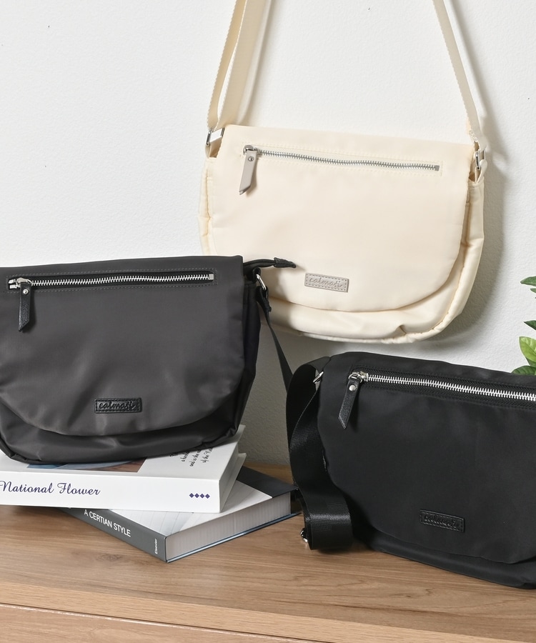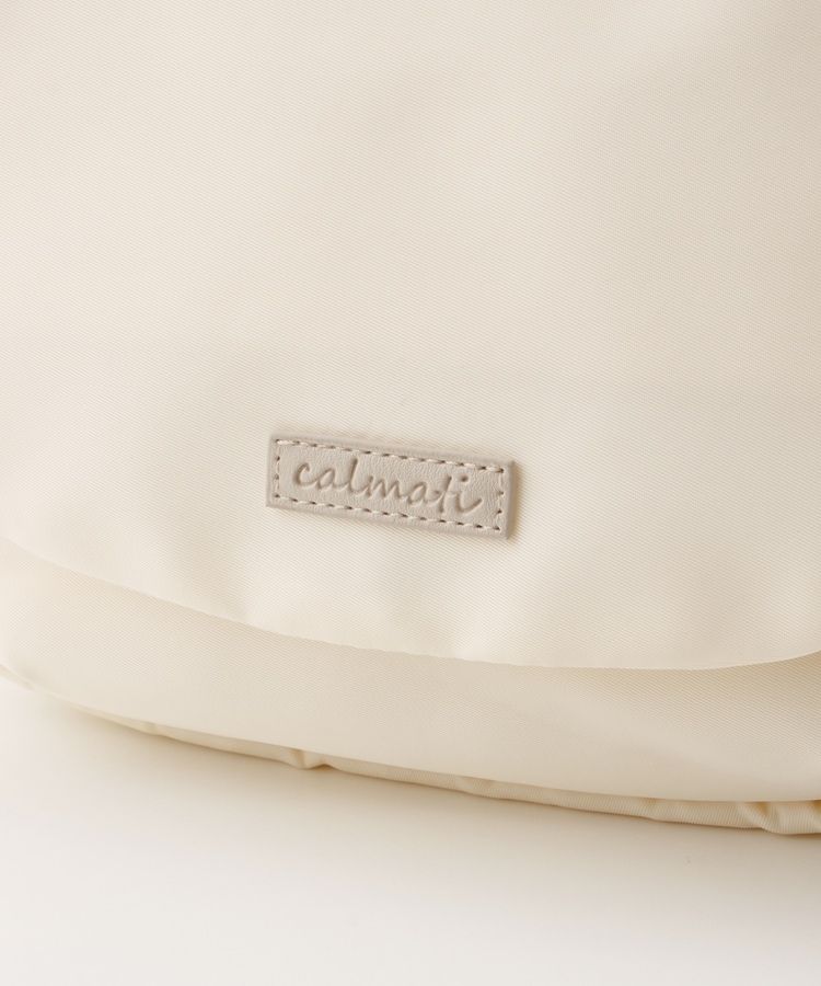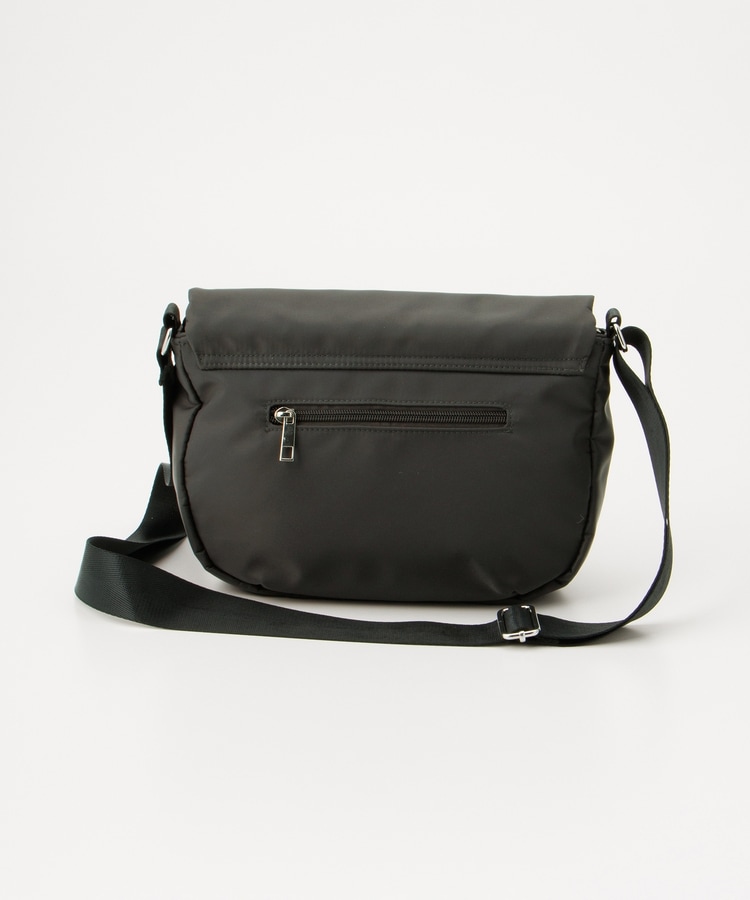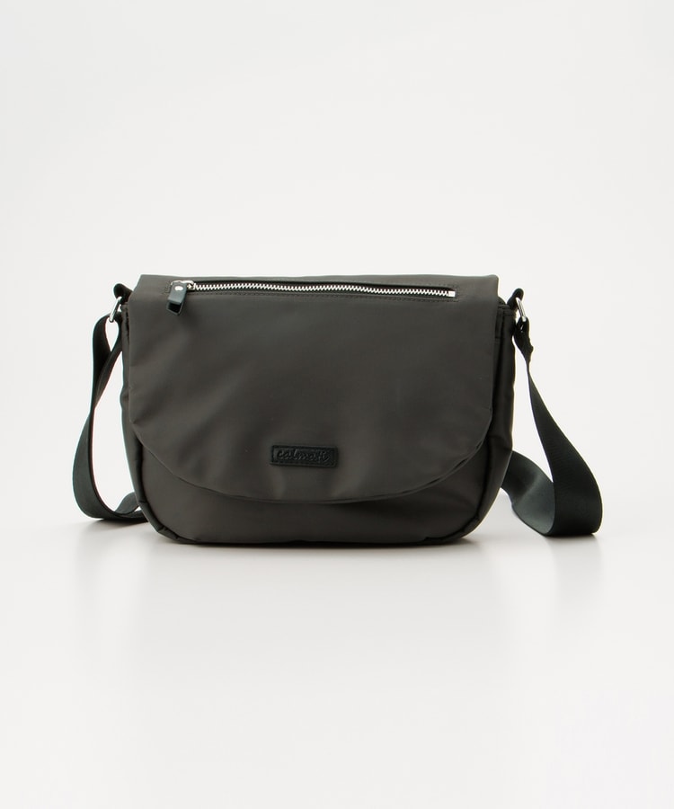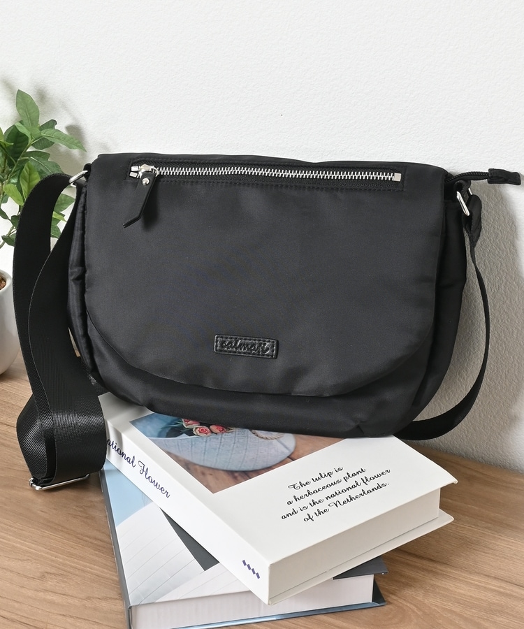 ファスナーポケットとプレート付きの、大きめフラップがアクセント。
