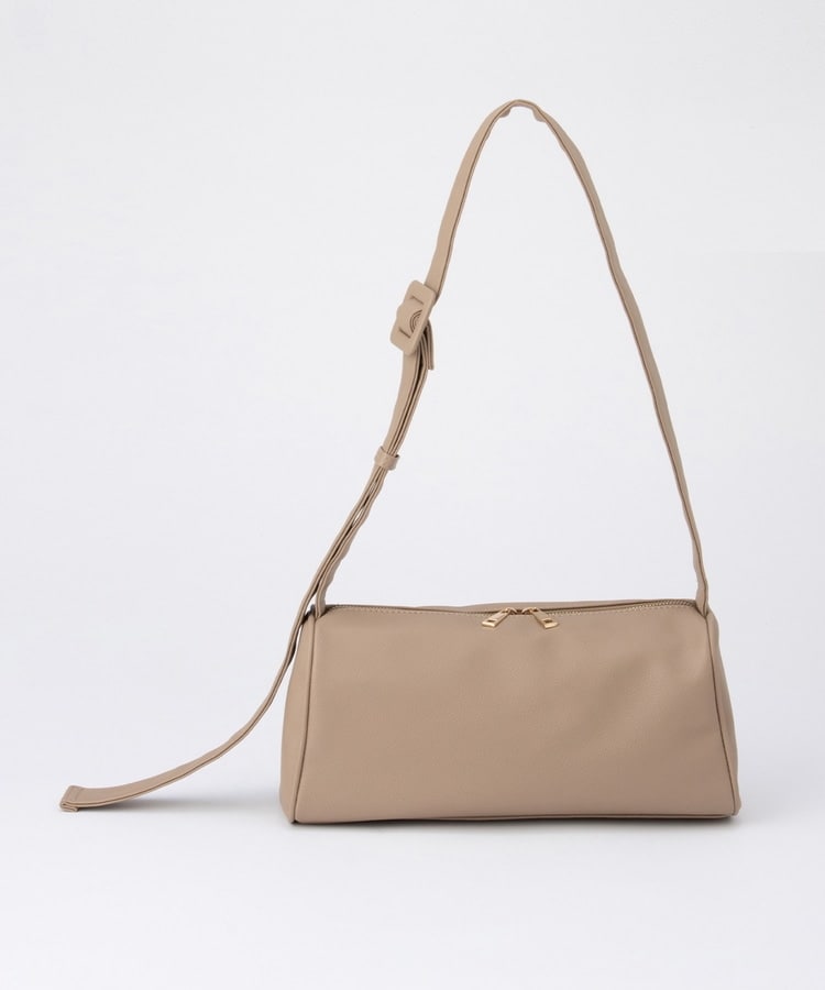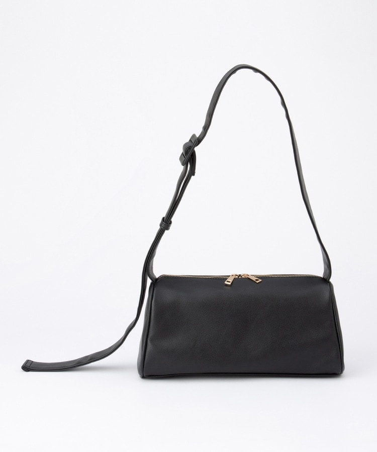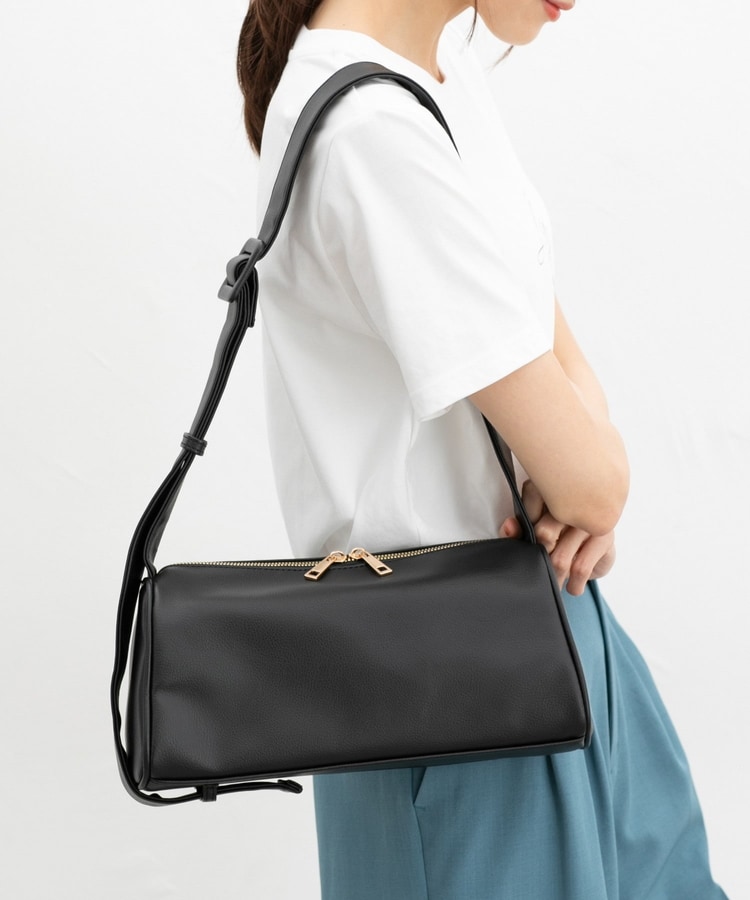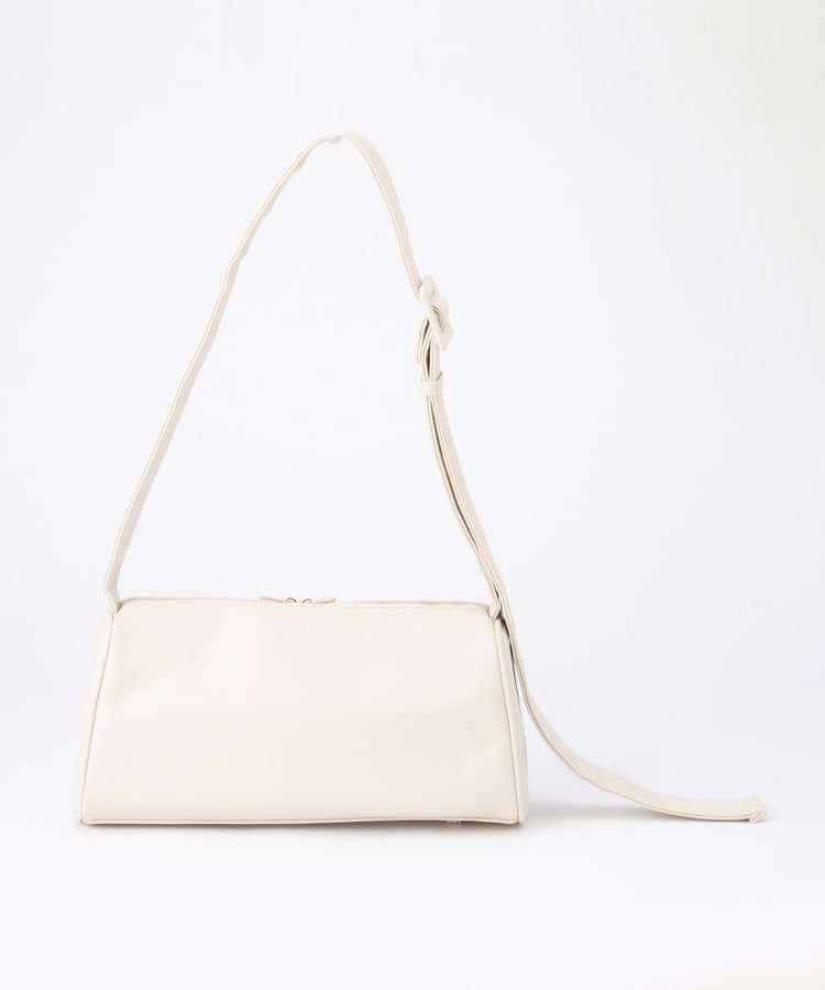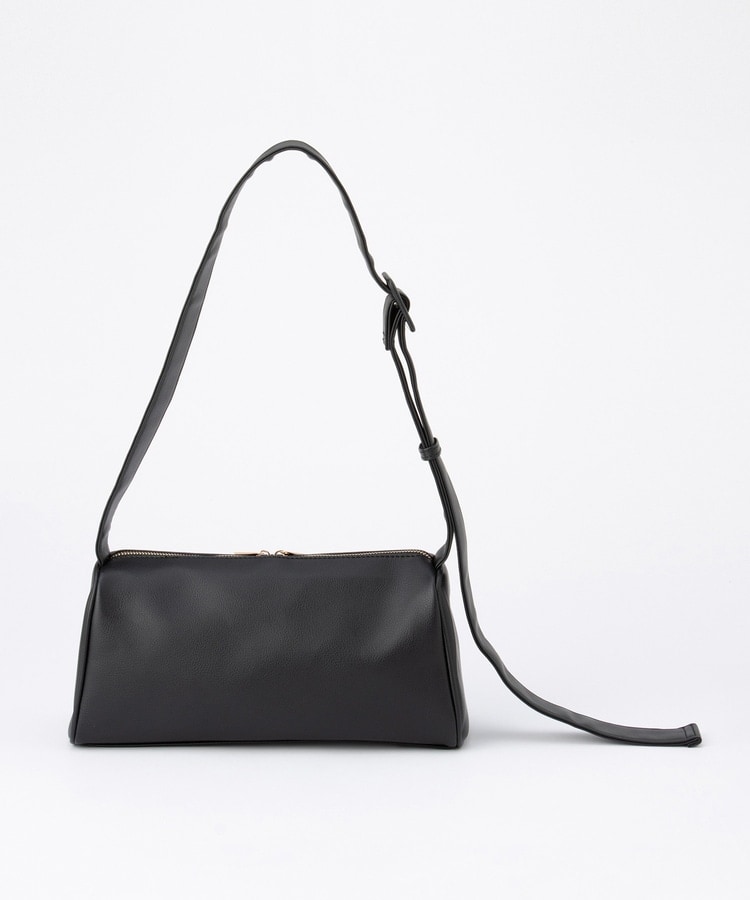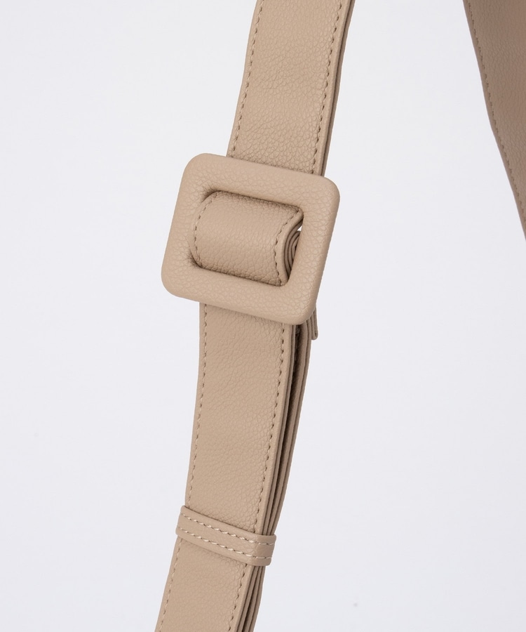 長さ調整可能なショルダーは、縮めたときに端を底面のループに通してすっきり収納可能。