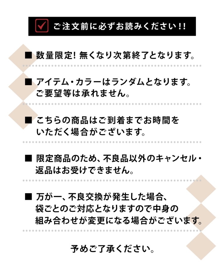 ■万が一、不良交換が発生した場合、袋ごとのご対応となりますので中身の組み合わせが変わってしまう場合がございます。アイテム・カラーはランダムとなりご要望等は承れません。
