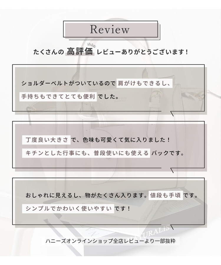 | サイズ | たて | よこ | まち幅(底部) | 持ち手高 | ショルダー | 重量(g) |
