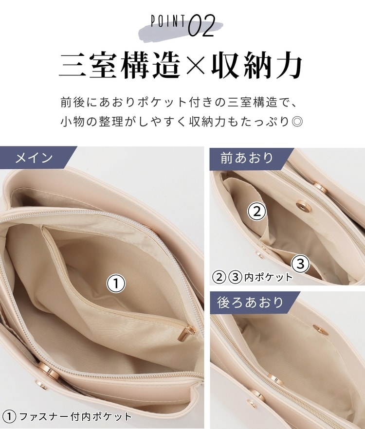 前後マグネット開閉のあおりポケット付きで、小物の整理もしやすく収納力もたっぷり。
