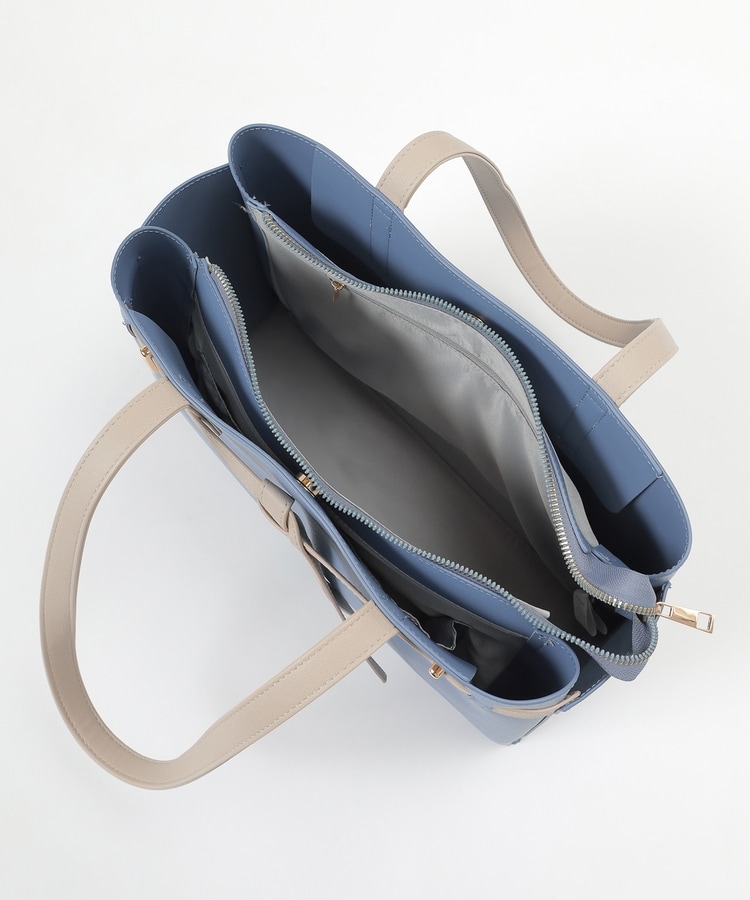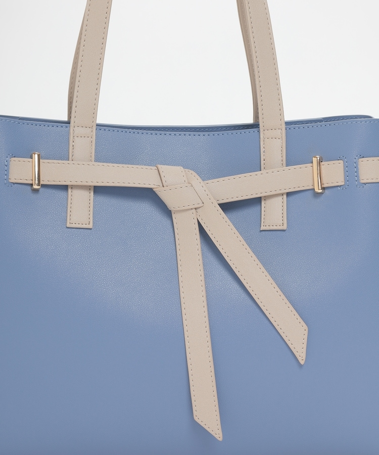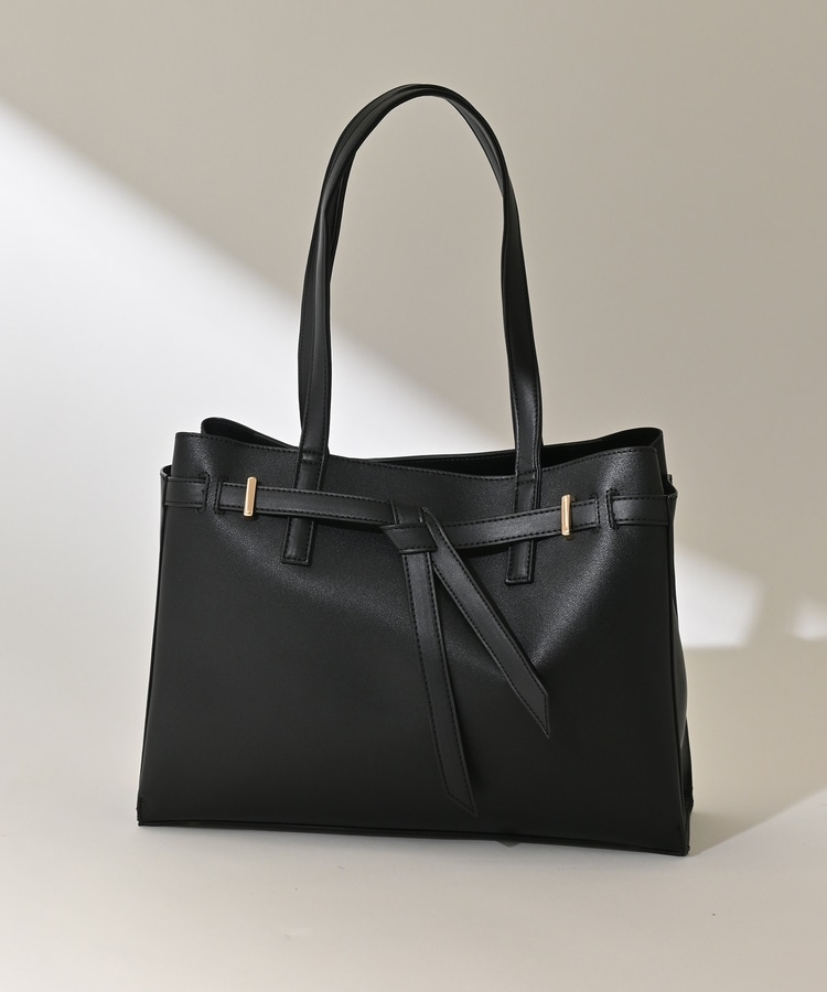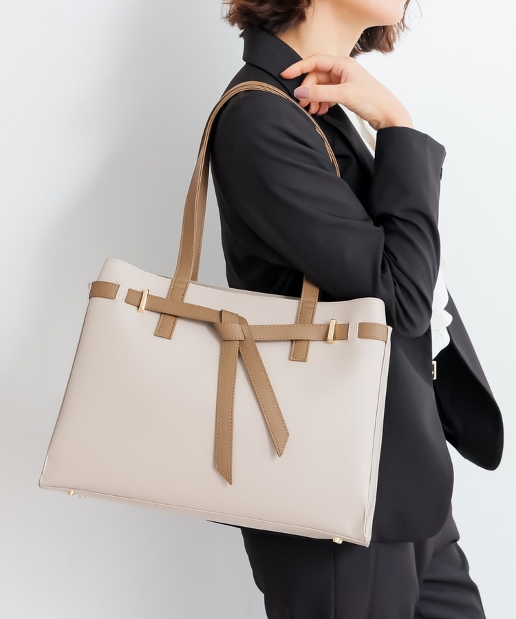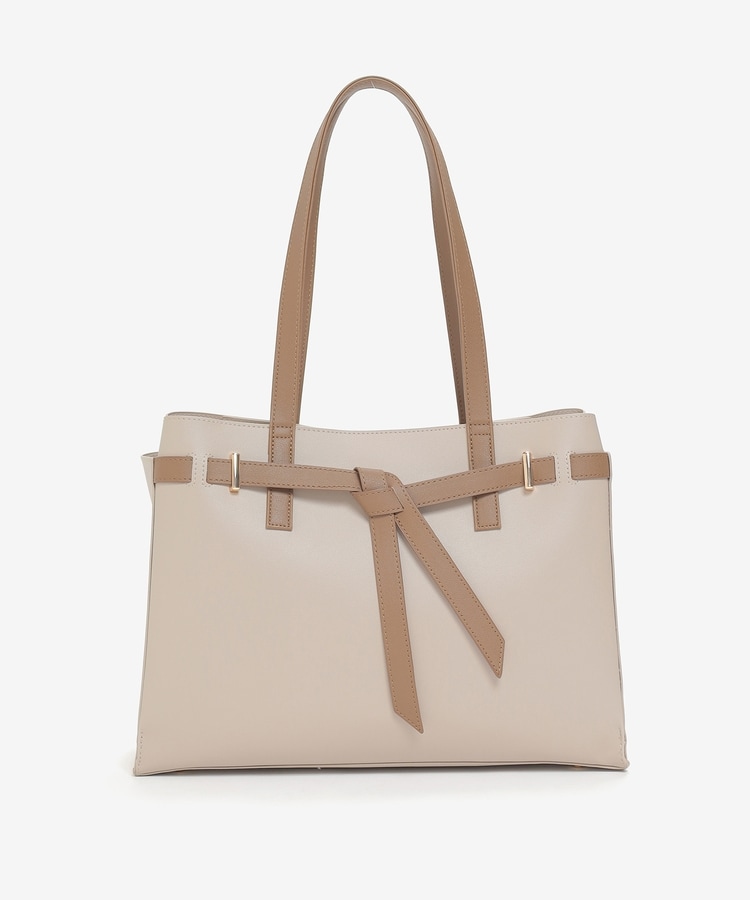 フロントのリボン風ベルト使いがおしゃれなデザイン。