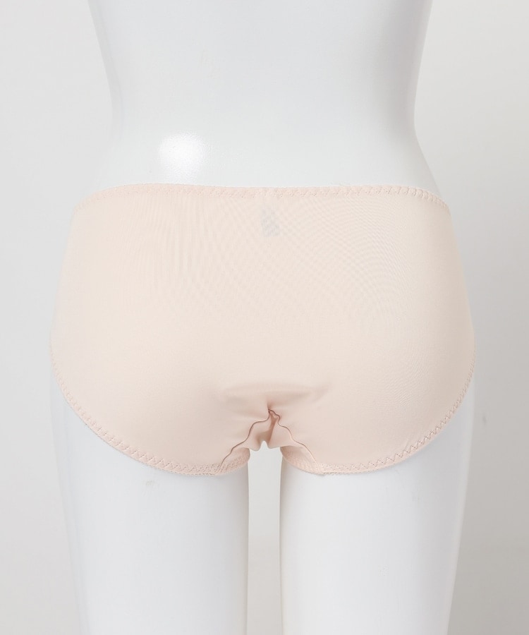 光沢感のあるフロントの花柄レースがフェミニンなショーツ。