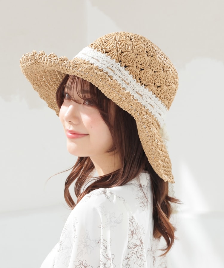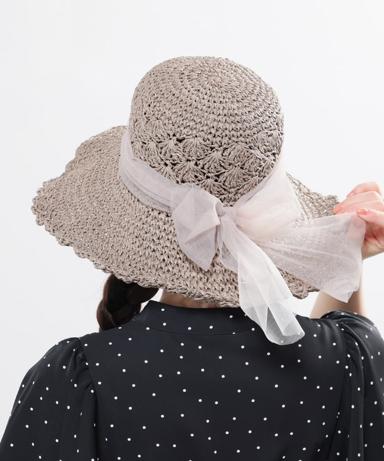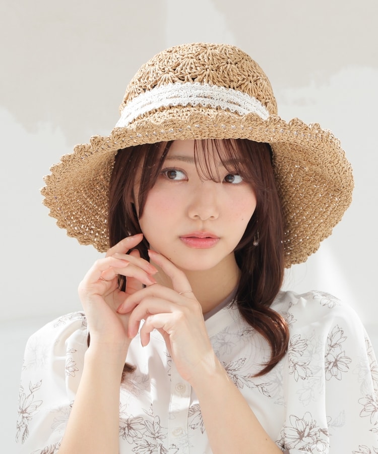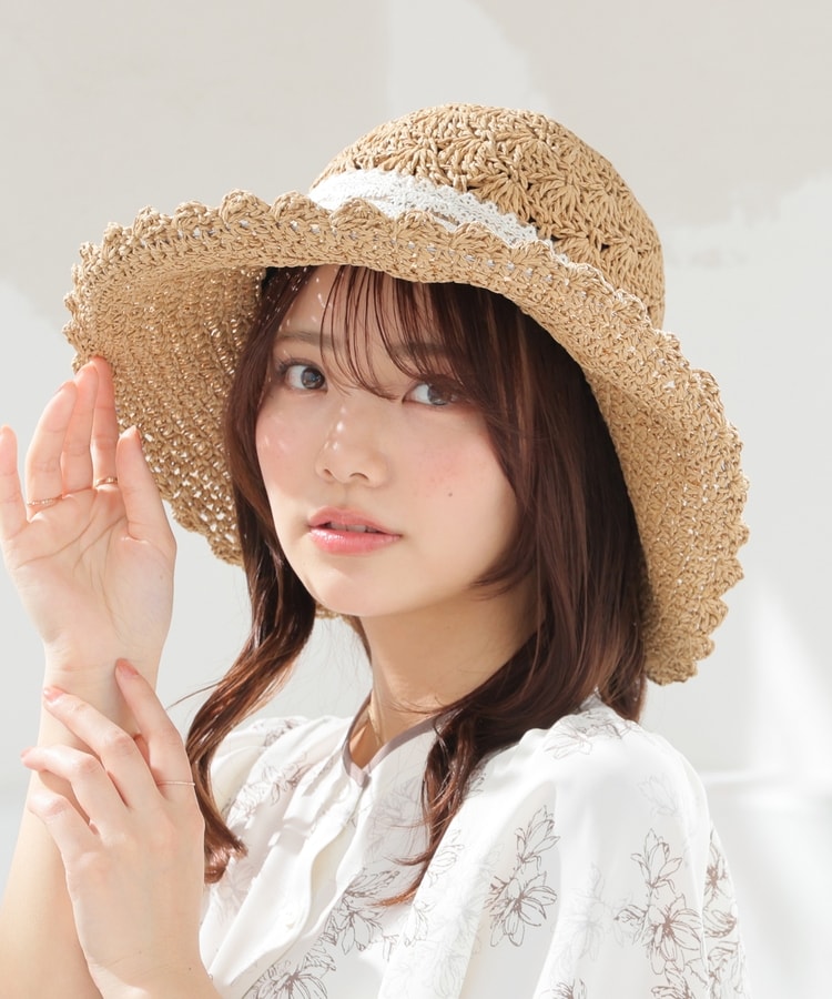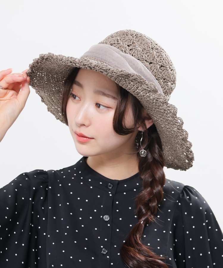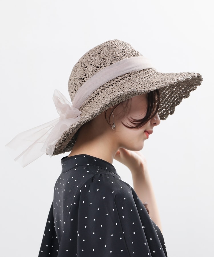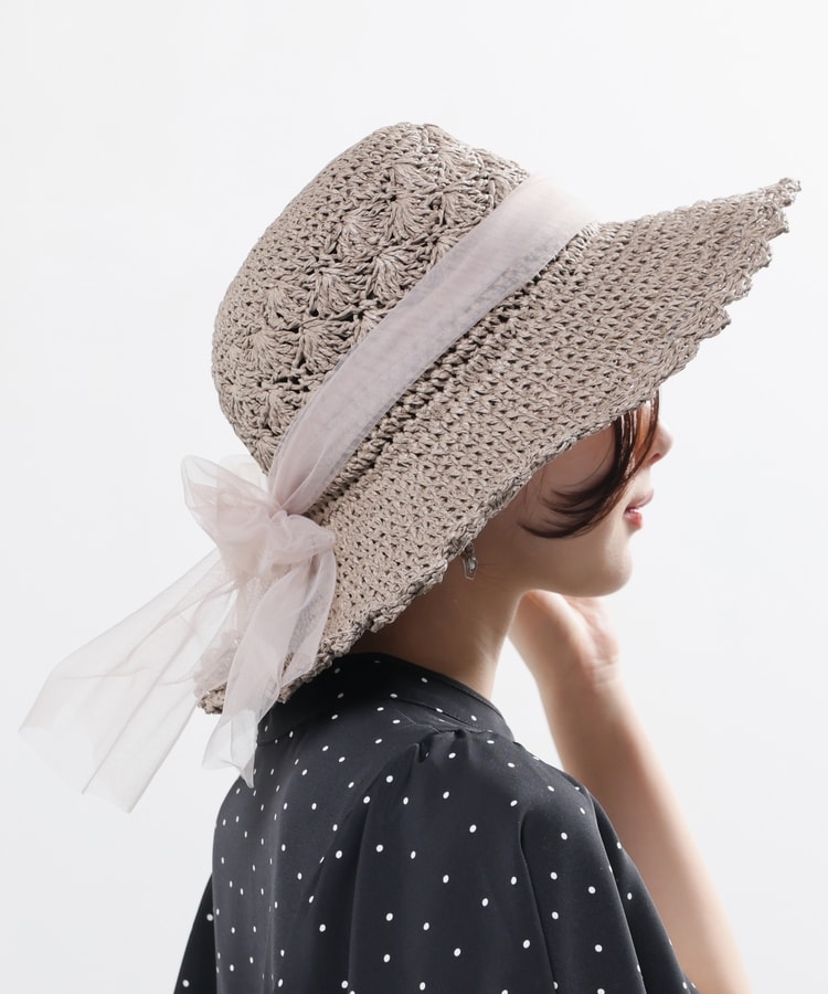 顔周りがすっぽり隠れる人気のつば広帽をガーリーにアップデート。