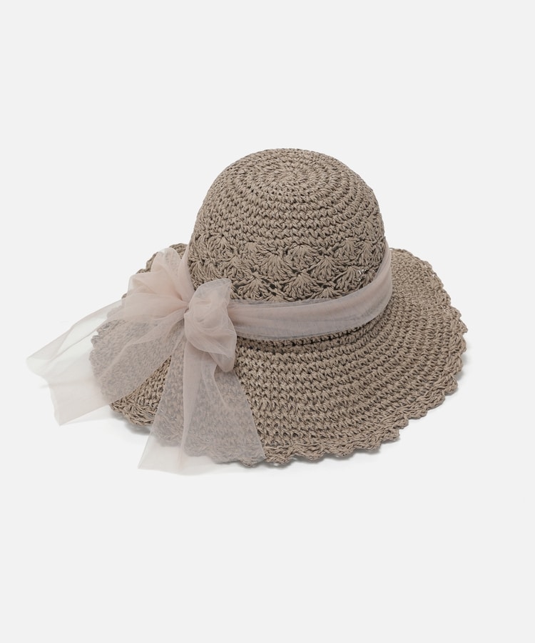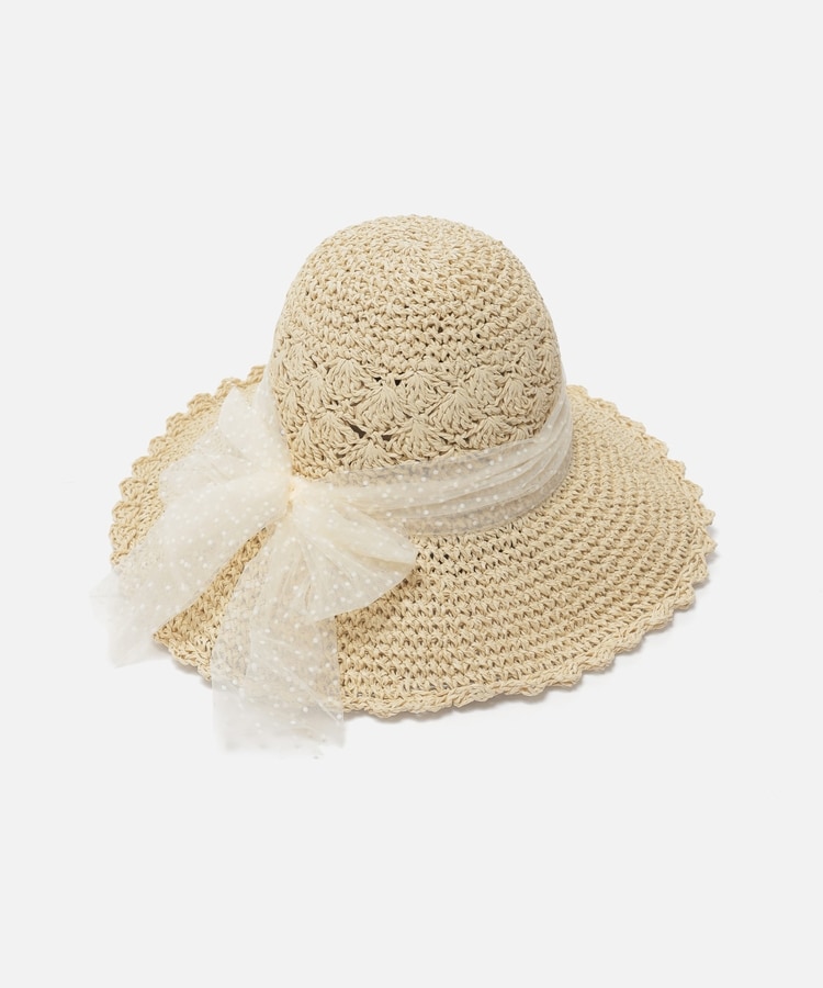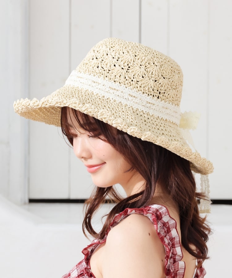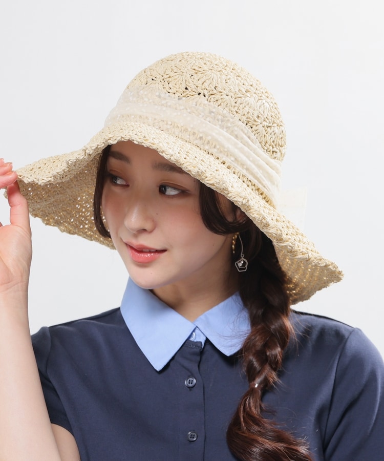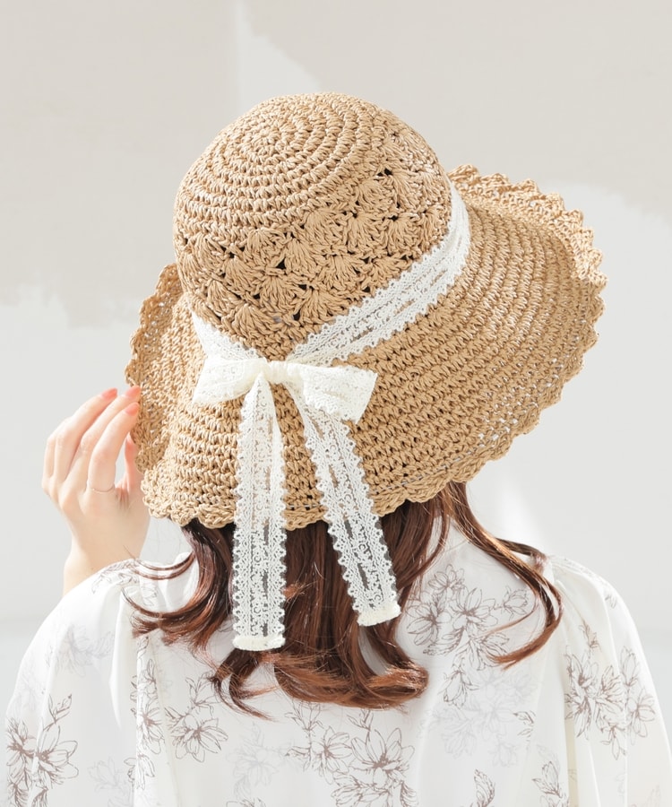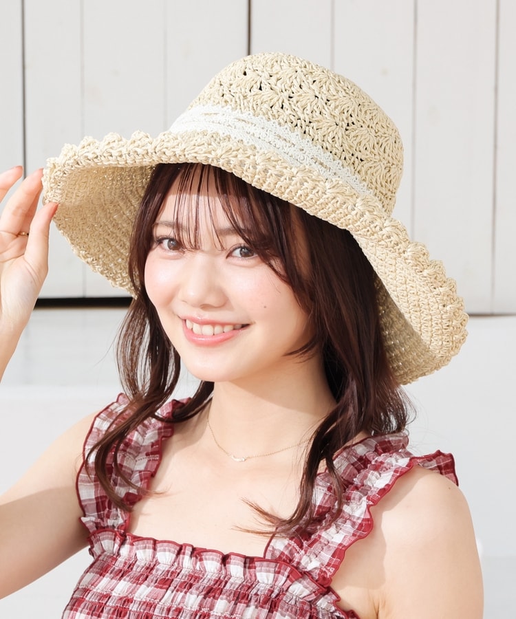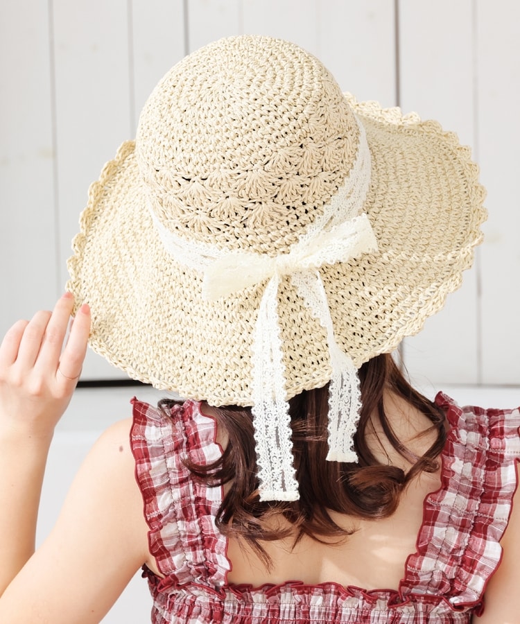 顔周りがすっぽり隠れる人気のつば広帽をガーリーにアップデート。