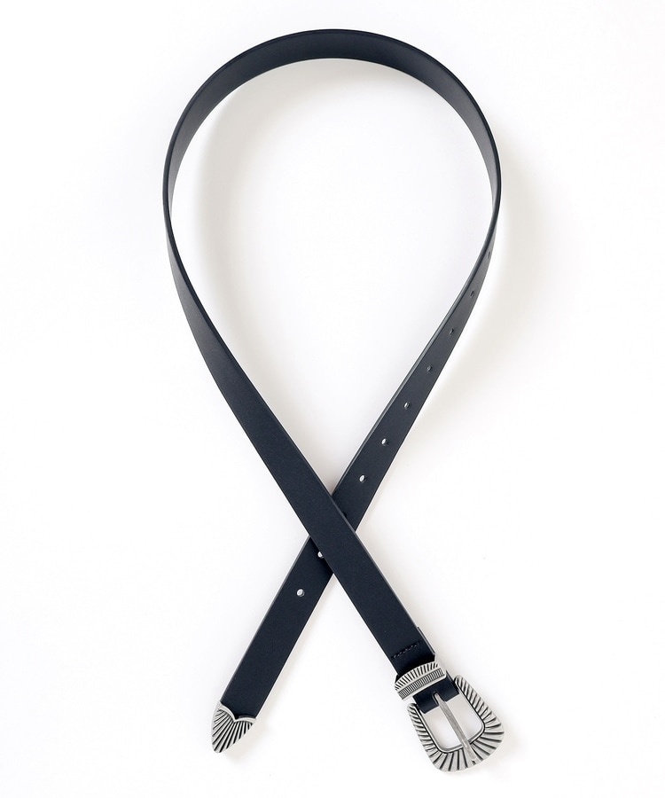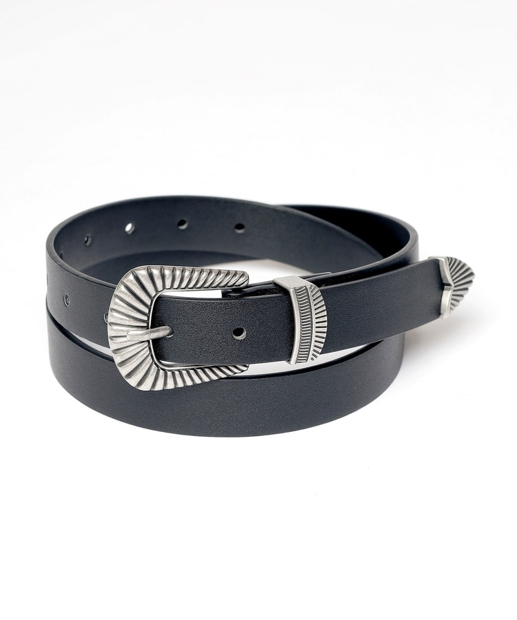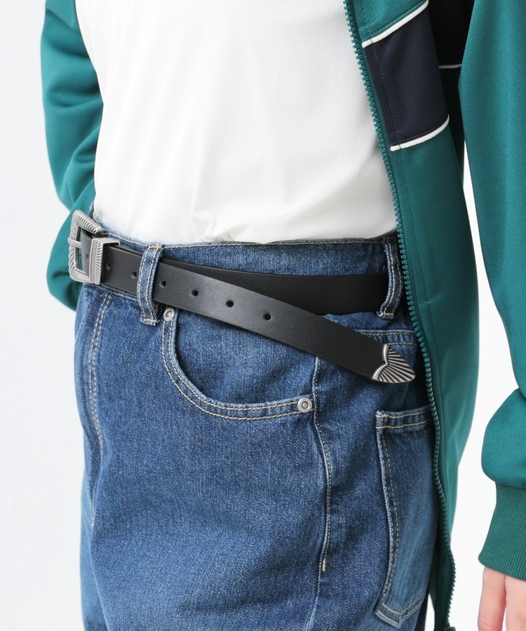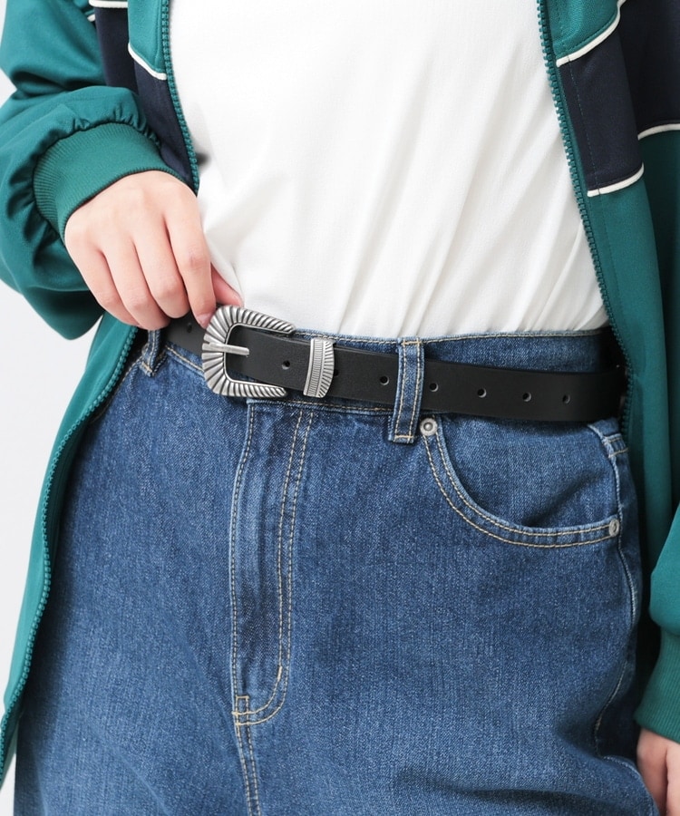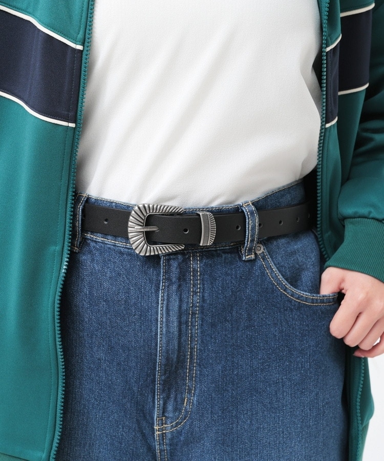 ウエスタン風の大きめバックルがコーデのアクセント。