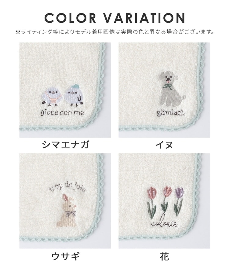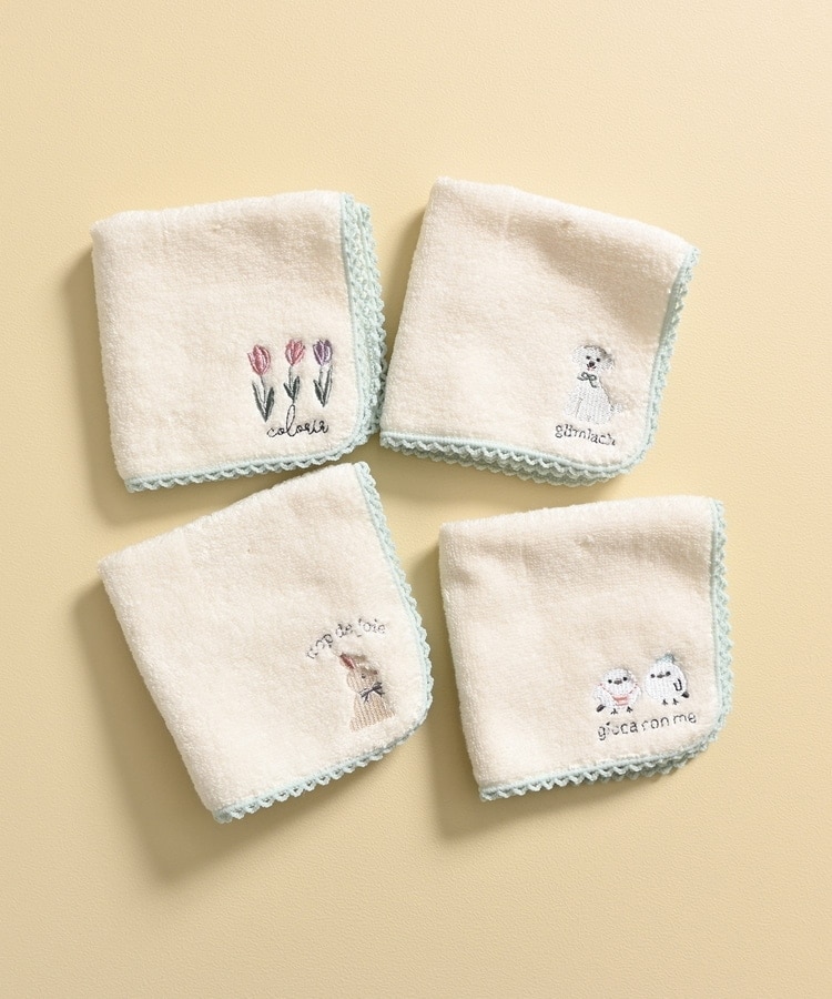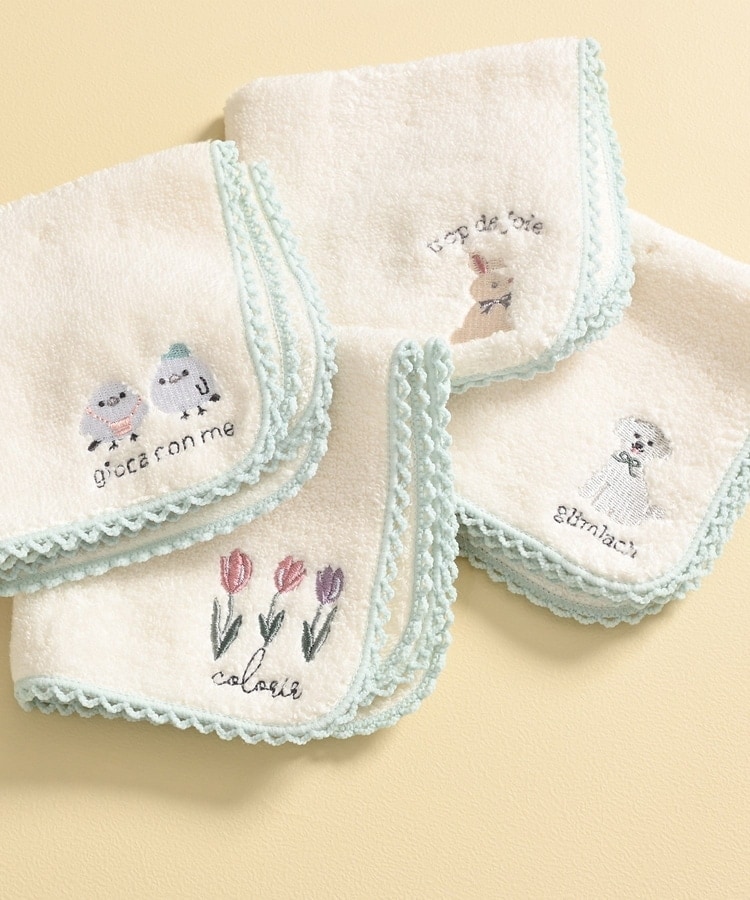 アニマルや花柄のキュートな刺繍とレースの縁取りがフェミニンなデザイン。