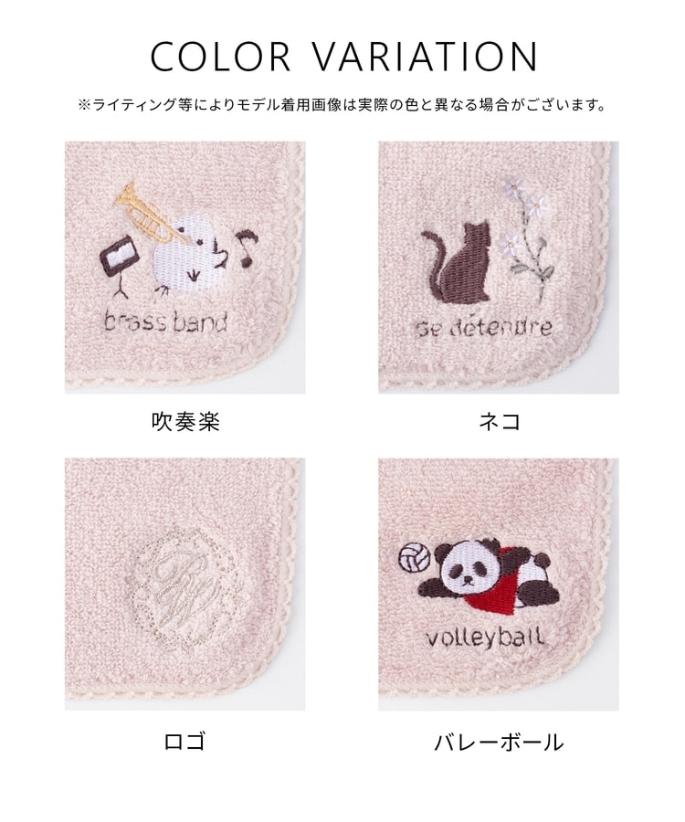アニマルやロゴなどのキュートな刺繍とレースの縁取りがフェミニンなデザイン。