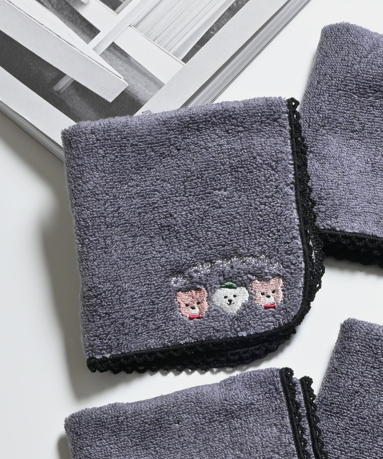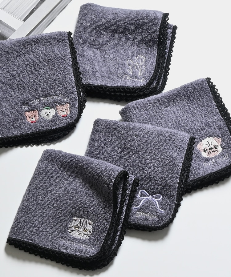 アニマルやリボンなどのキュートな刺繍とレースの縁取りがフェミニンなデザイン。