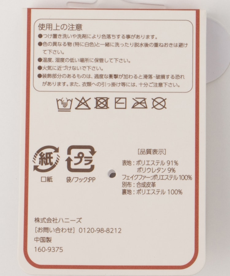 ●品質/表地 ポリエステル 91%・ポリウレタン 9%・フェイクファー ポリエステル 100%・別布 合成皮革・裏地 ポリエステル 100%